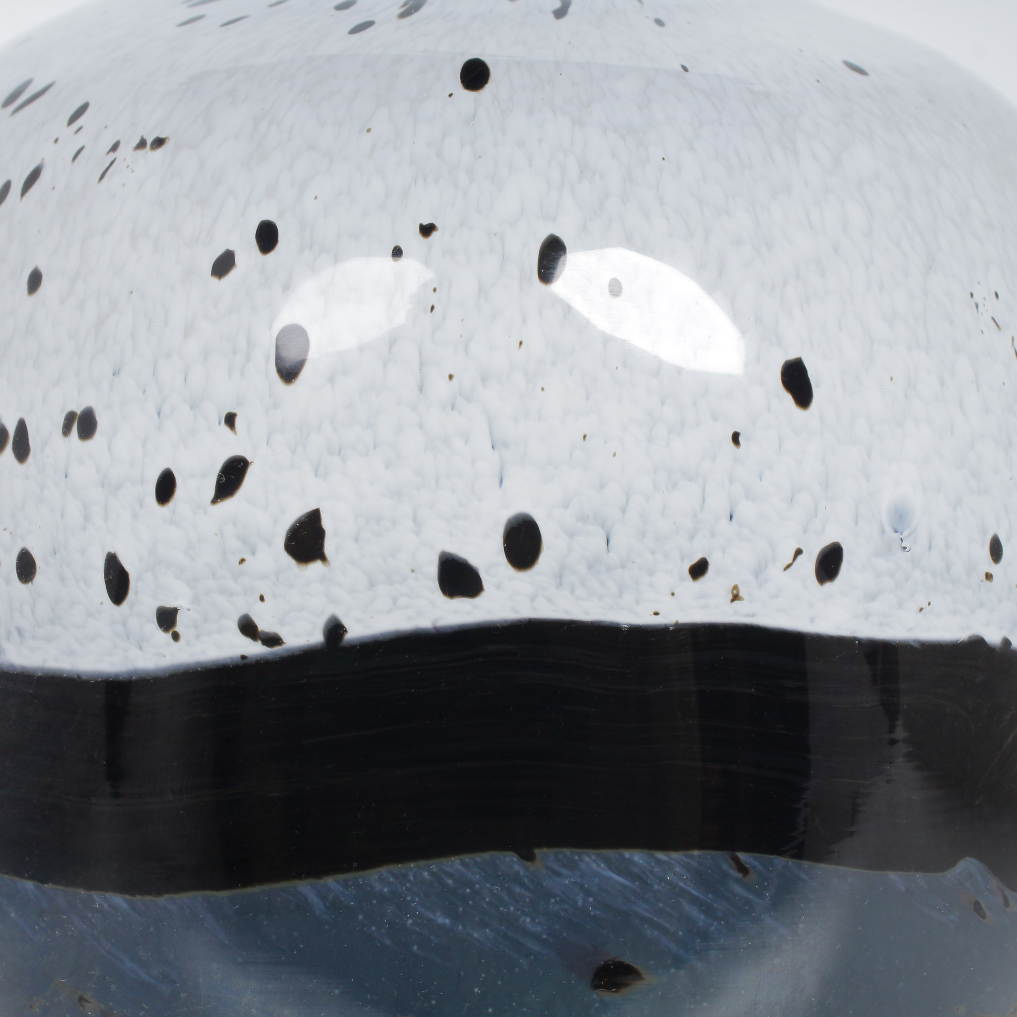 Florero en tonos blanco y gris oscuro con listón negro, tamaño chico. Su diseño sofisticado y moderno aporta un toque de elegancia discreta a cualquier espacio. Ideal para pequeños arreglos o como pieza decorativa.
