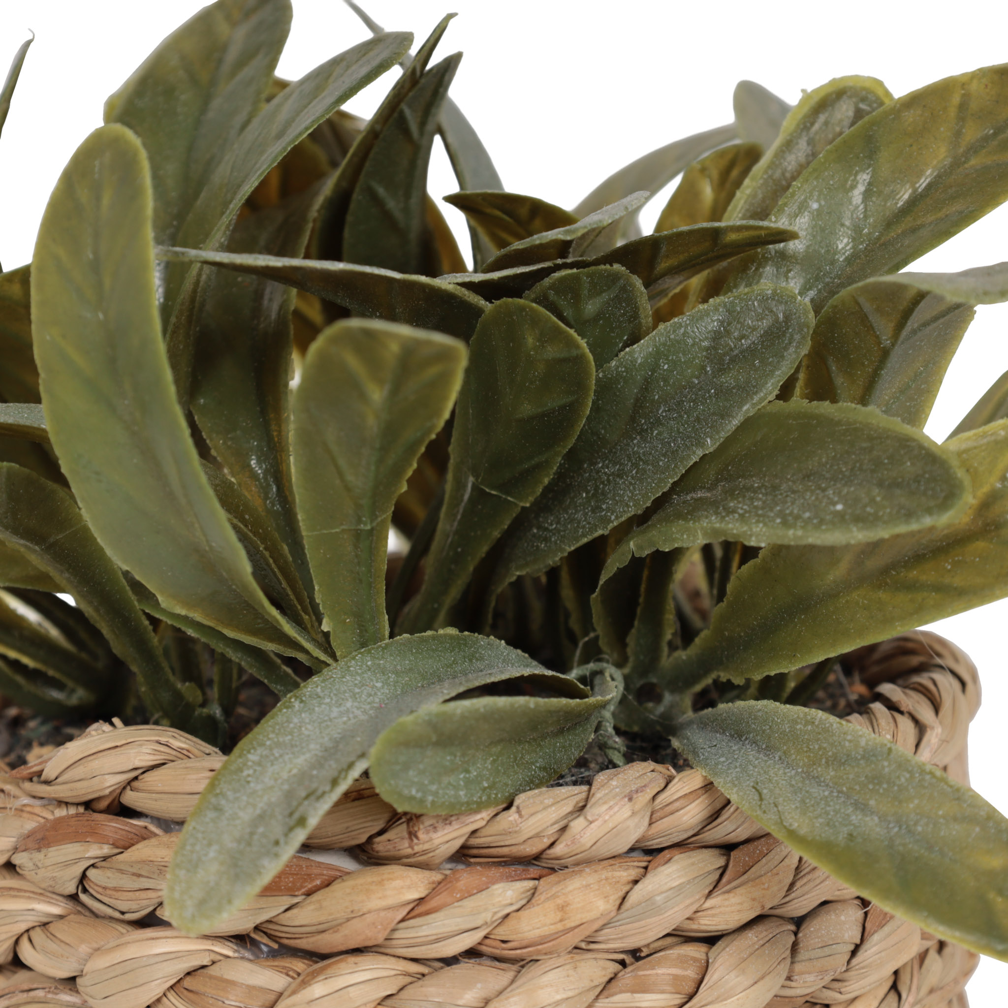 Planta artificial decorativa verde con pote de cuerdas.
