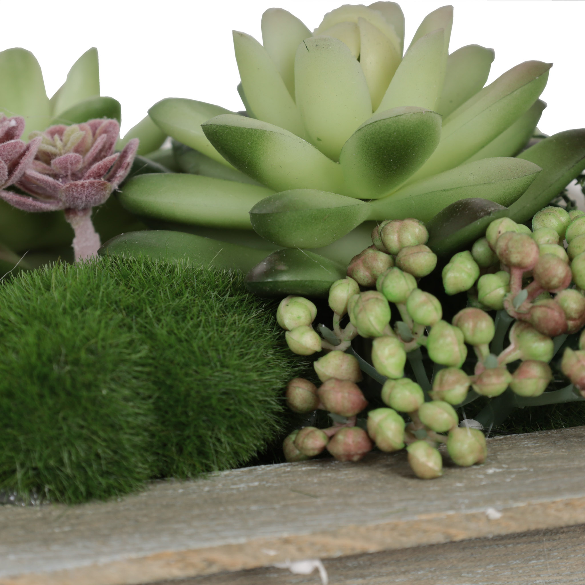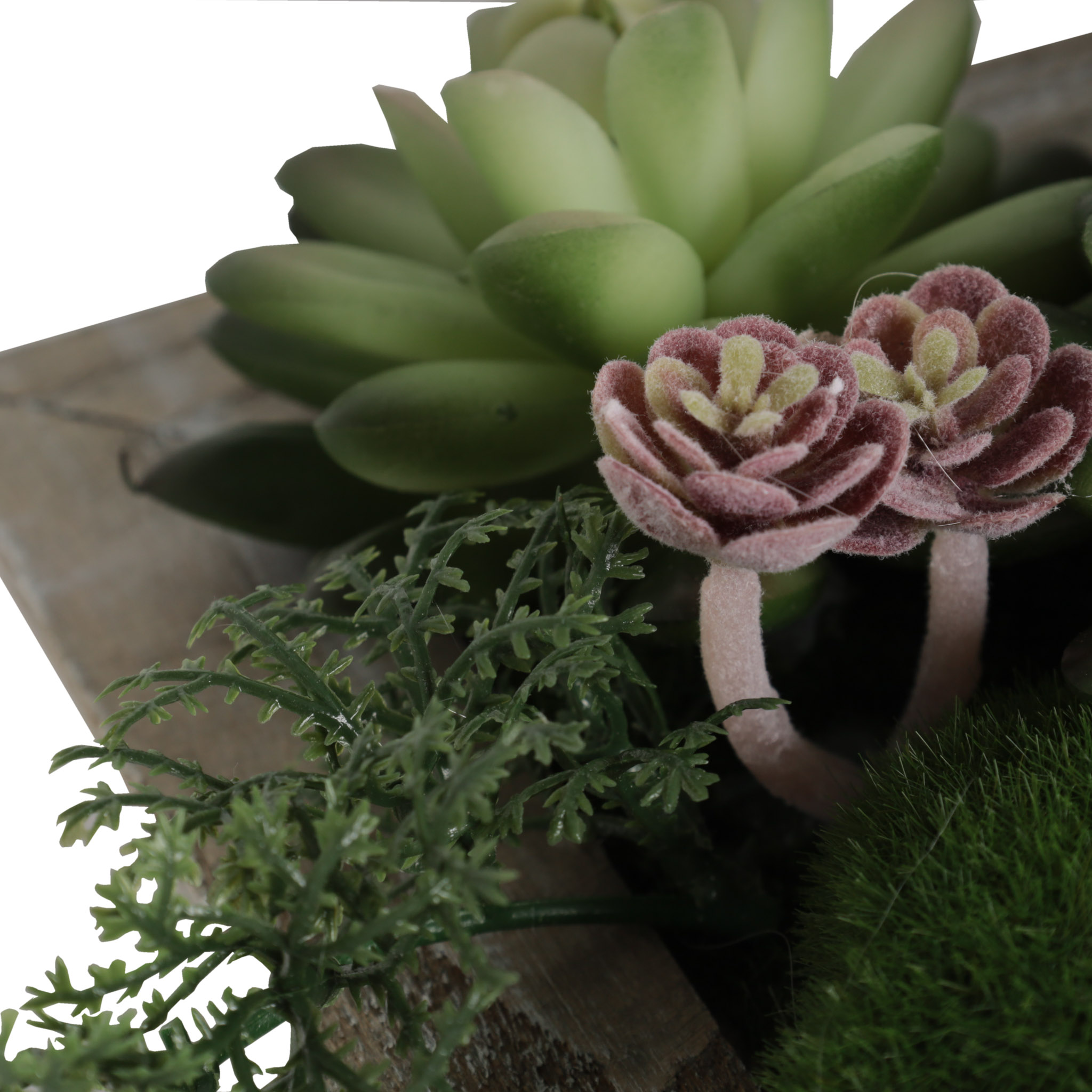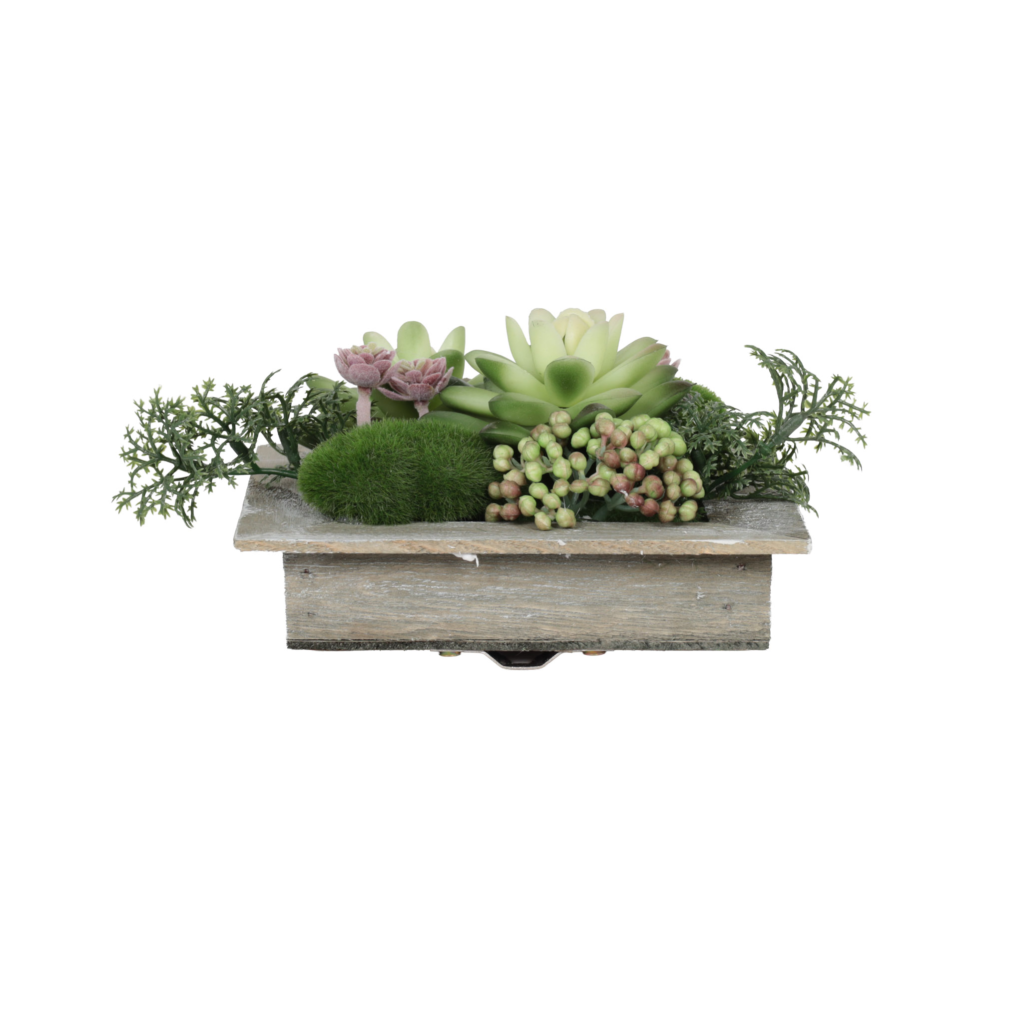 Planta artificial decorativa verde para pared, con pote de madera.