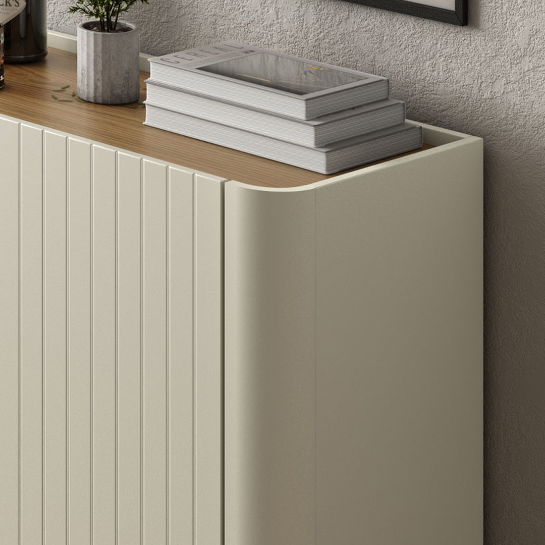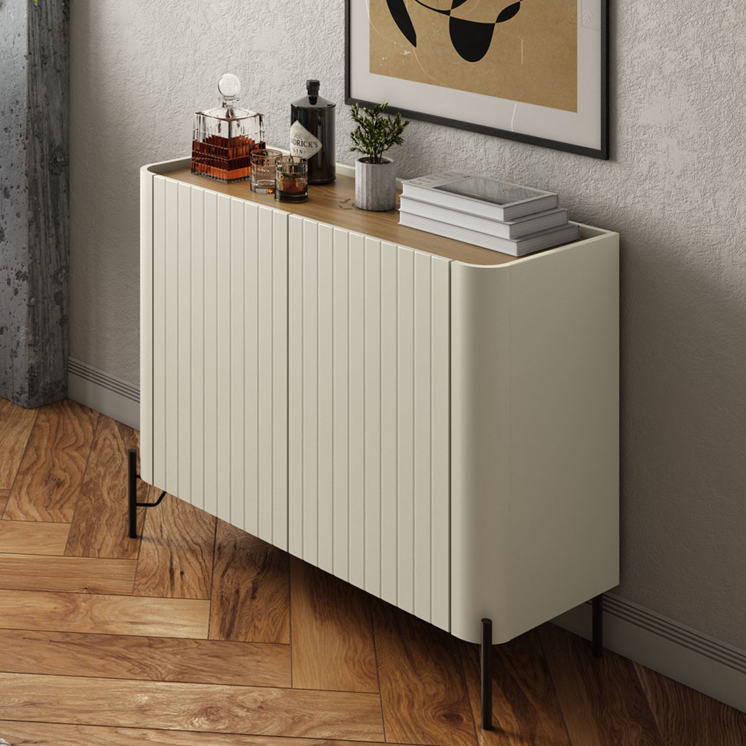 Bufetera con acabado en madera off white y natural, puertas brise y patas de metal negro. Esta bufetera ofrece un diseño elegante y moderno que complementará tu comedor o sala de estar. Ideal para almacenar vajillas, utensilios de cocina u otros objetos, mientras añade un toque de estilo a tu espacio.