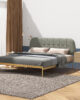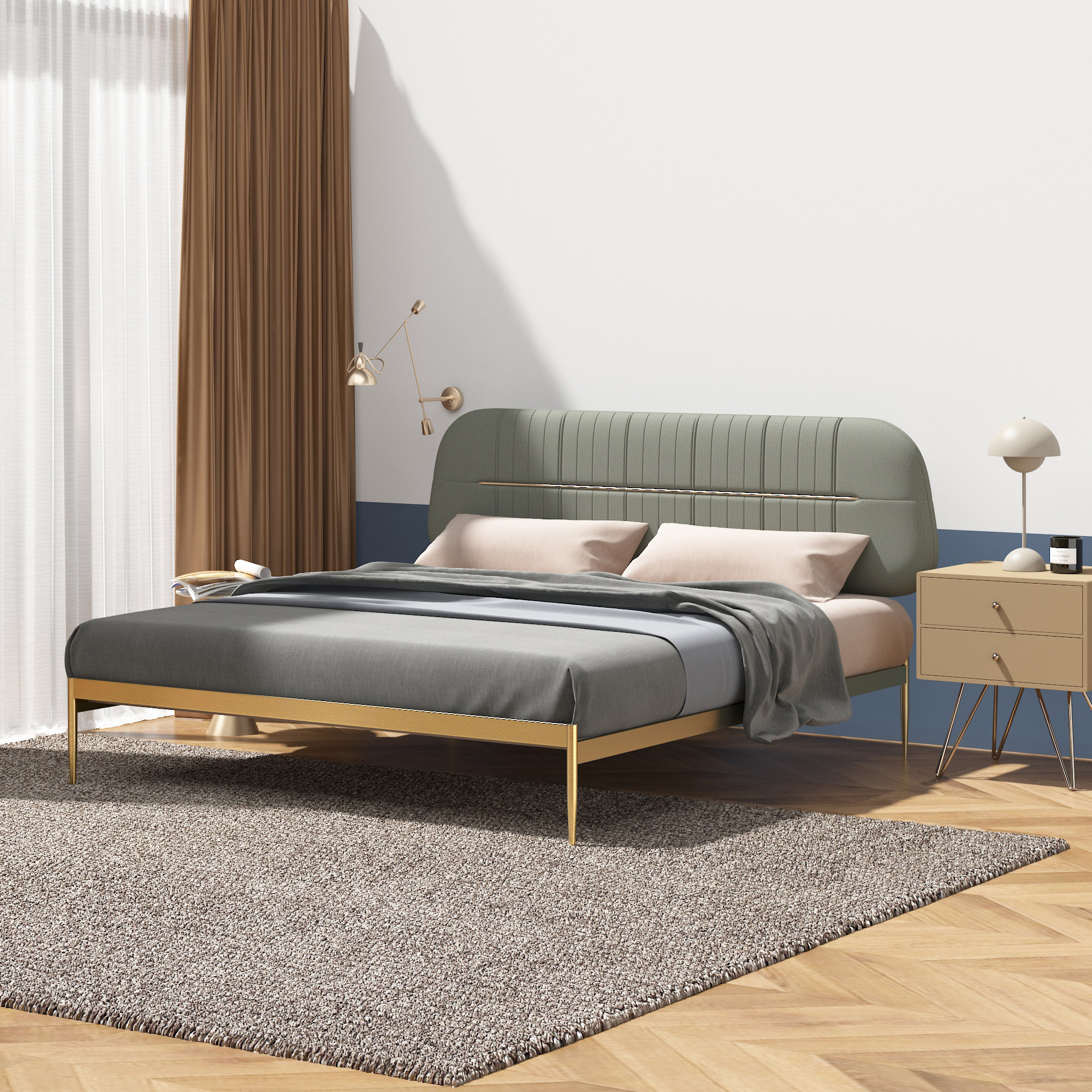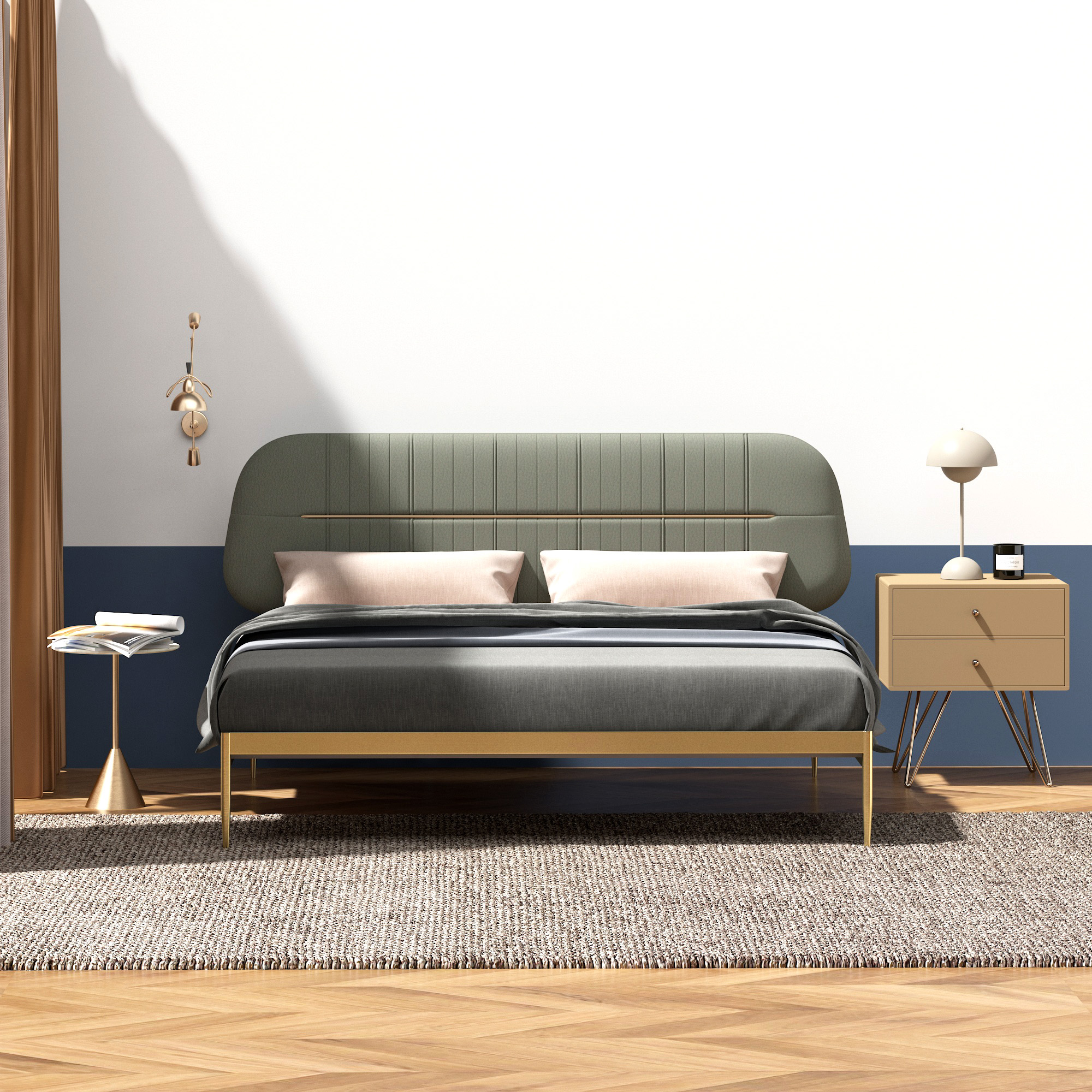 Descansa en estilo y comodidad con nuestra cama queen de cuero en un elegante color gris verdoso, realzada con patas de metal en un tono bronce que añaden un toque de sofisticación. Esta cama combina la elegancia del cuero con la resistencia del metal, creando un punto focal impresionante para tu dormitorio. Con un diseño moderno y atemporal, esta cama es perfecta para crear un ambiente acogedor y elegante en tu espacio personal.