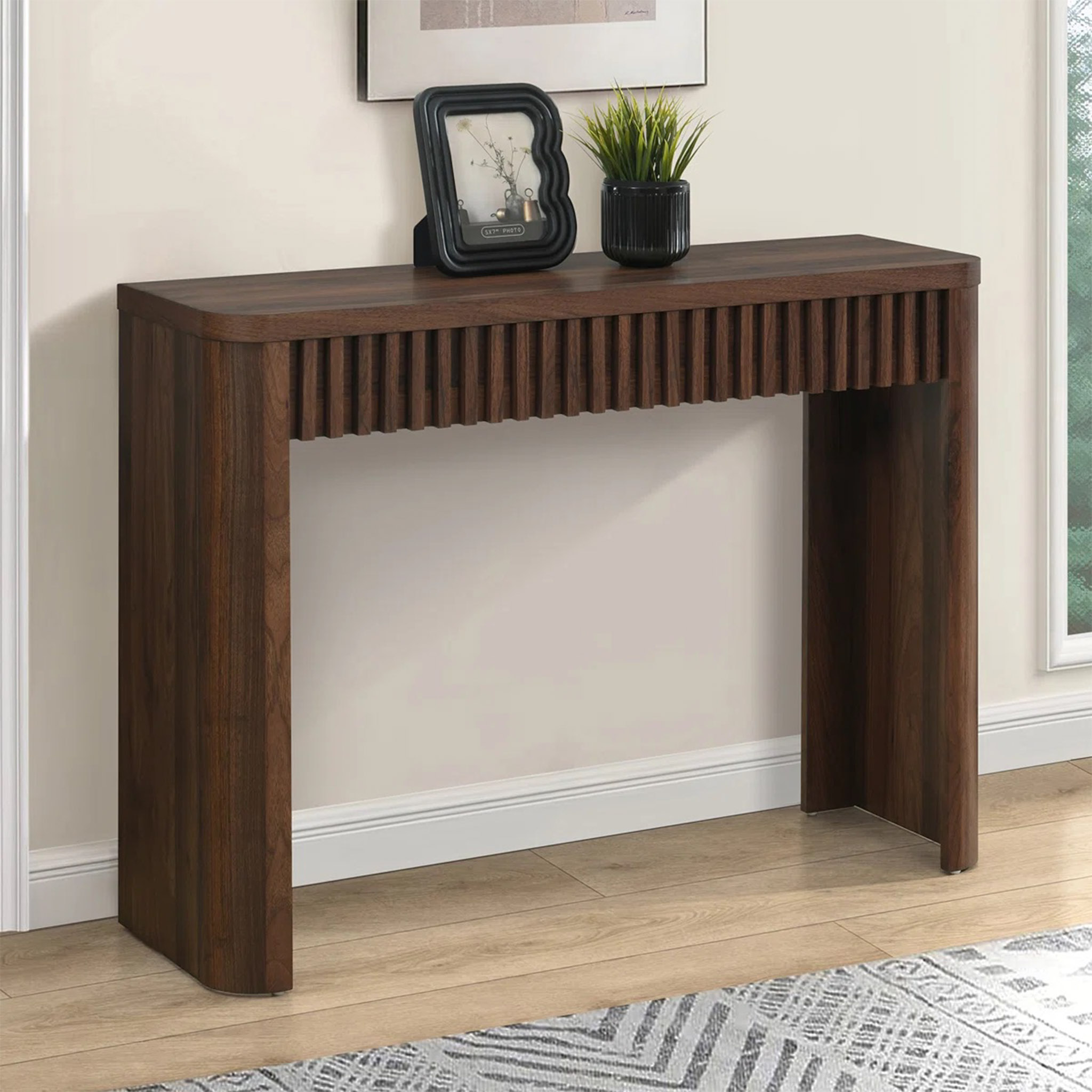 La consola Irwin es una pieza que destaca por su estética sobria y contemporánea. Fabricada en madera con acabado chocolate oscuro, su diseño limpio y lineal la convierte en una opción sofisticada para recibidores, salas o espacios de transición. Ideal para complementar decoraciones modernas, su tonalidad profunda aporta calidez y elegancia al ambiente, funcionando tanto como acento decorativo como superficie funcional.
