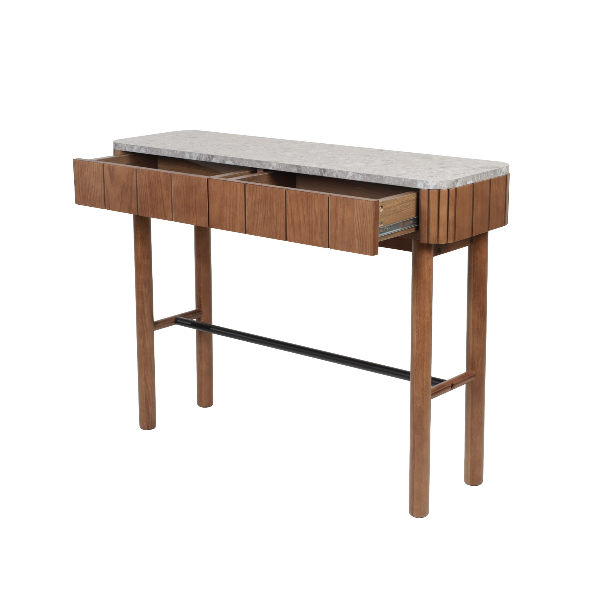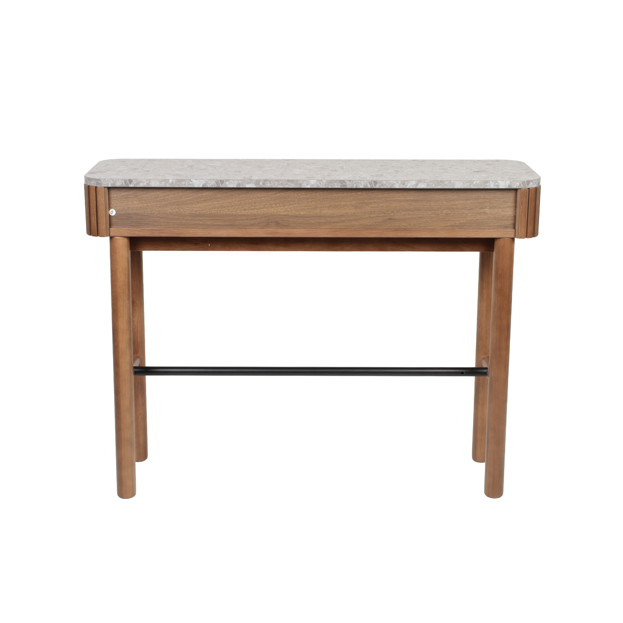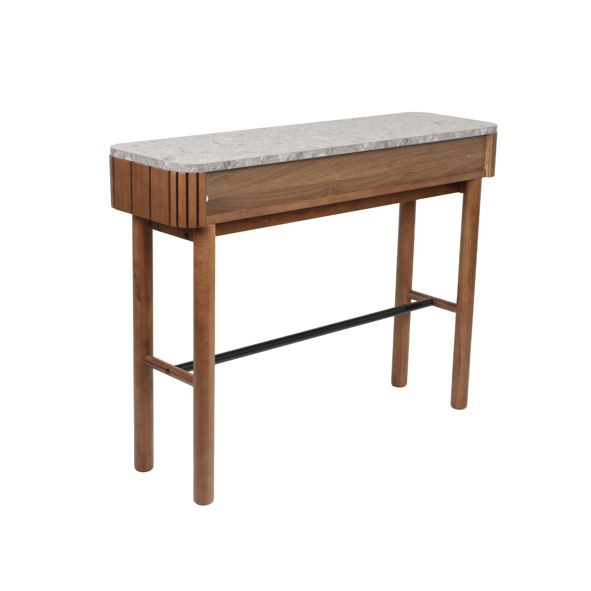 Calidez y sofisticación. Su estructura de madera MDF veneer en acabado almendra se combina con un sobre de terrazo y melamina para crear una pieza que une lo clásico con lo moderno.