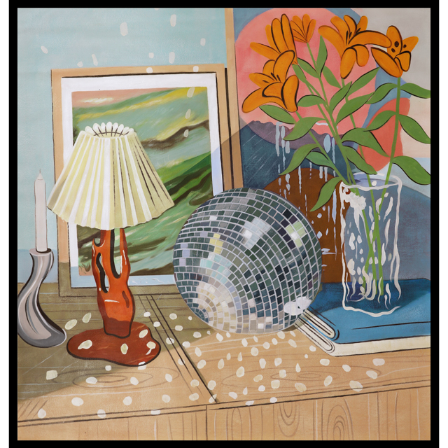 Cuadro vertical de óleo con mesa, disco ball y adornos, enmarcado en negro. Un diseño elegante y vibrante que aporta un toque sofisticado y dinámico a cualquier espacio.