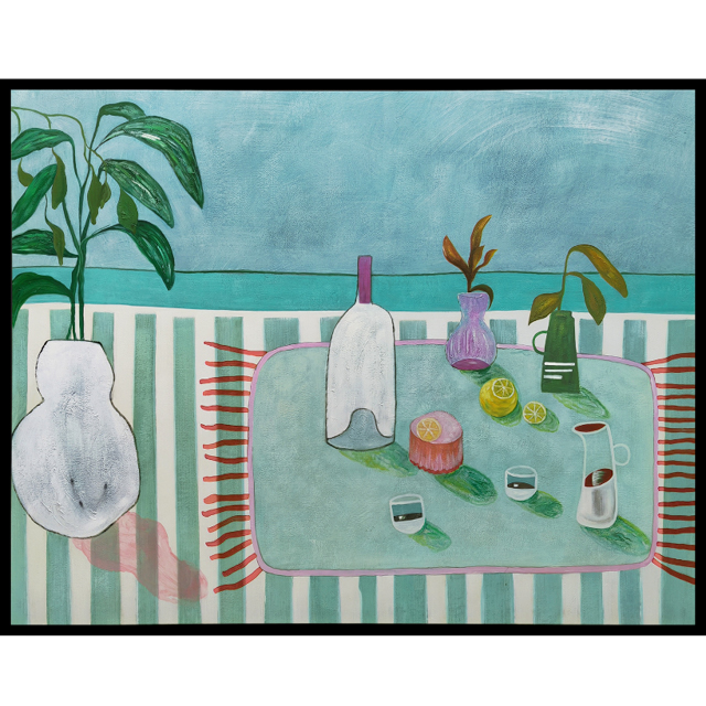 Cuadro horizontal de óleo con tapete, jarrones con plantas y botella con vasos, enmarcado en negro. Un diseño elegante y acogedor que añade un toque de estilo y frescura a cualquier espacio.