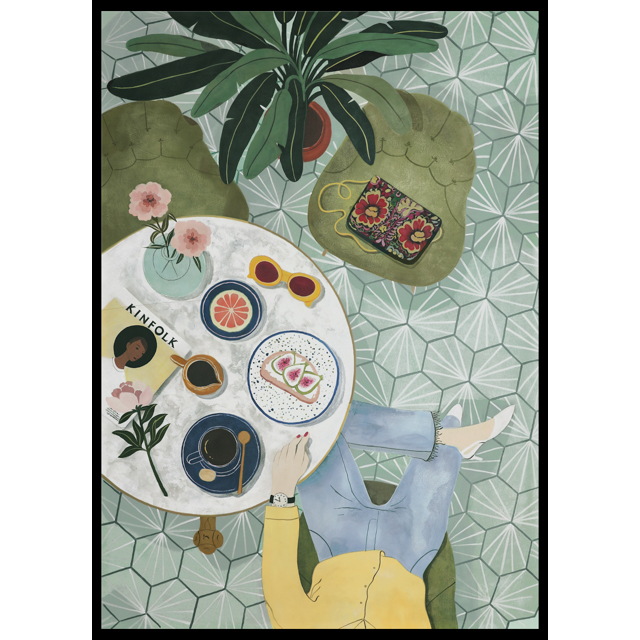 Un hermoso óleo que retrata una mesa redonda con desayuno y una mujer sentada, evocando calma y sofisticación. Enmarcado en negro para un acabado elegante.