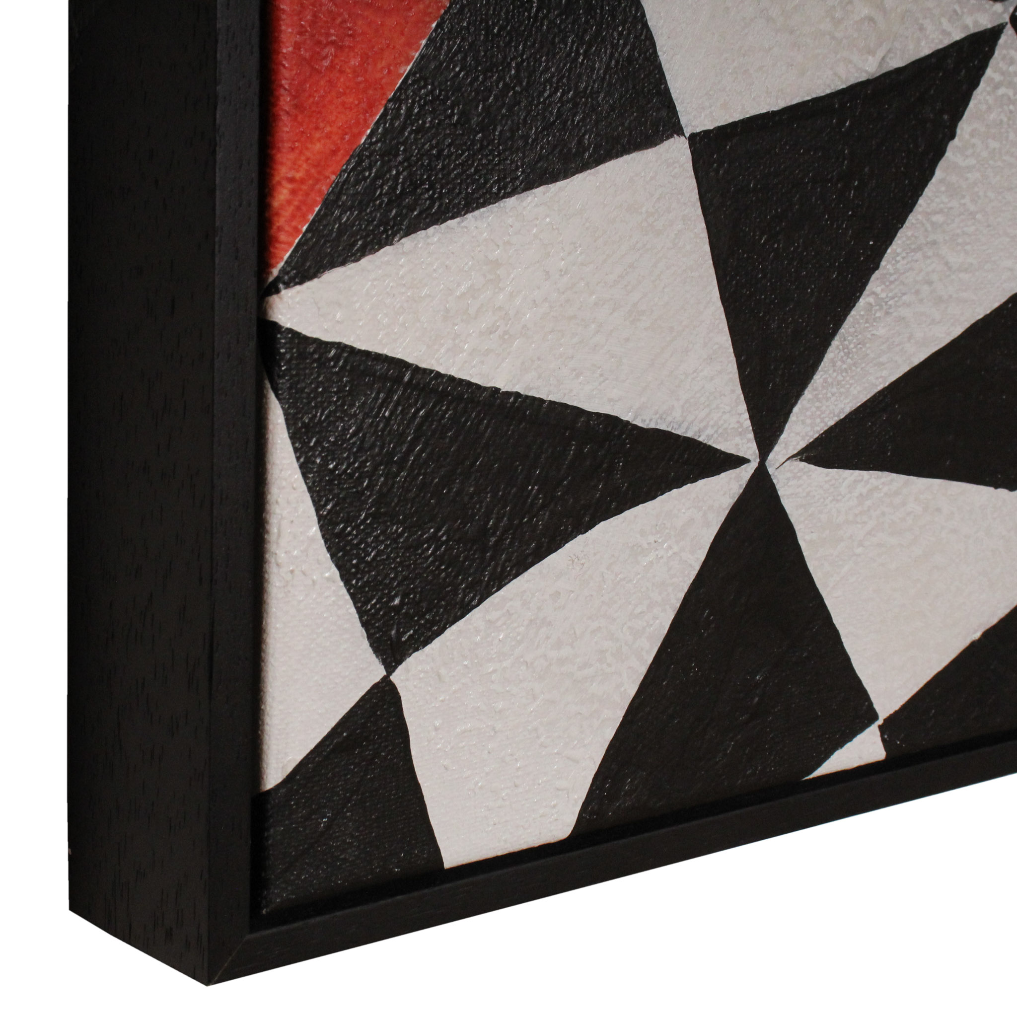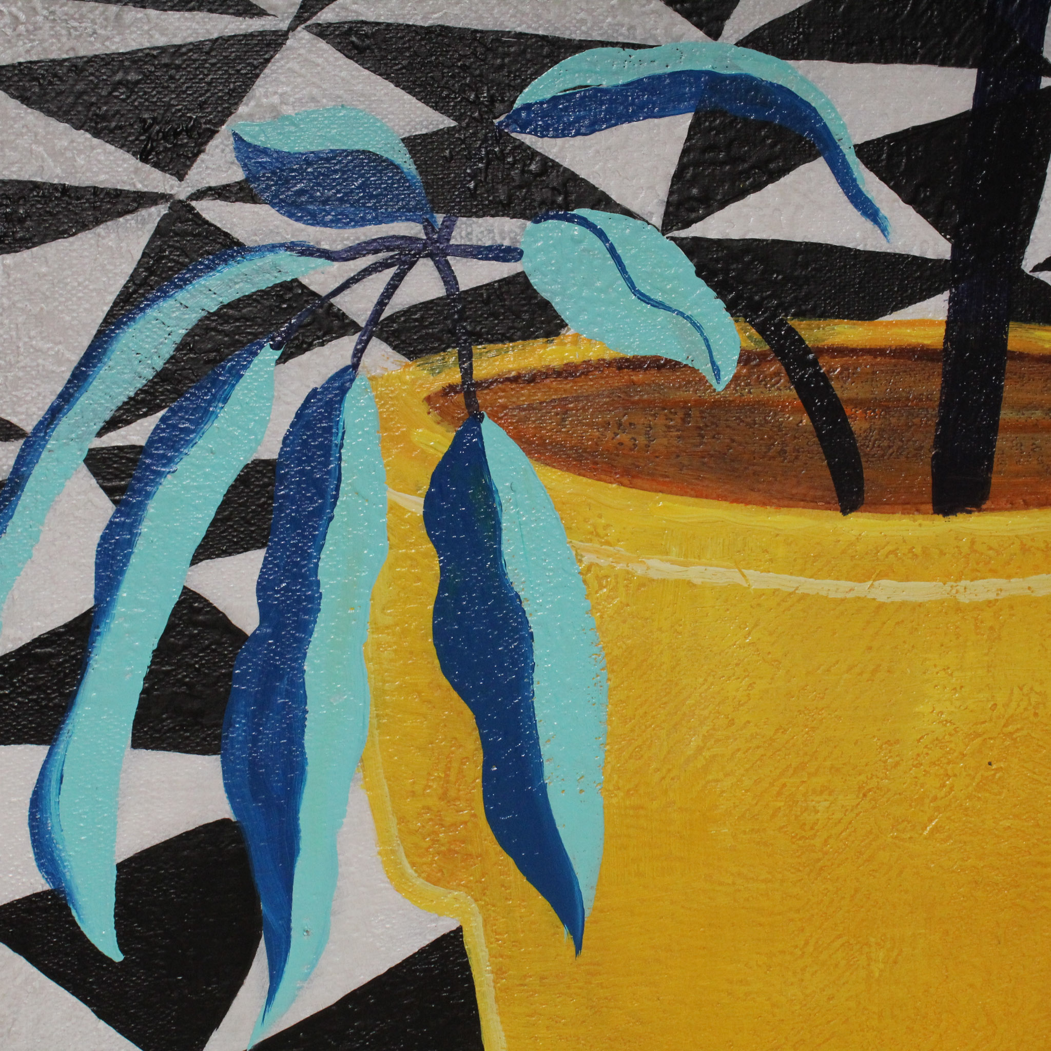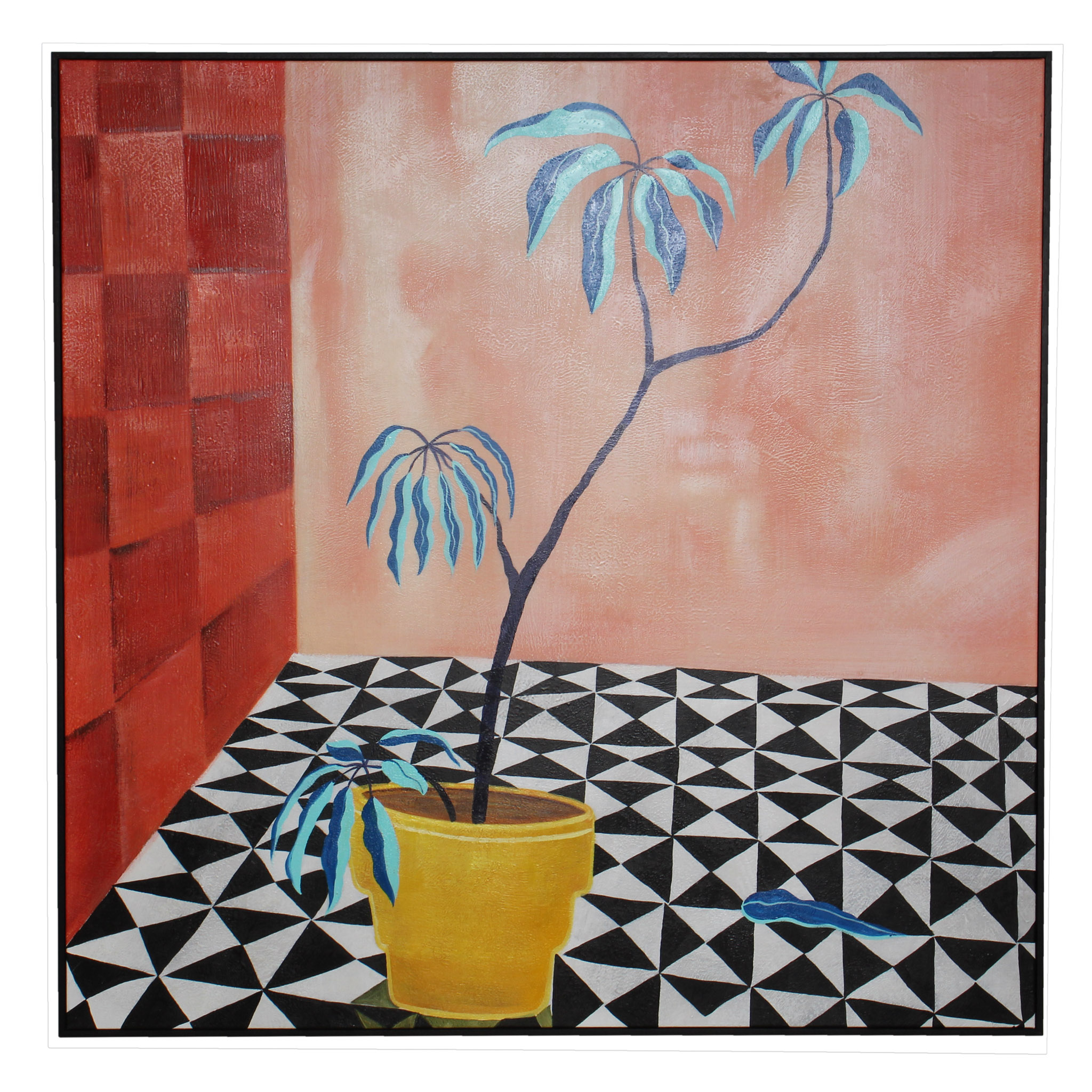 Cuadro de óleo con pote amarillo, planta azul y piso blanco y negro, enmarcado en negro. Un diseño moderno y fresco que aporta color y estilo a cualquier espacio.