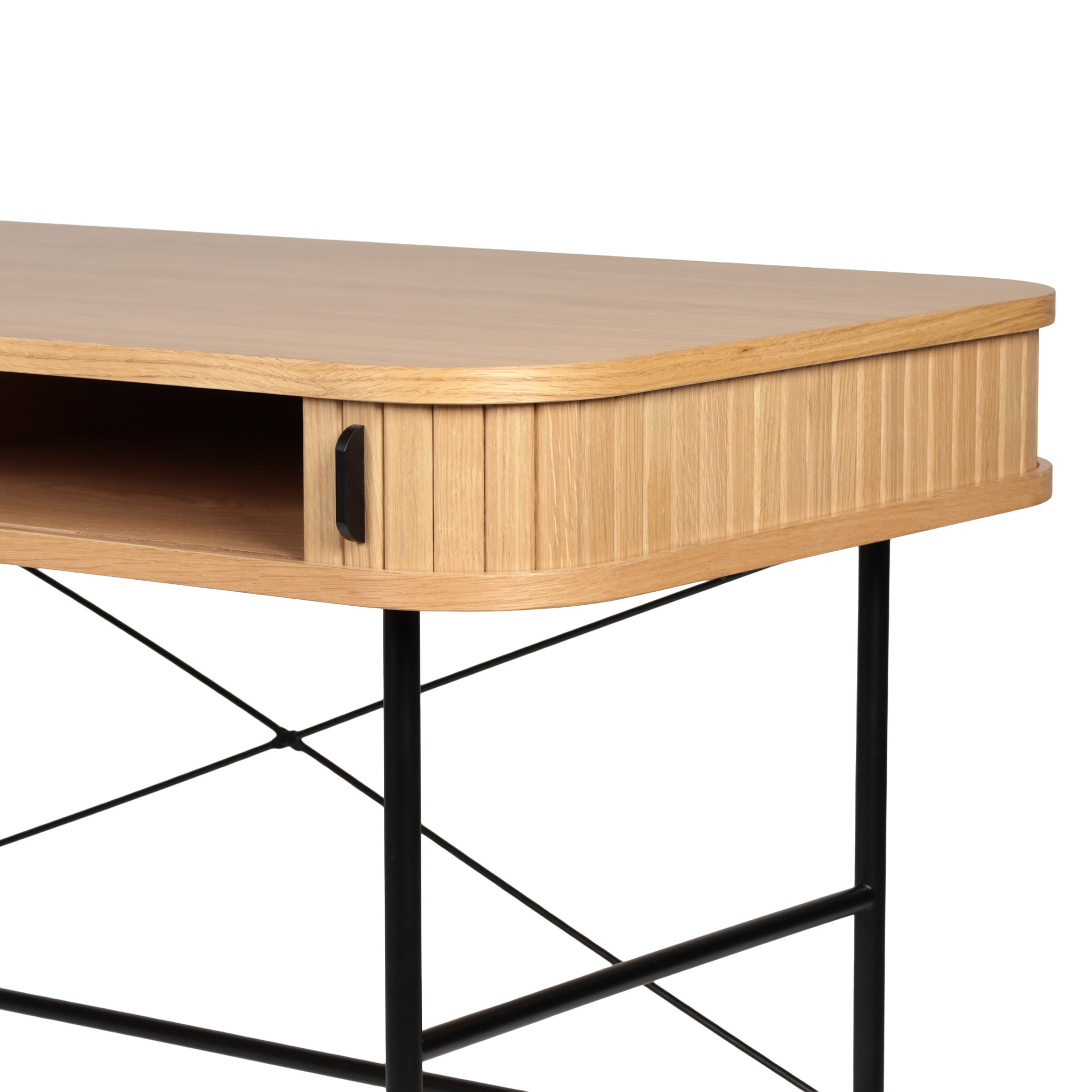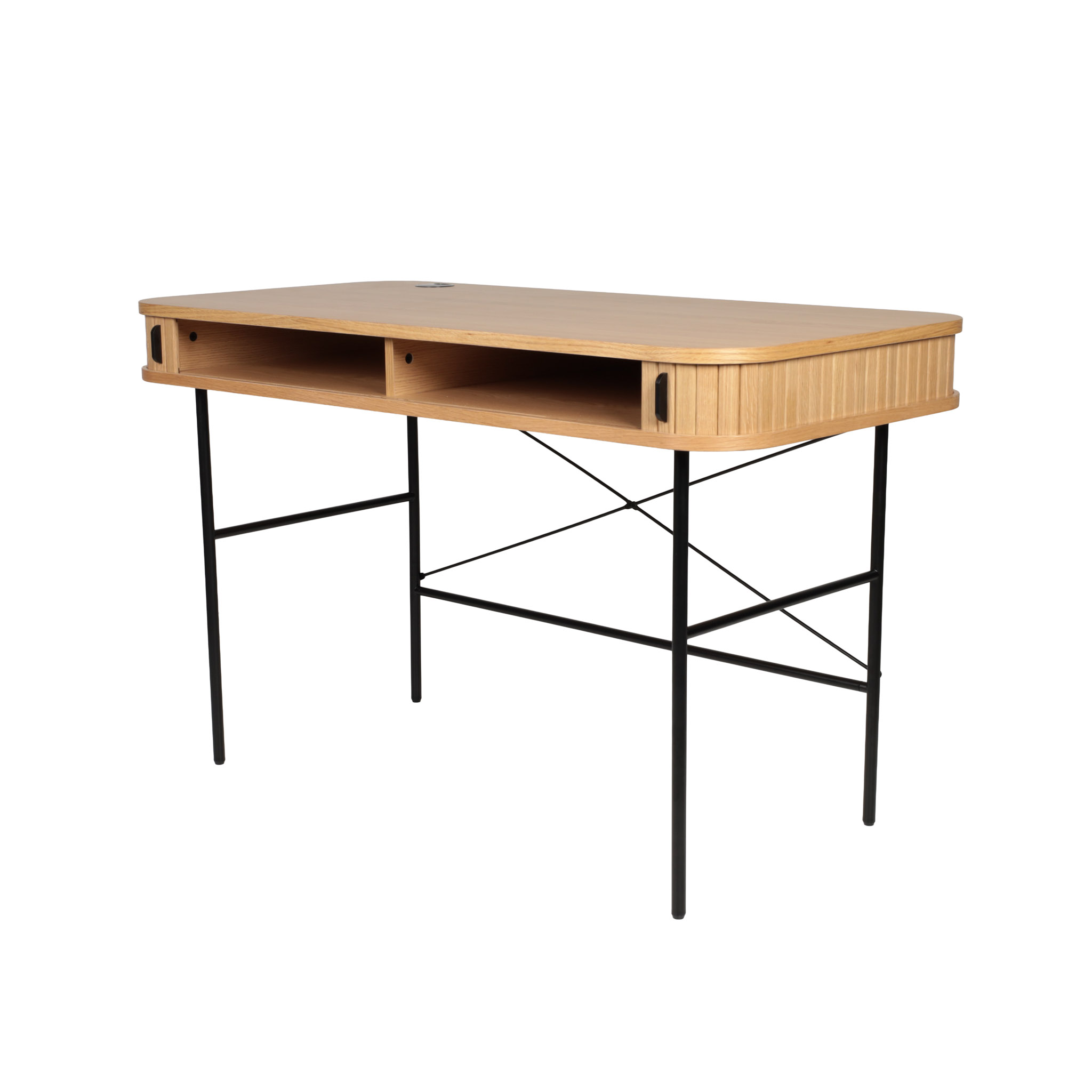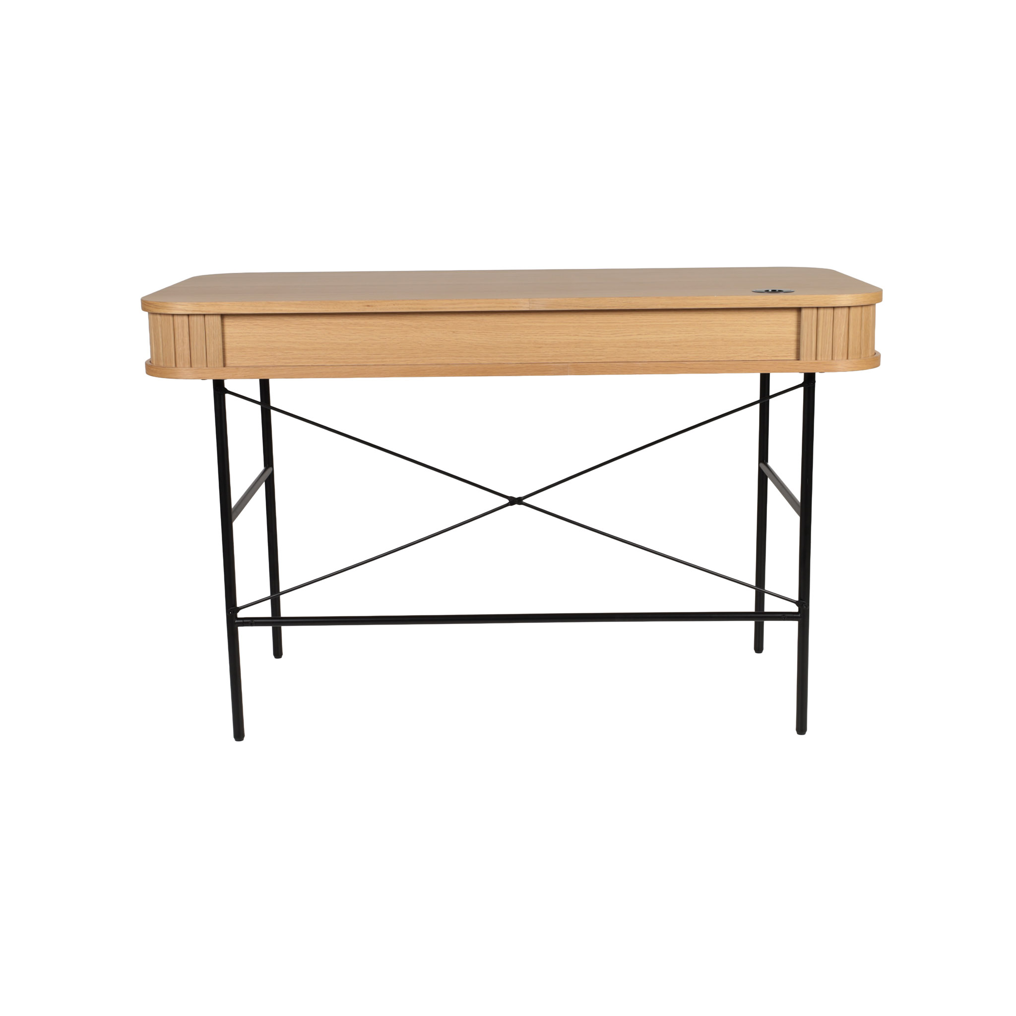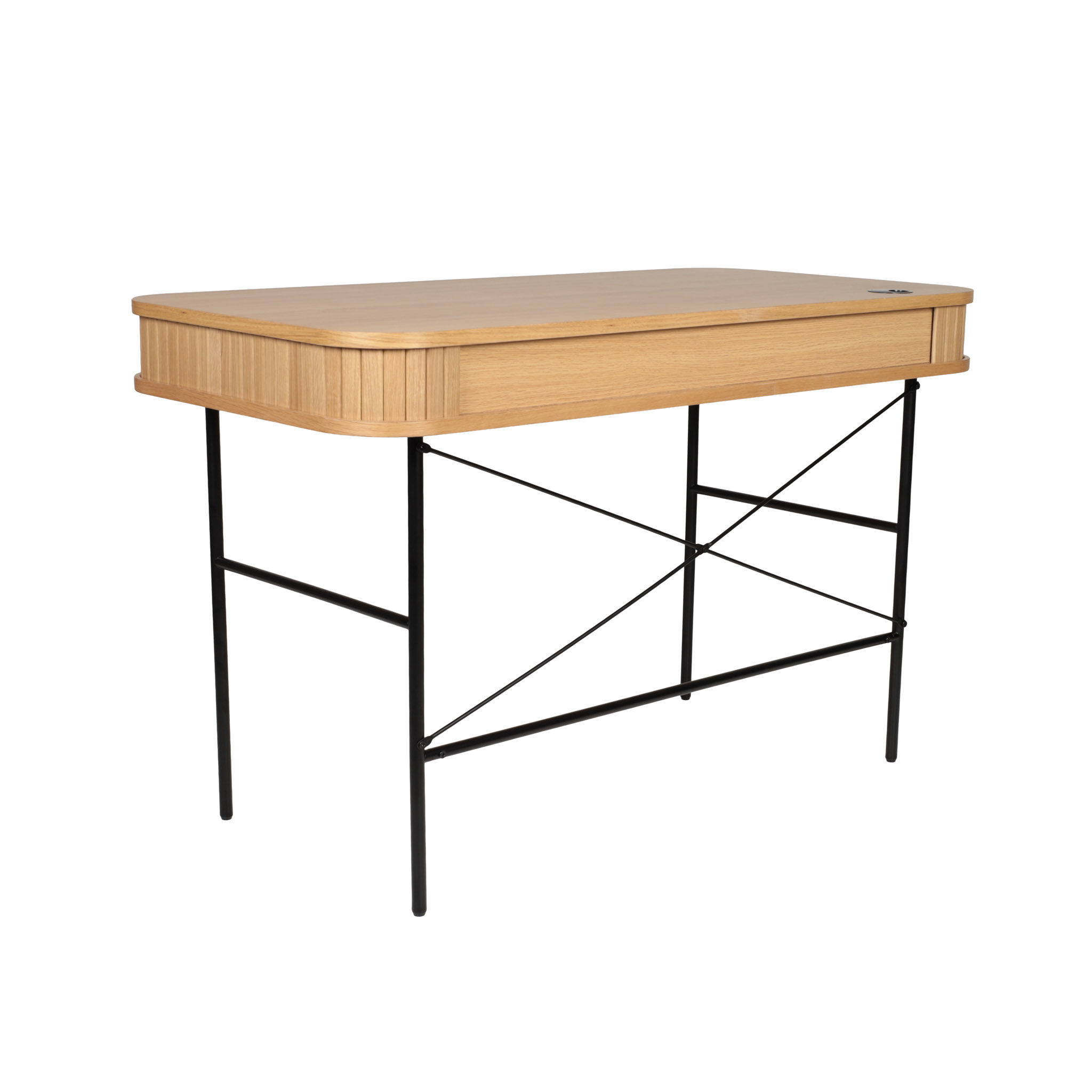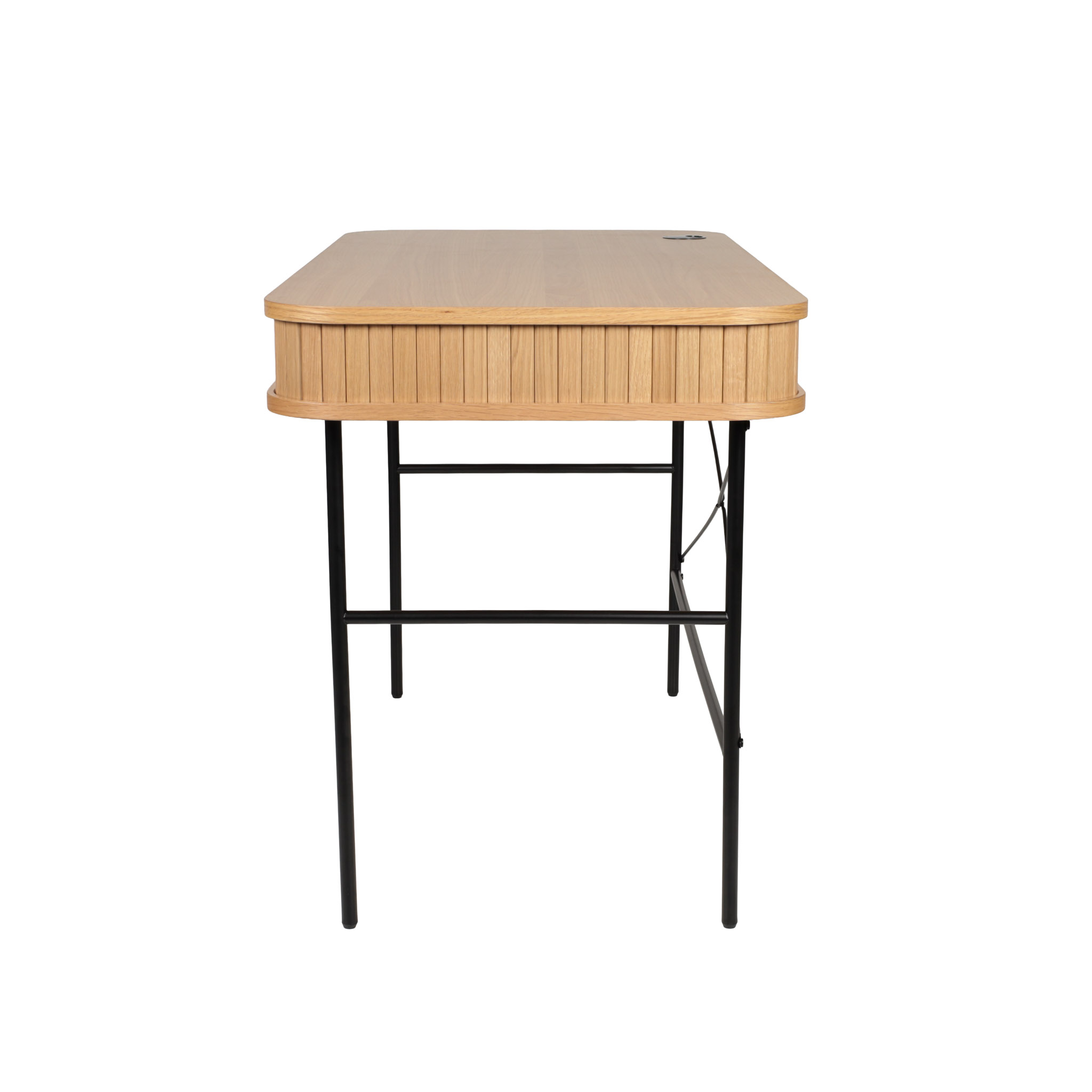 Disponible en acabado natural, el Escritorio Nola destaca por sus patas de metal negro que contrastan con la calidez de la madera. Funcional y elegante en cualquier entorno.