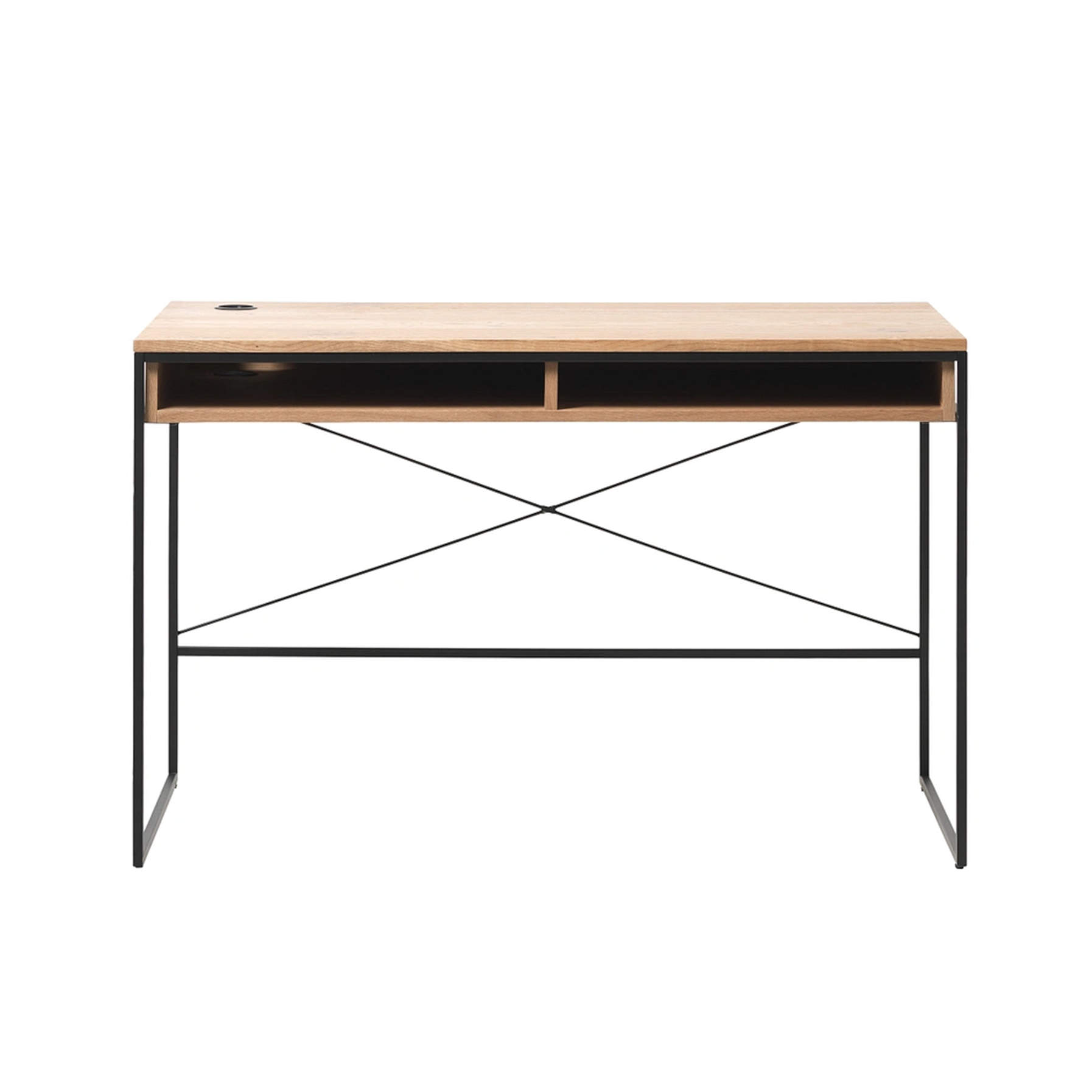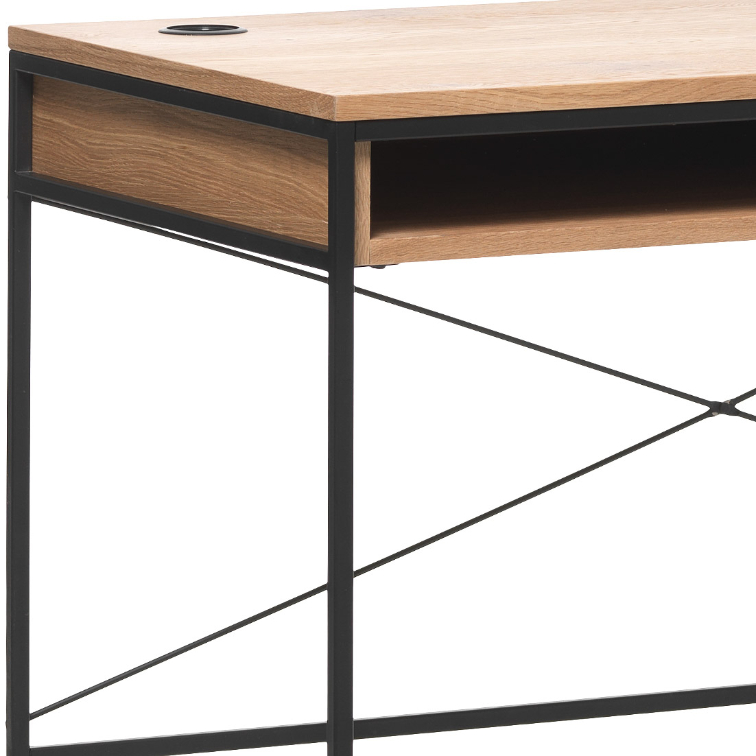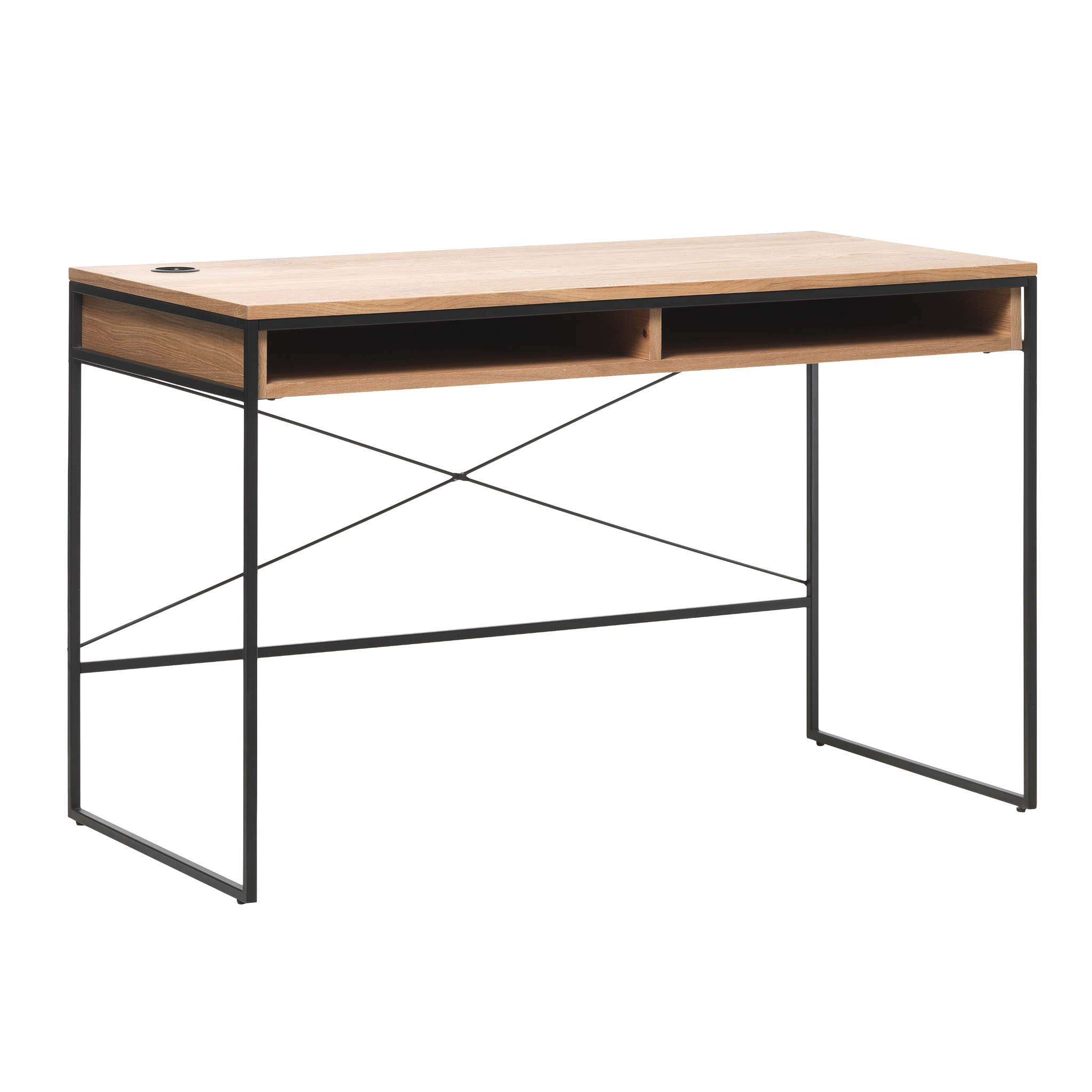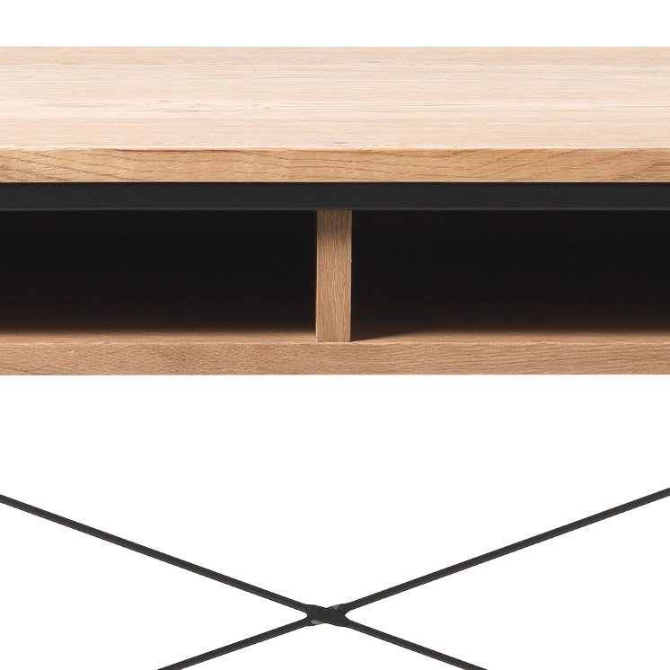 Escritorio modelo Rivoli en madera de roble con acabado natural oak y patas de metal negro, ideal para un espacio de trabajo moderno y funcional. Su diseño combina la calidez del roble con la elegancia del metal, aportando un estilo contemporáneo y versátil.
