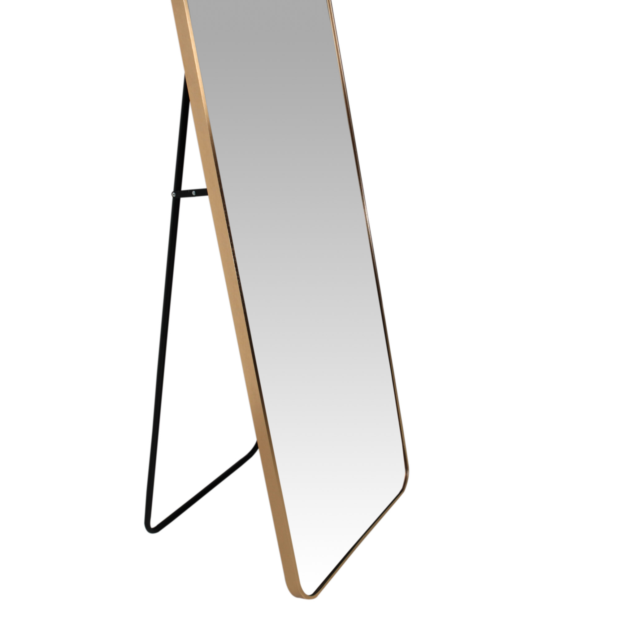 Espejo de piso a techo con marco arqueado en metal de aluminio color champaña. Su diseño estilizado y acabado sutilmente brillante aportan sofisticación y amplitud, ideal para espacios que buscan elegancia con un toque moderno.