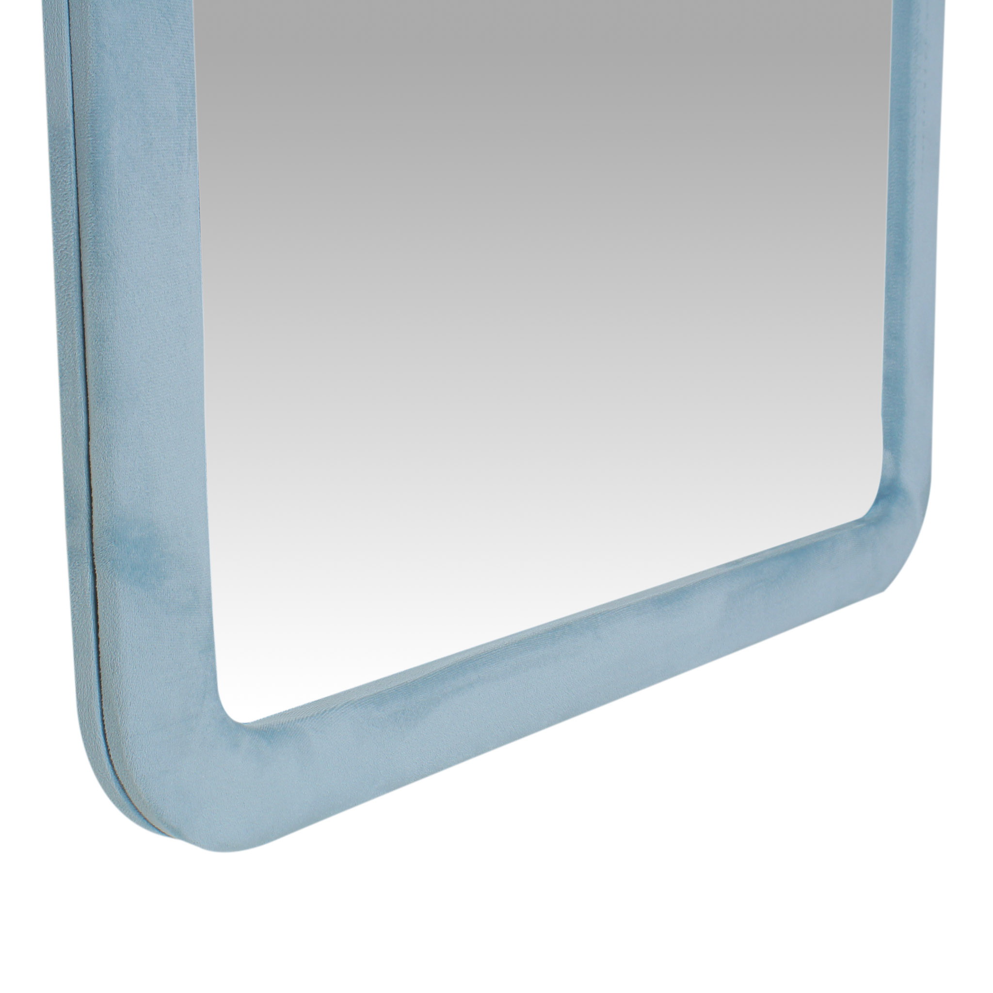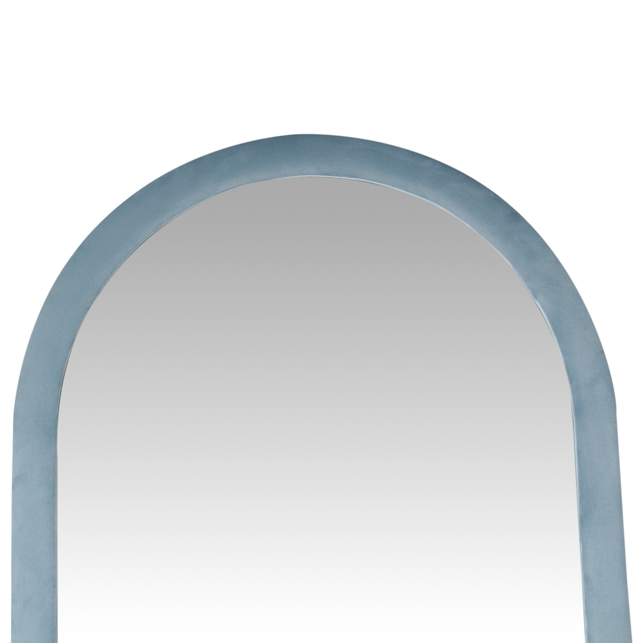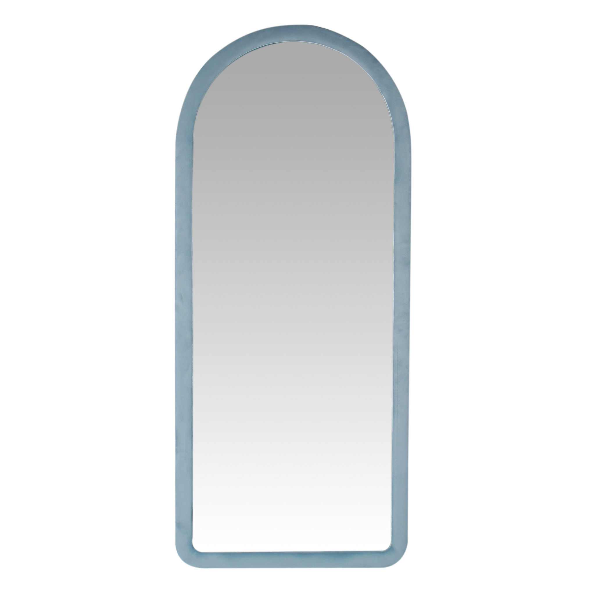Espejo de piso a techo con marco arqueado tapizado en tela velver color azul, ideal para ampliar visualmente el espacio y sumar un toque de textura. Su forma curva y presencia elegante lo convierten en una pieza protagonista en cualquier ambiente.