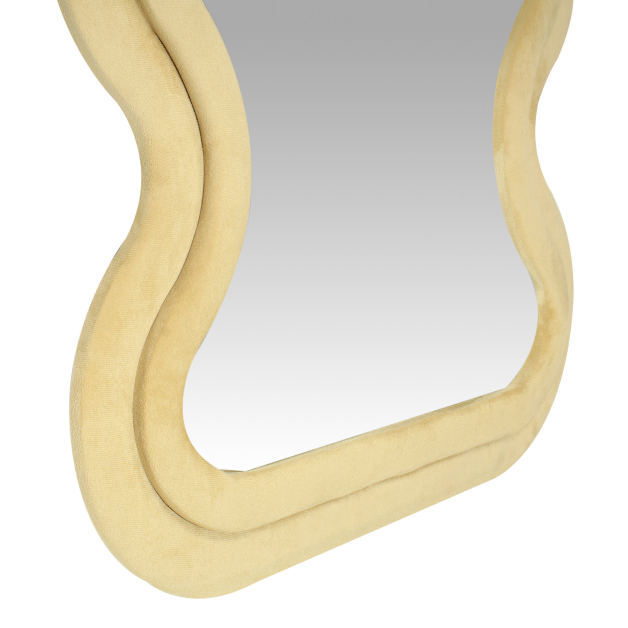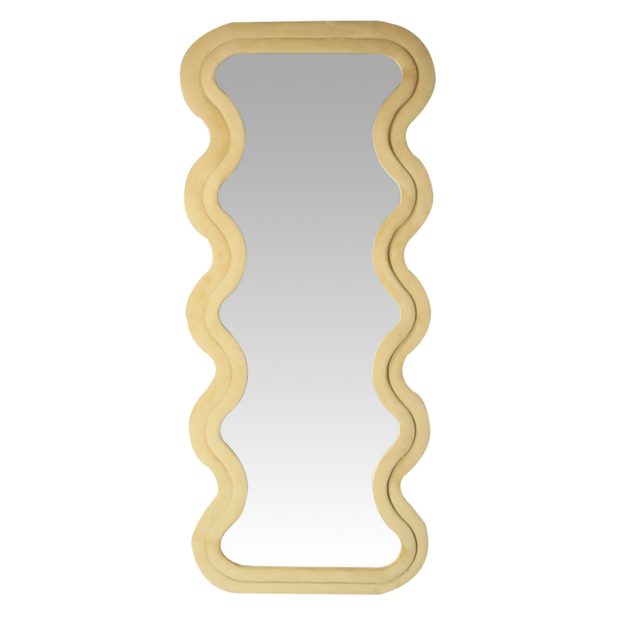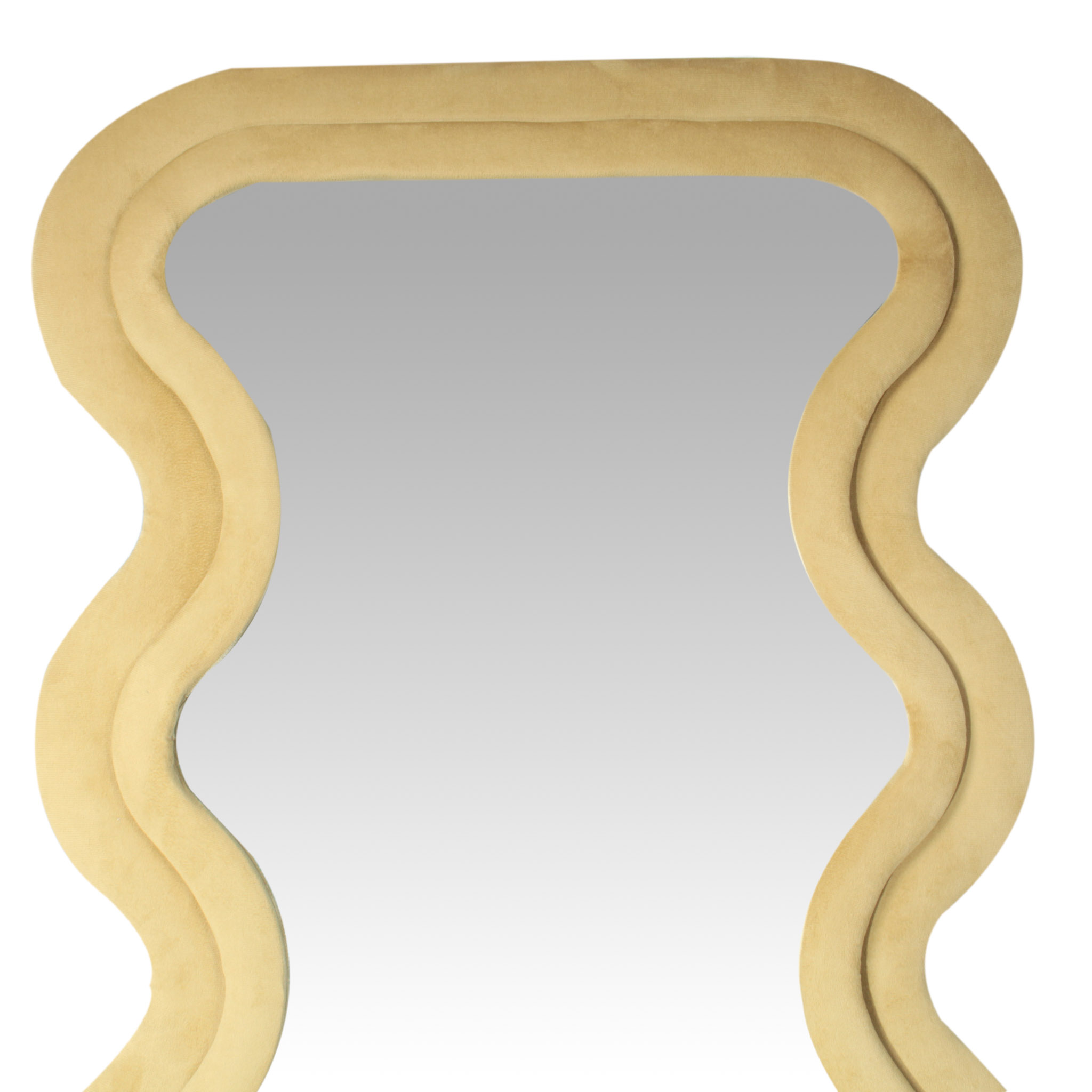 El espejo Wave de piso a techo presenta una forma rectangular con un marco de diseño irregular tapizado en tela velvet mostaza. Su contraste entre líneas rectas y curvas orgánicas lo convierte en una pieza original y moderna, perfecta para dar frescura y estilo a cualquier ambiente.