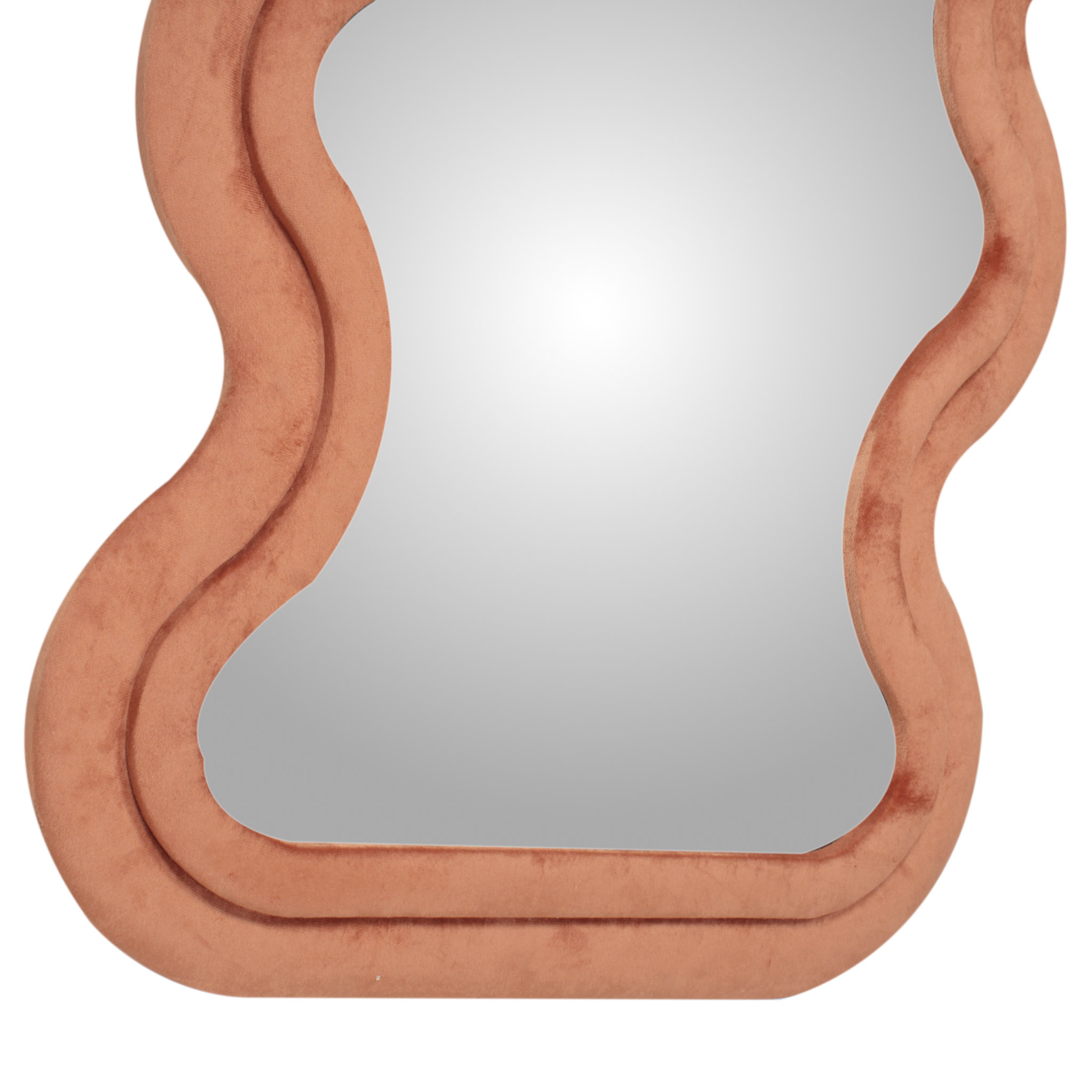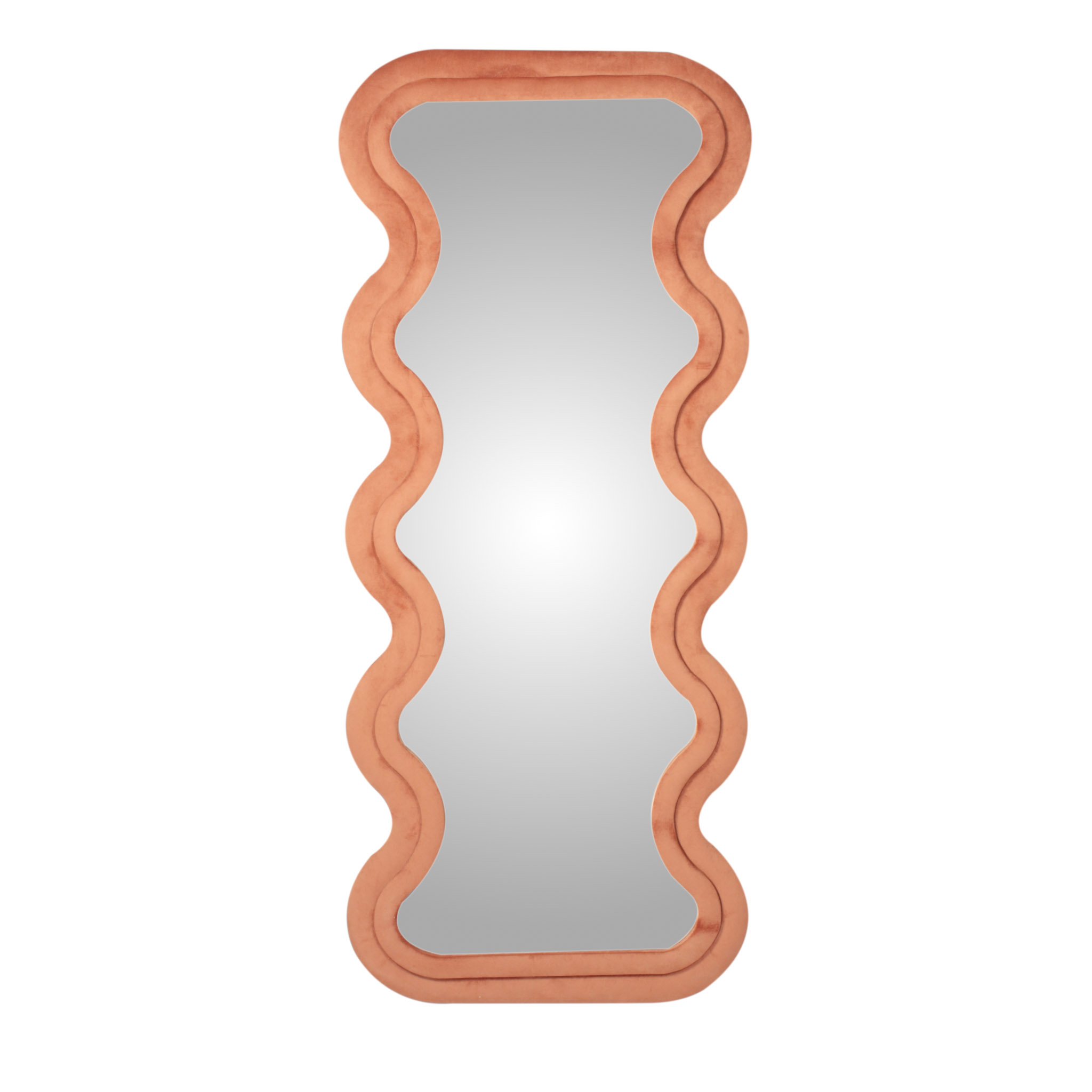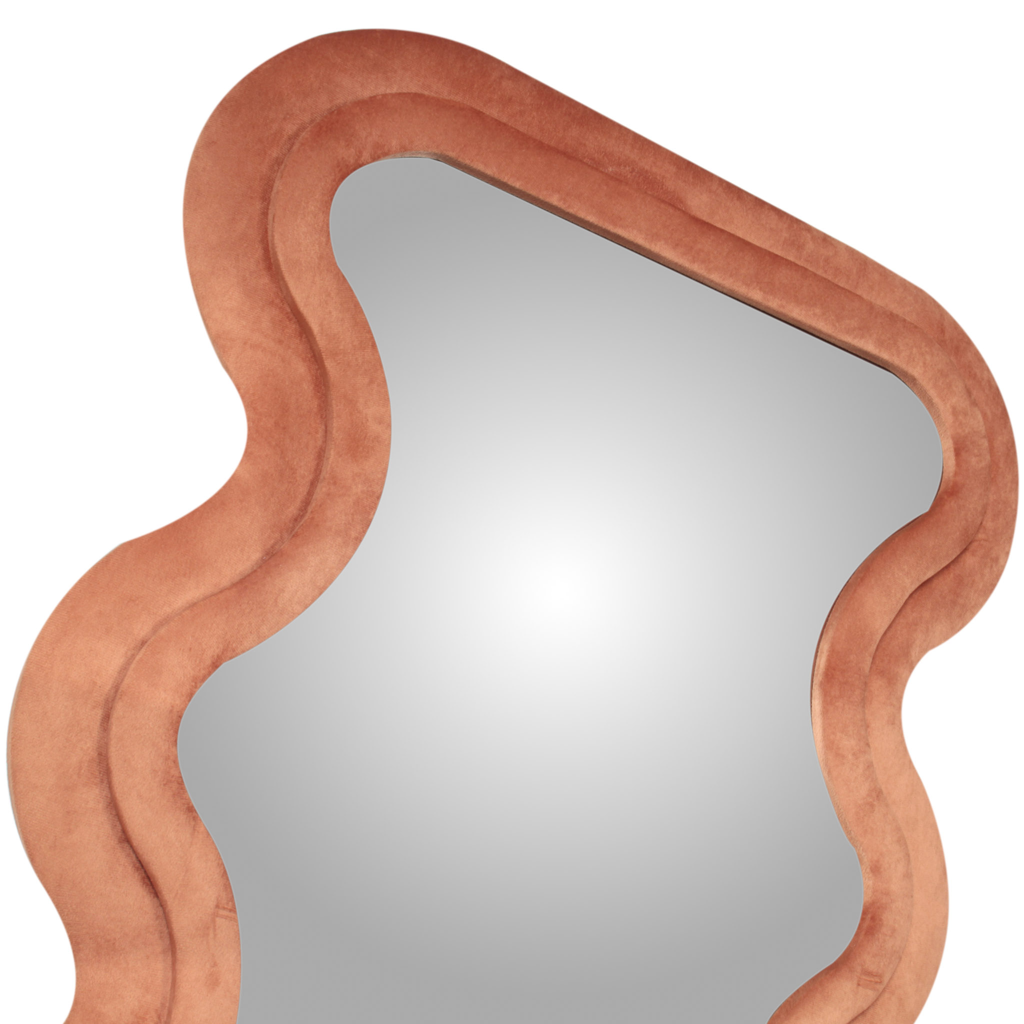 El espejo Wave de piso a techo combina una silueta rectangular con un marco de diseño irregular tapizado en tela velvet naranja. Su mezcla de líneas definidas y curvas suaves aporta un toque artístico y contemporáneo a cualquier espacio.