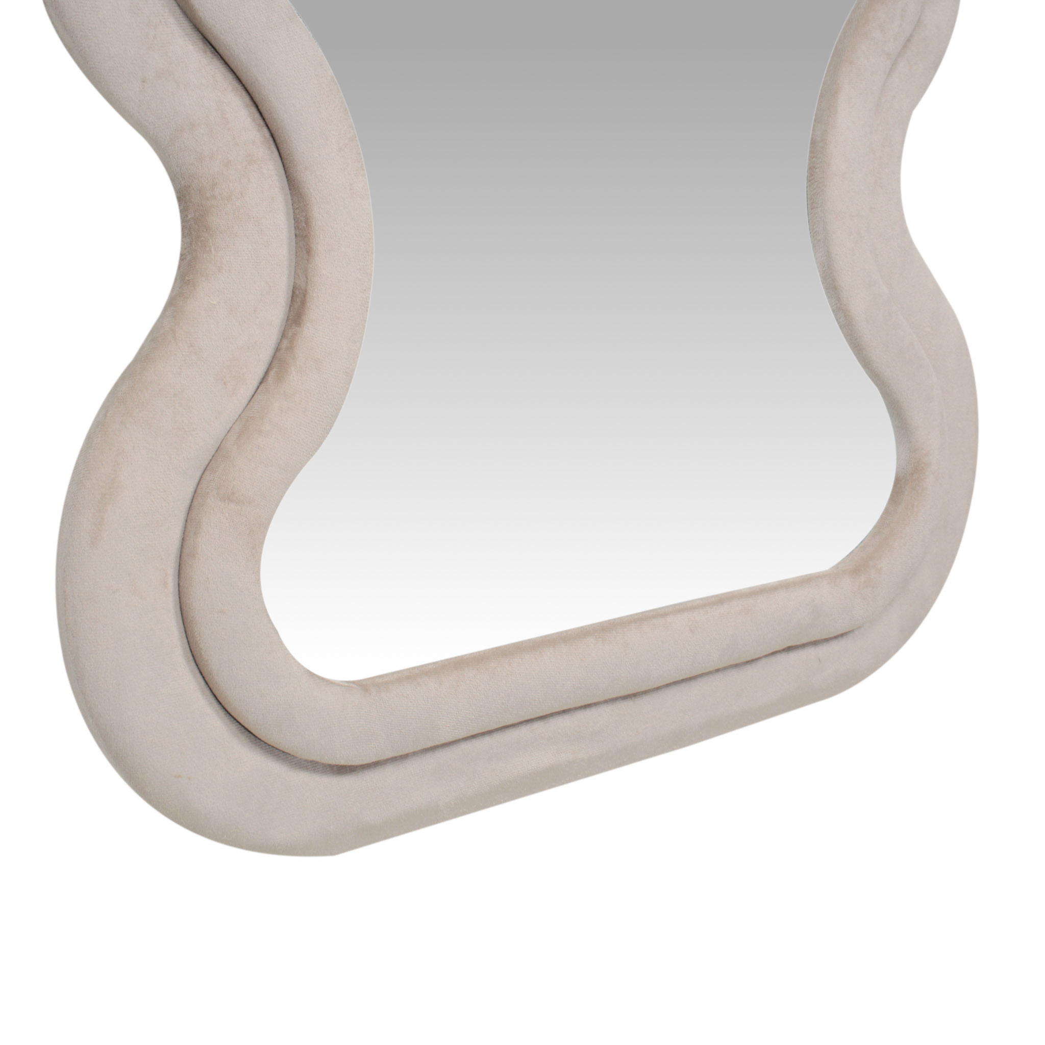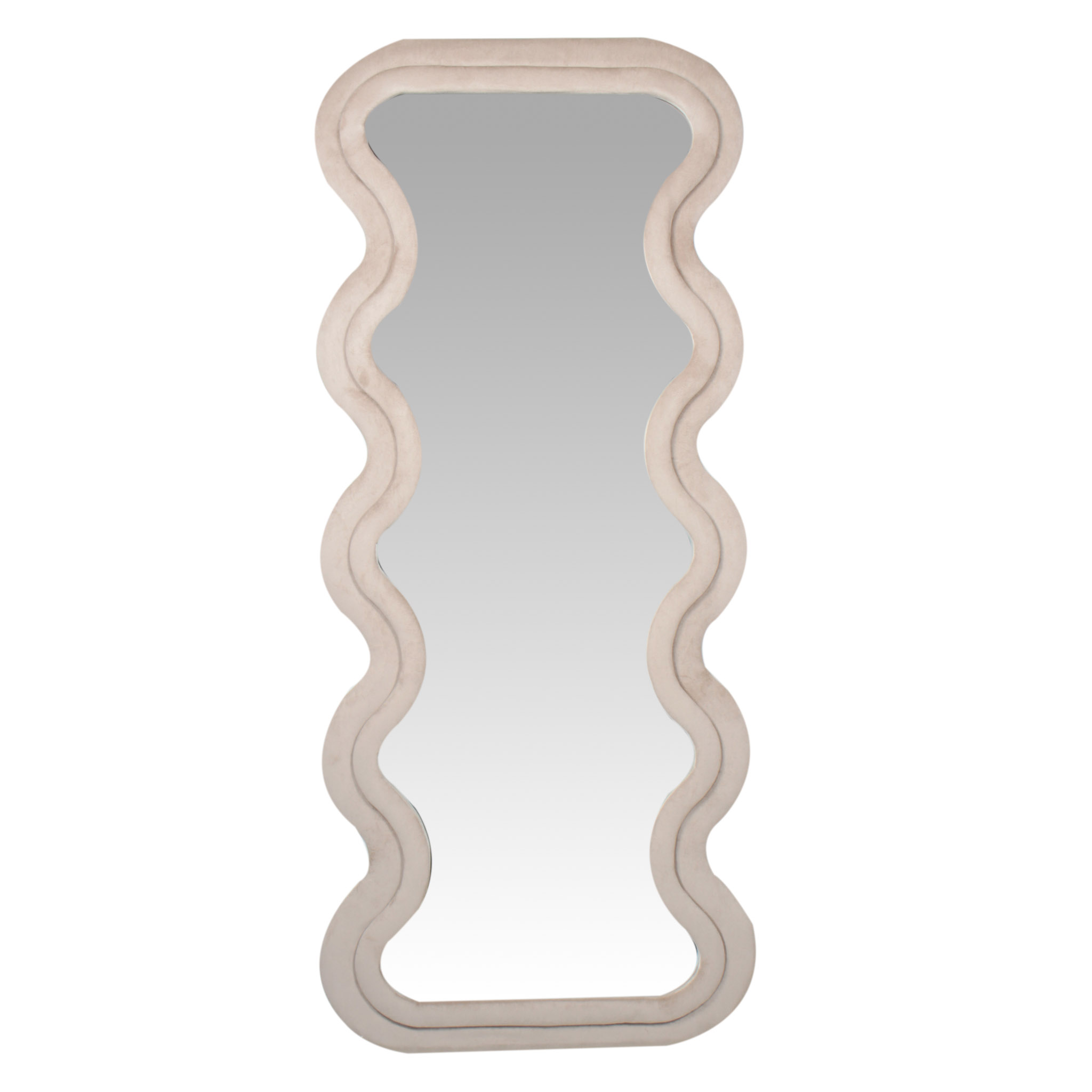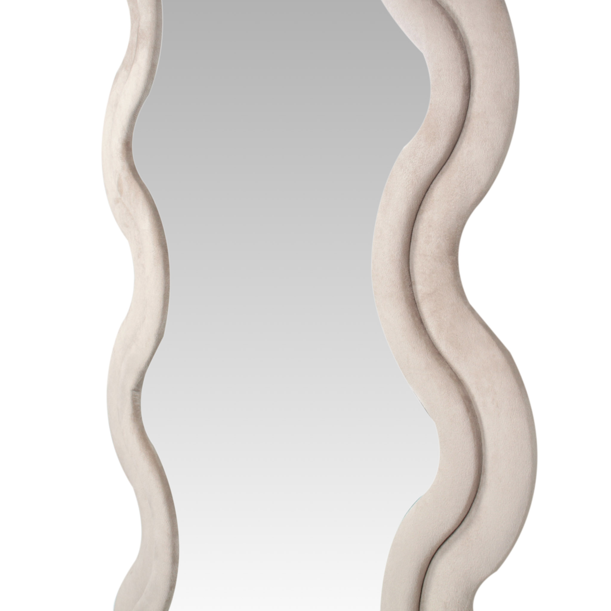 El espejo Wave de piso a techo combina una silueta rectangular con un marco de diseño irregular tapizado en tela velvet beige. Su mezcla de líneas definidas y curvas suaves aporta un toque artístico y contemporáneo a cualquier espacio.