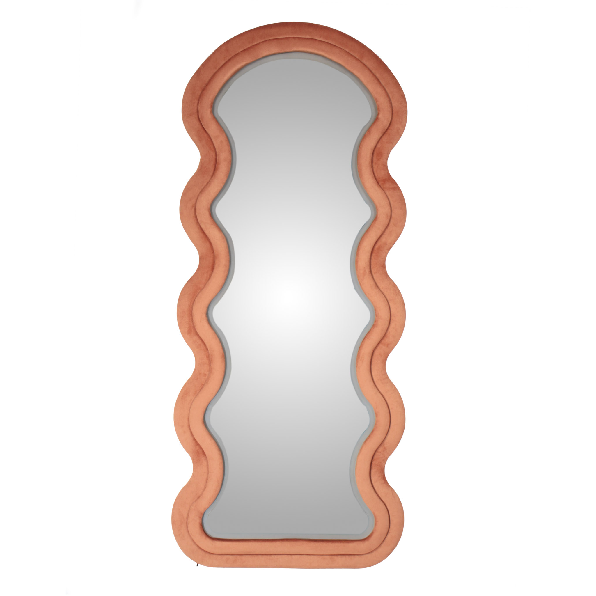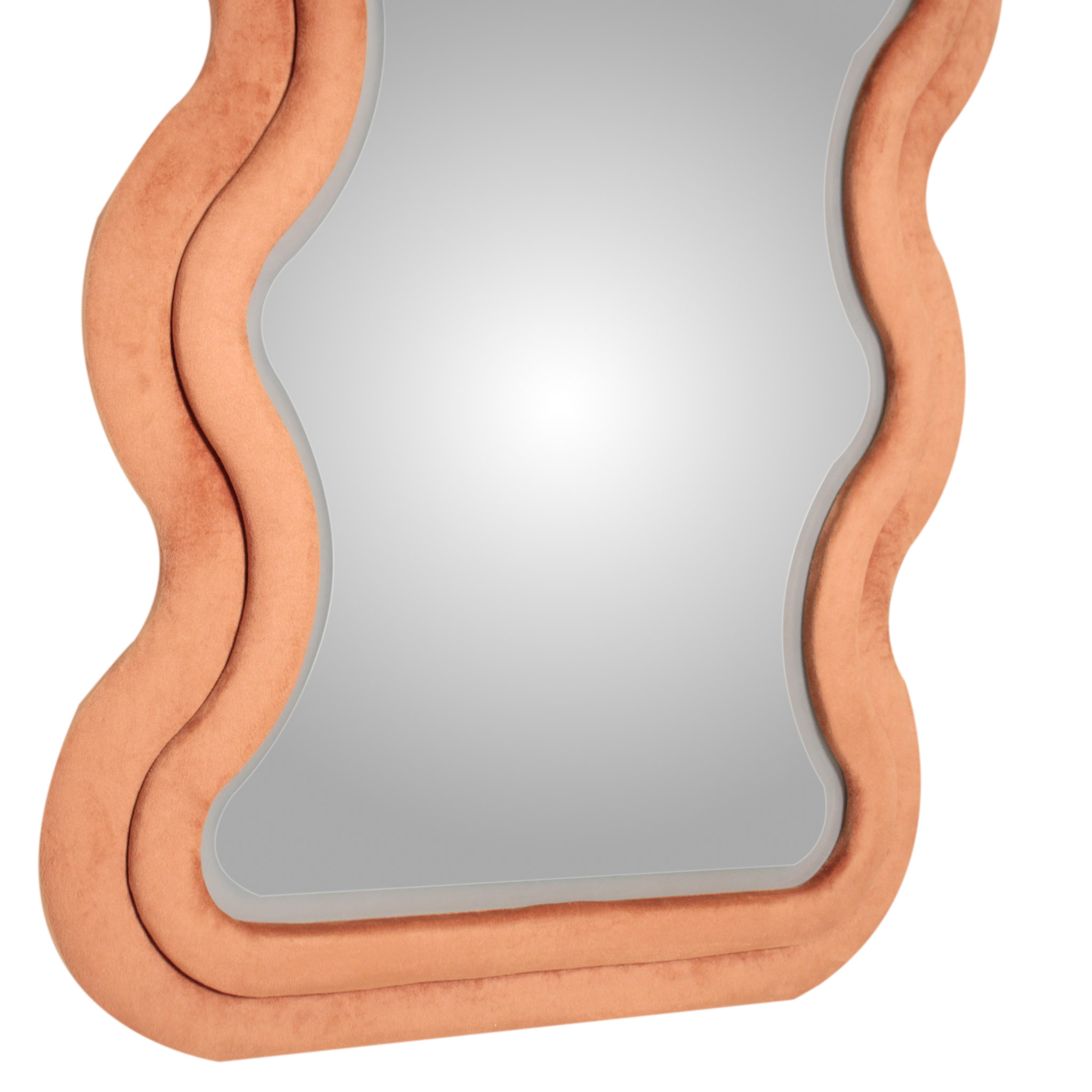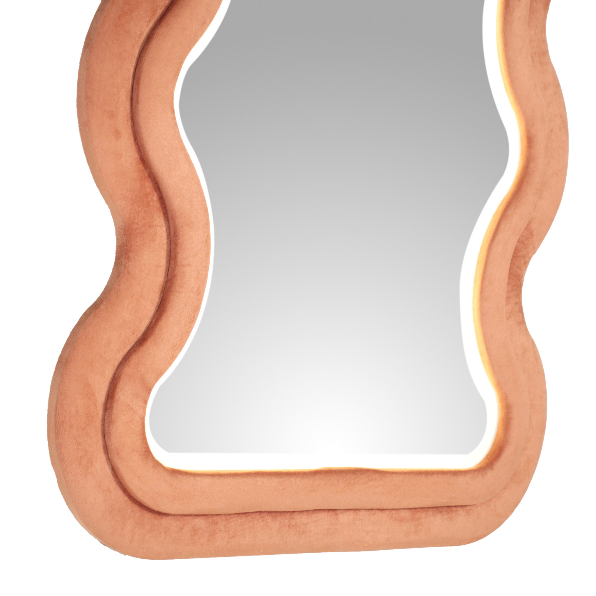 El espejo Wave de piso a techo combina un marco tapizado en tela velvet naranja con iluminación LED integrada de tres tonos. Su diseño orgánico y cálido aporta textura y estilo, mientras que la luz realza el espacio con un toque moderno y funcional.
