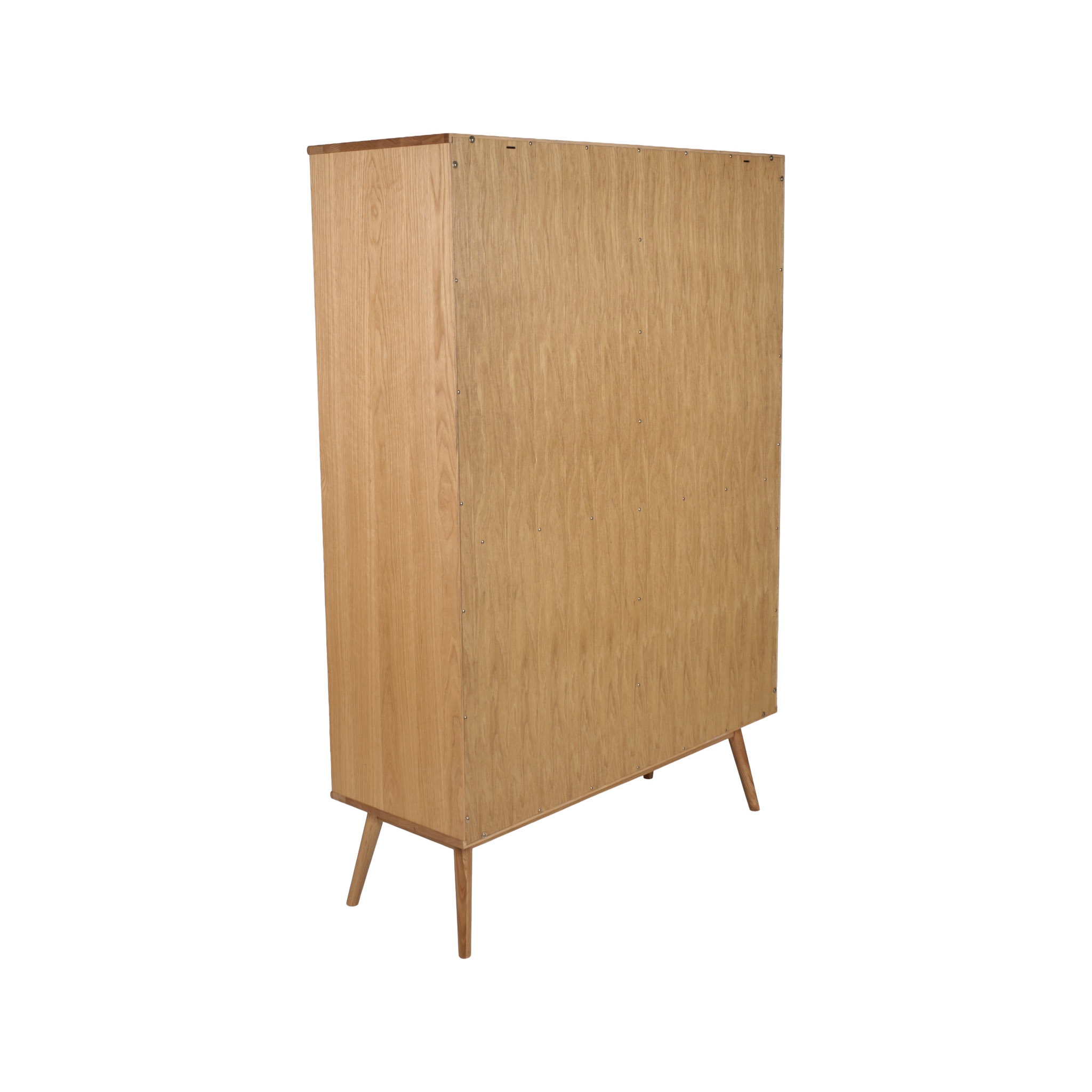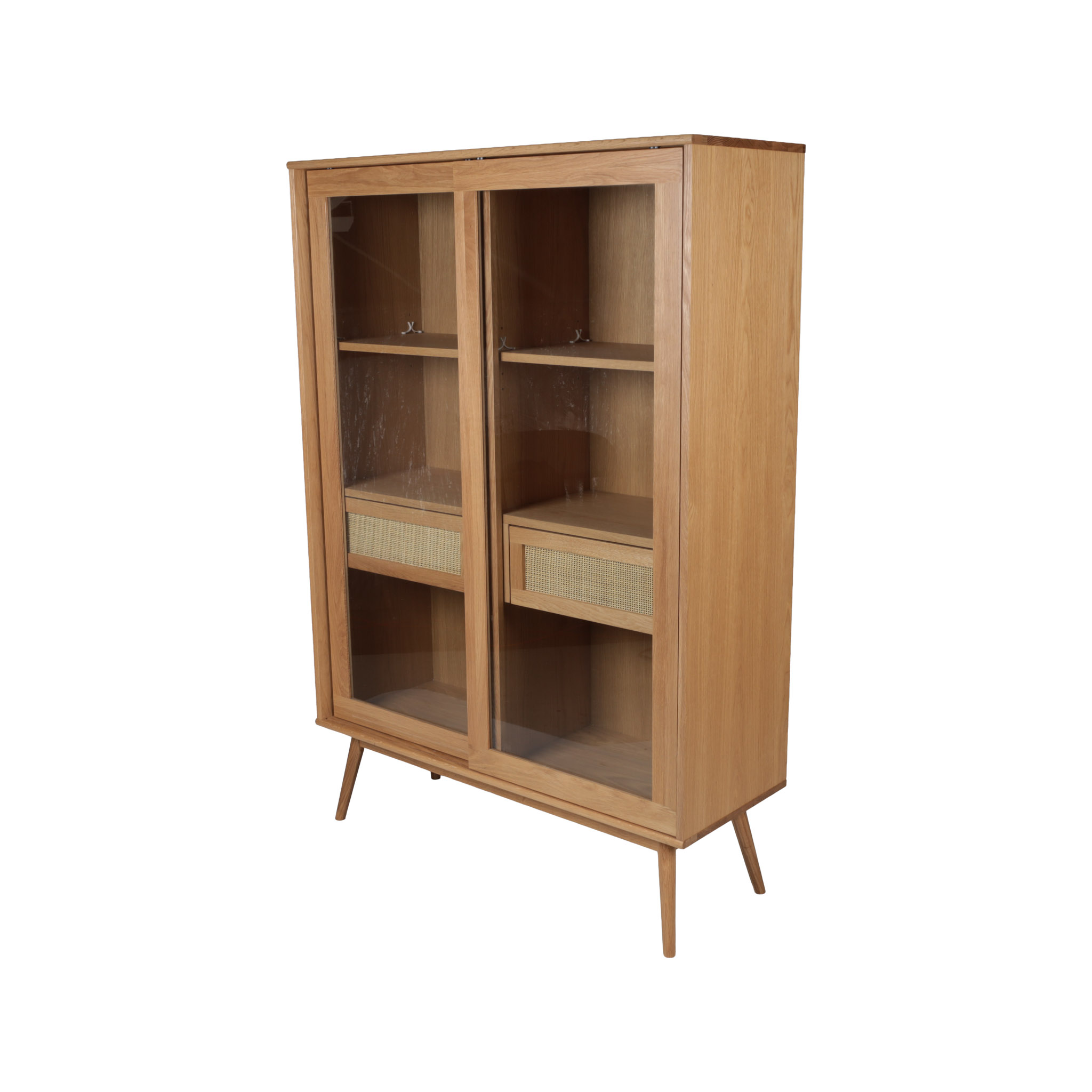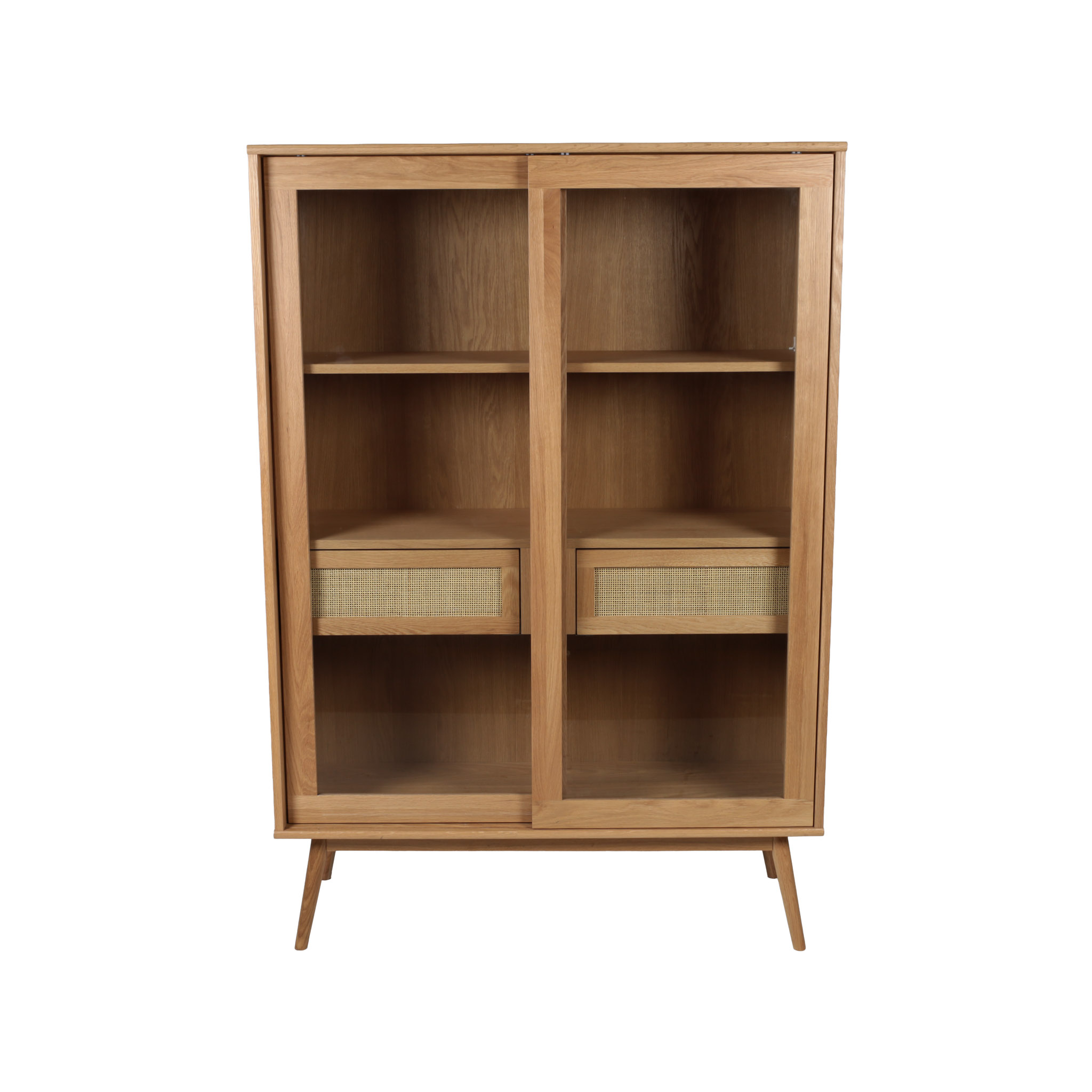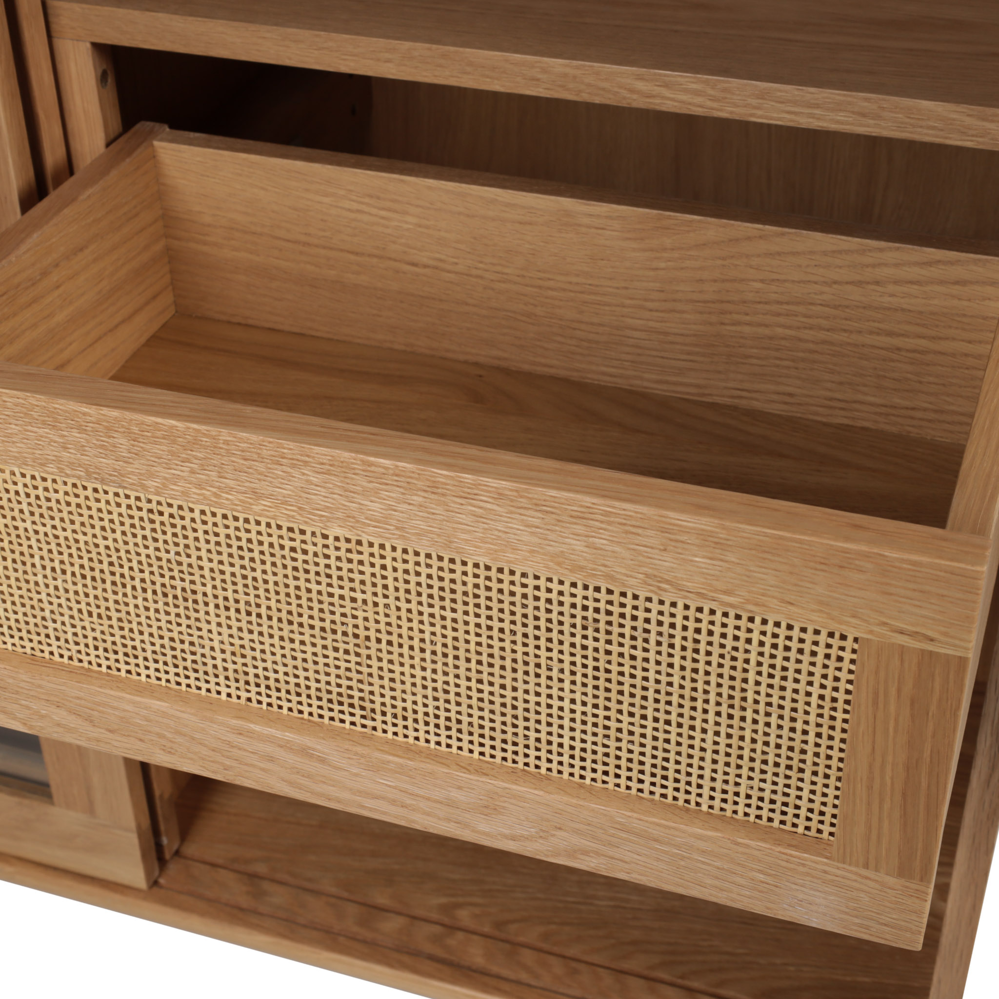 La elegancia del Gabinete Barrali reside en su mezcla de texturas: madera en acabado natural, cajones con detalles de rattán y puertas superiores de vidrio. Esta pieza alta aporta carácter y sofisticación, perfecta para exhibir y organizar con estilo.