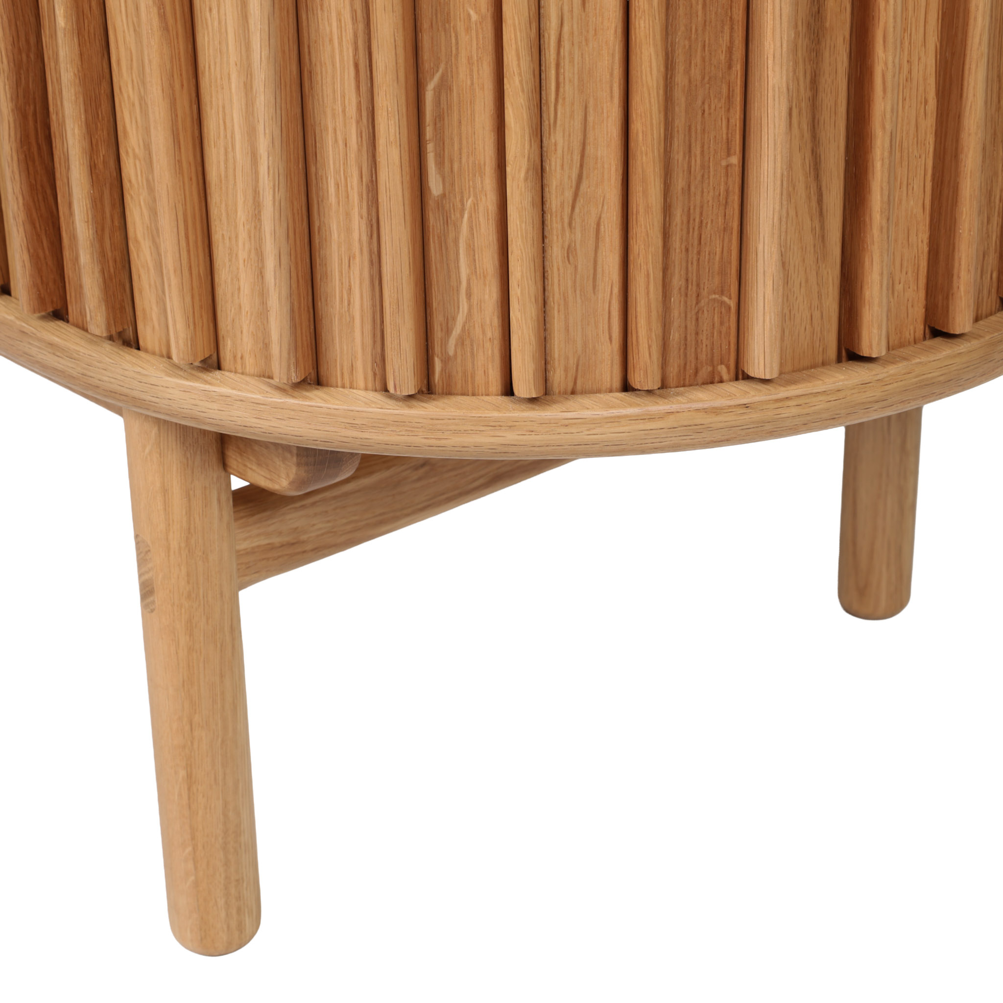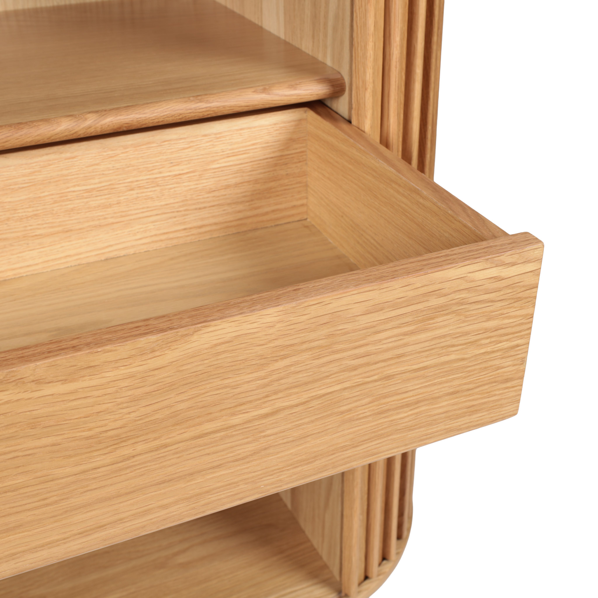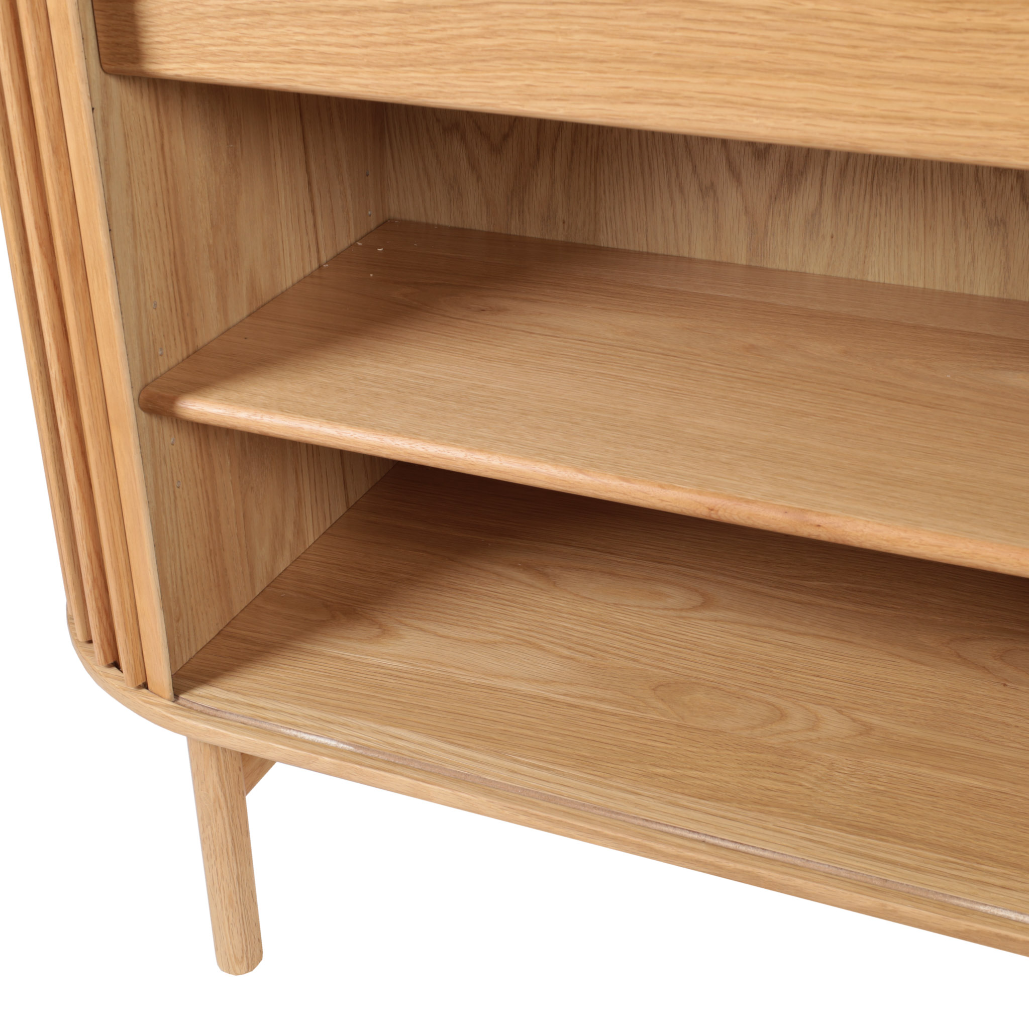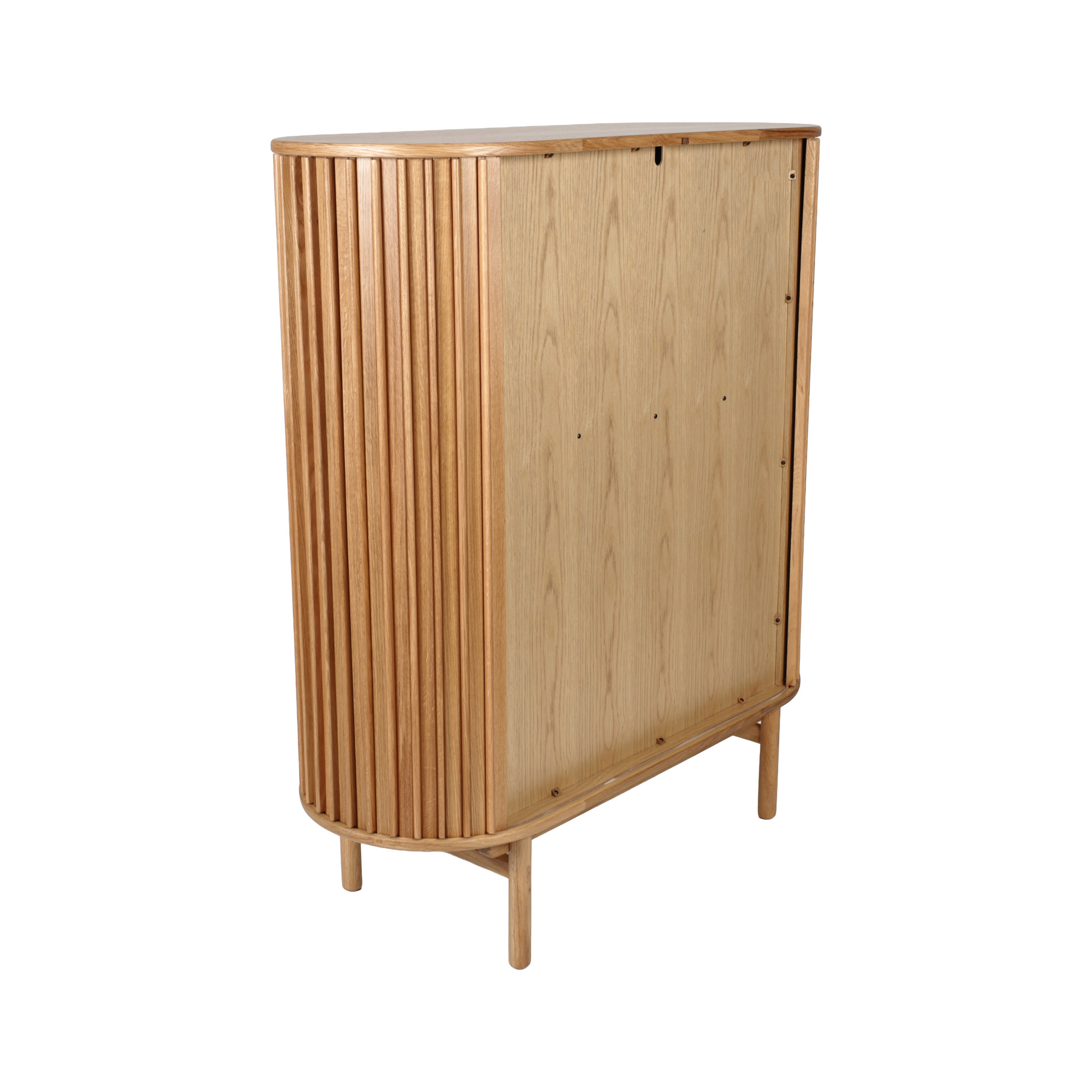 Funcionalidad vertical. El Gabinete alto Carno presenta la madera en acabado natural con puertas corredizas, perfecto como almacenamiento adicional en comedores o livings modernos con un toque rústico.
