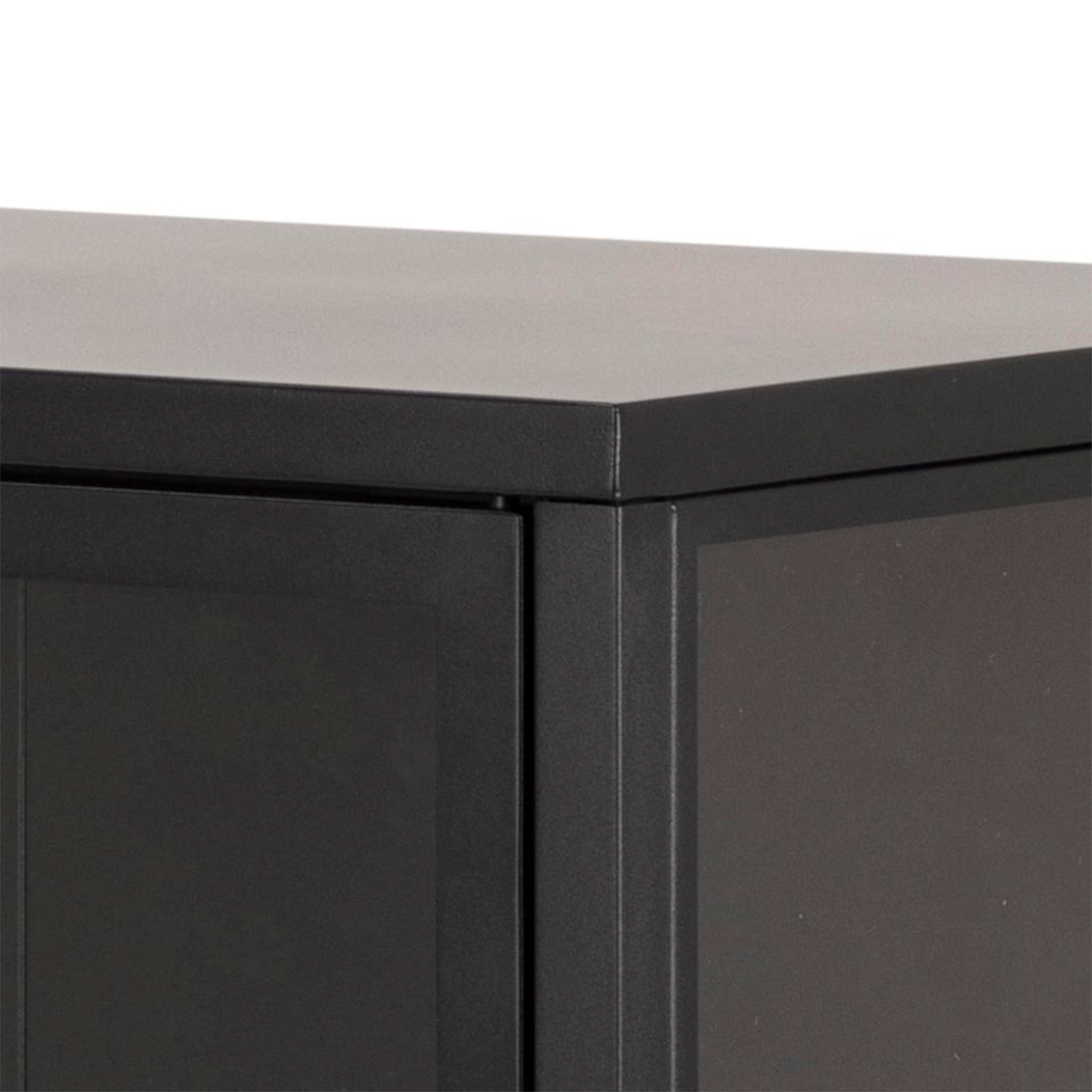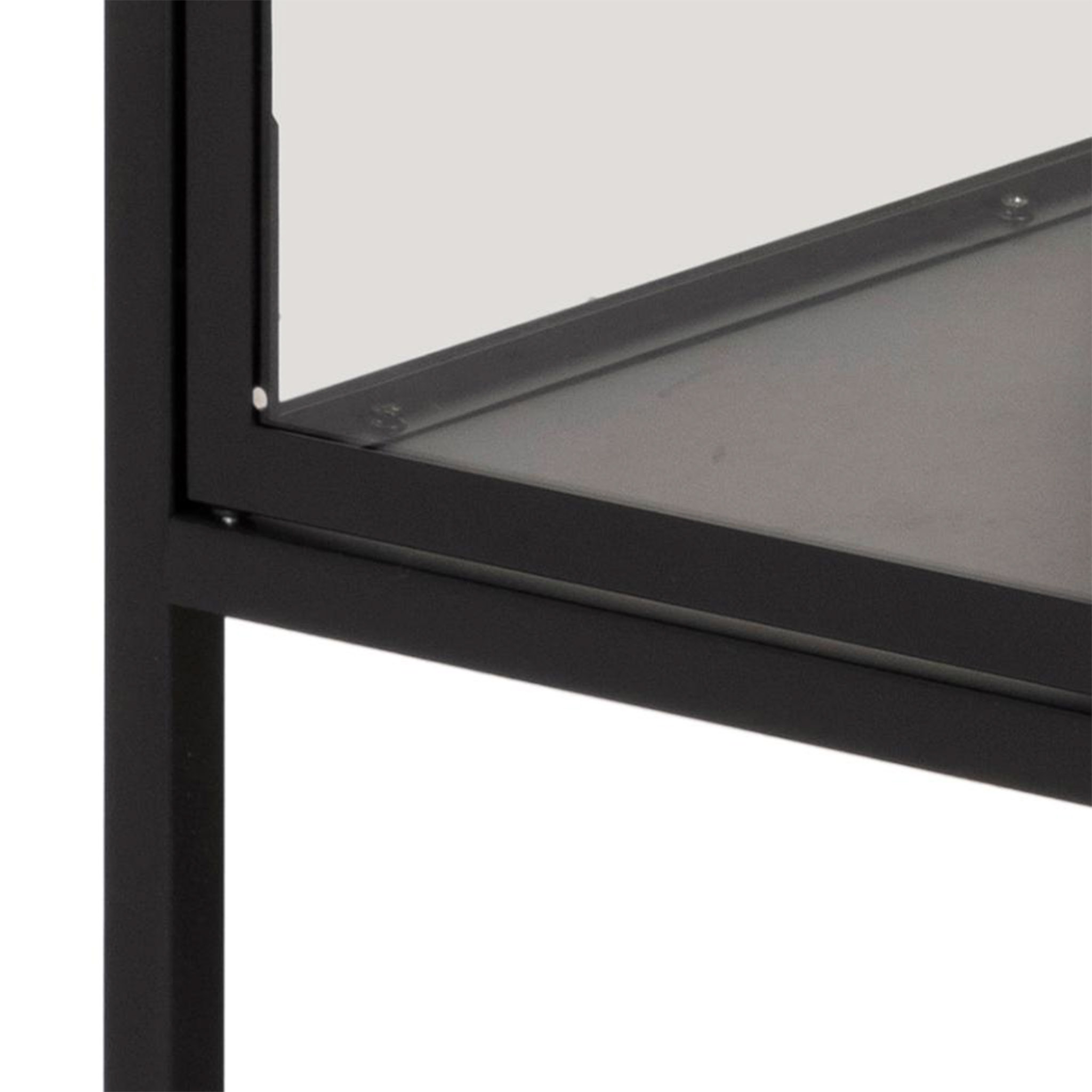 Un gabinete sofisticado para exhibir lo esencial. Con puertas de vidrio transparente y estructura de metal negro, esta pieza es perfecta para destacar vajillas, libros o decoración.