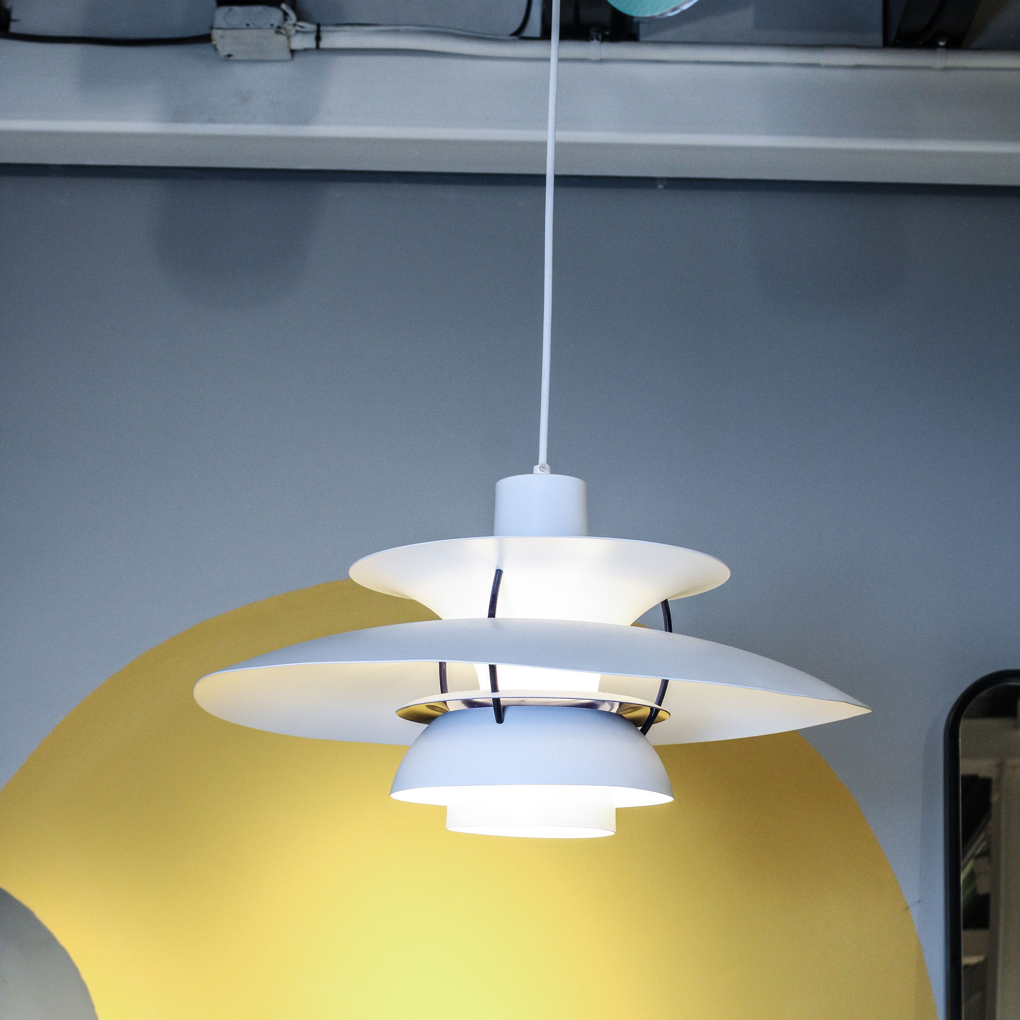 Lámpara de techo de metal y vidrio en color blanco, con detalle en color negro.