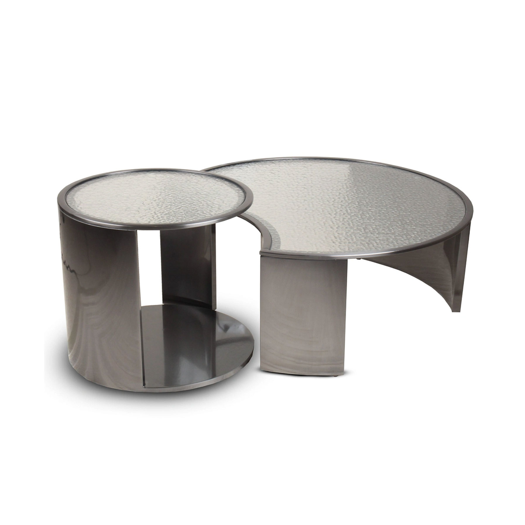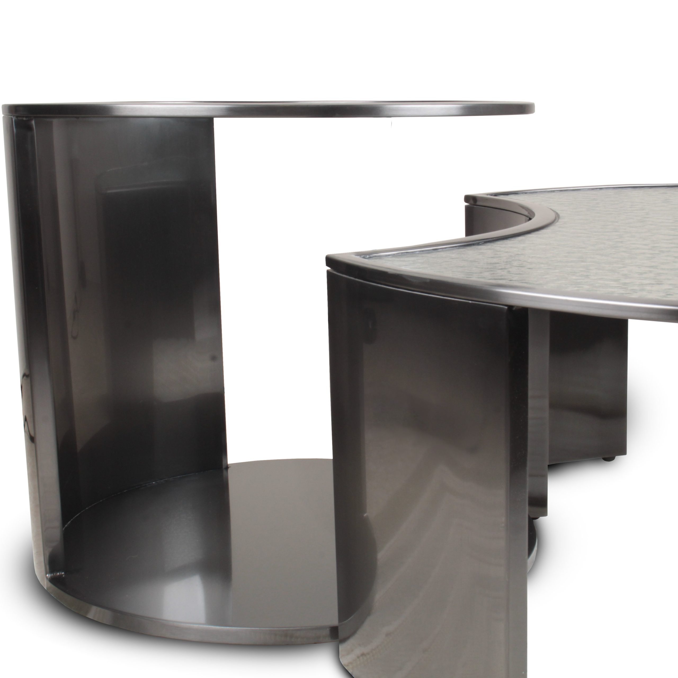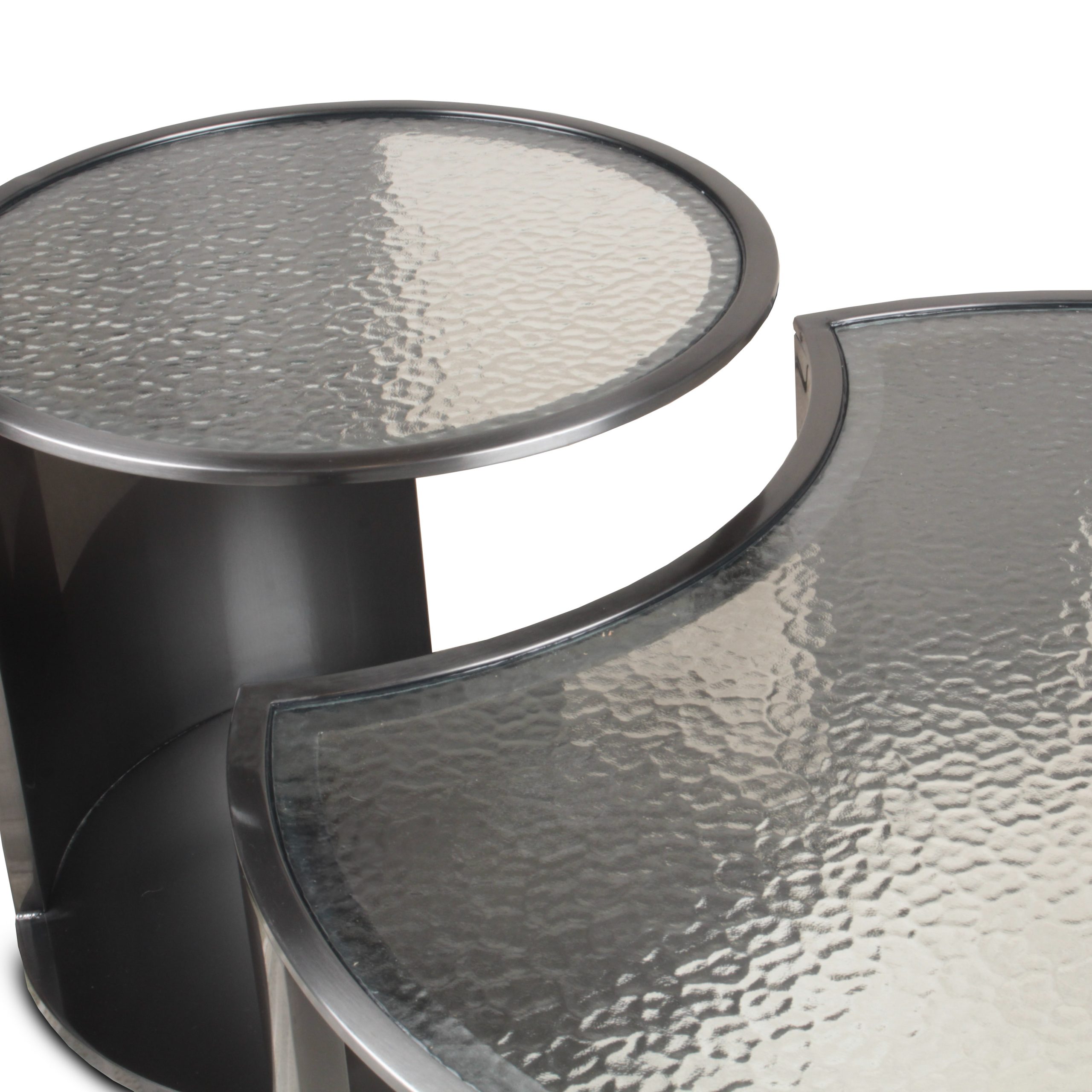 Set de dos mesas de centro con elegantes sobres de vidrio ahumado y robustas bases de metal negro. Este diseño moderno y sofisticado es perfecto para cualquier sala de estar, añadiendo un toque de estilo contemporáneo y funcionalidad. Ideal para complementar la decoración de tu hogar, proporcionando una superficie práctica y decorativa para tu espacio.