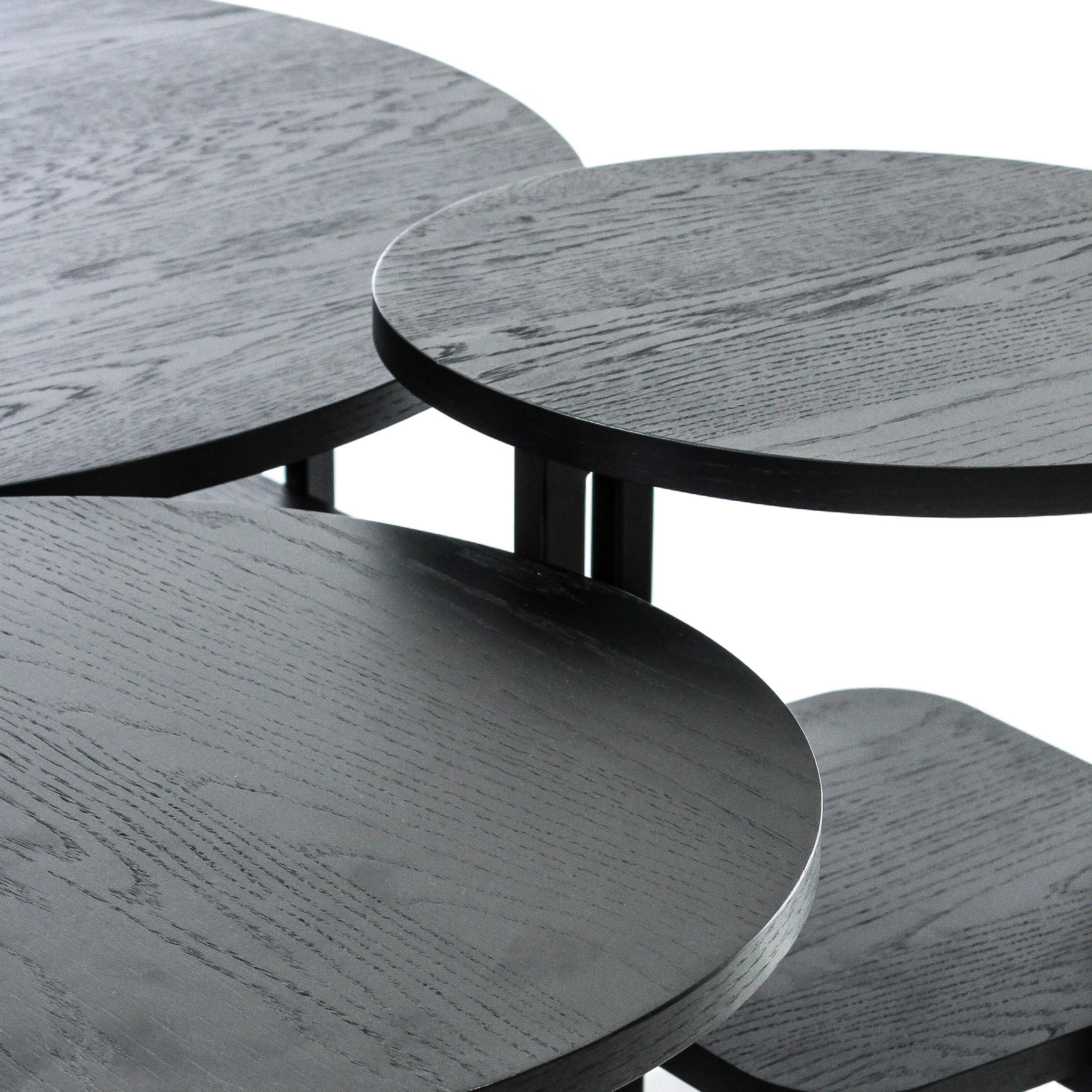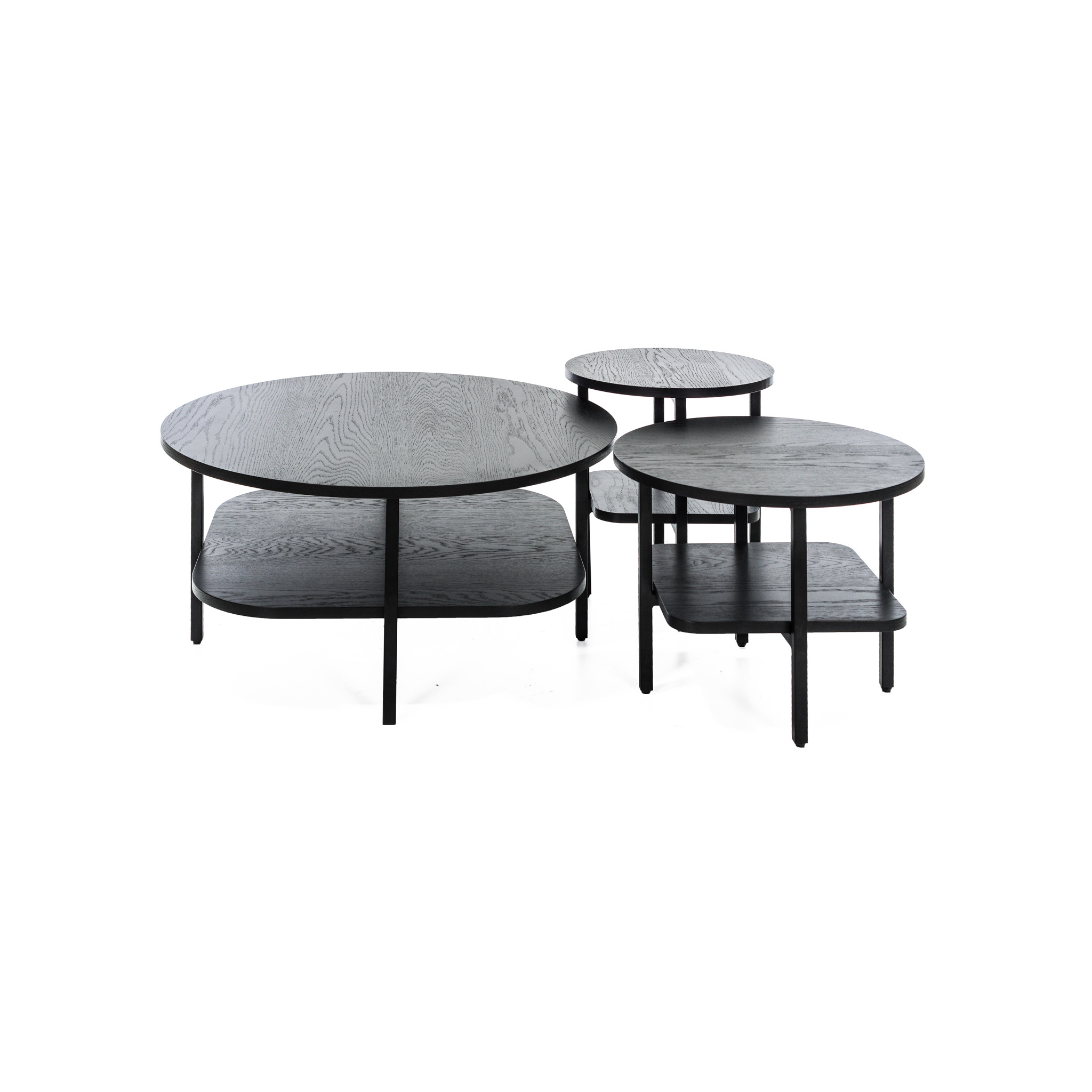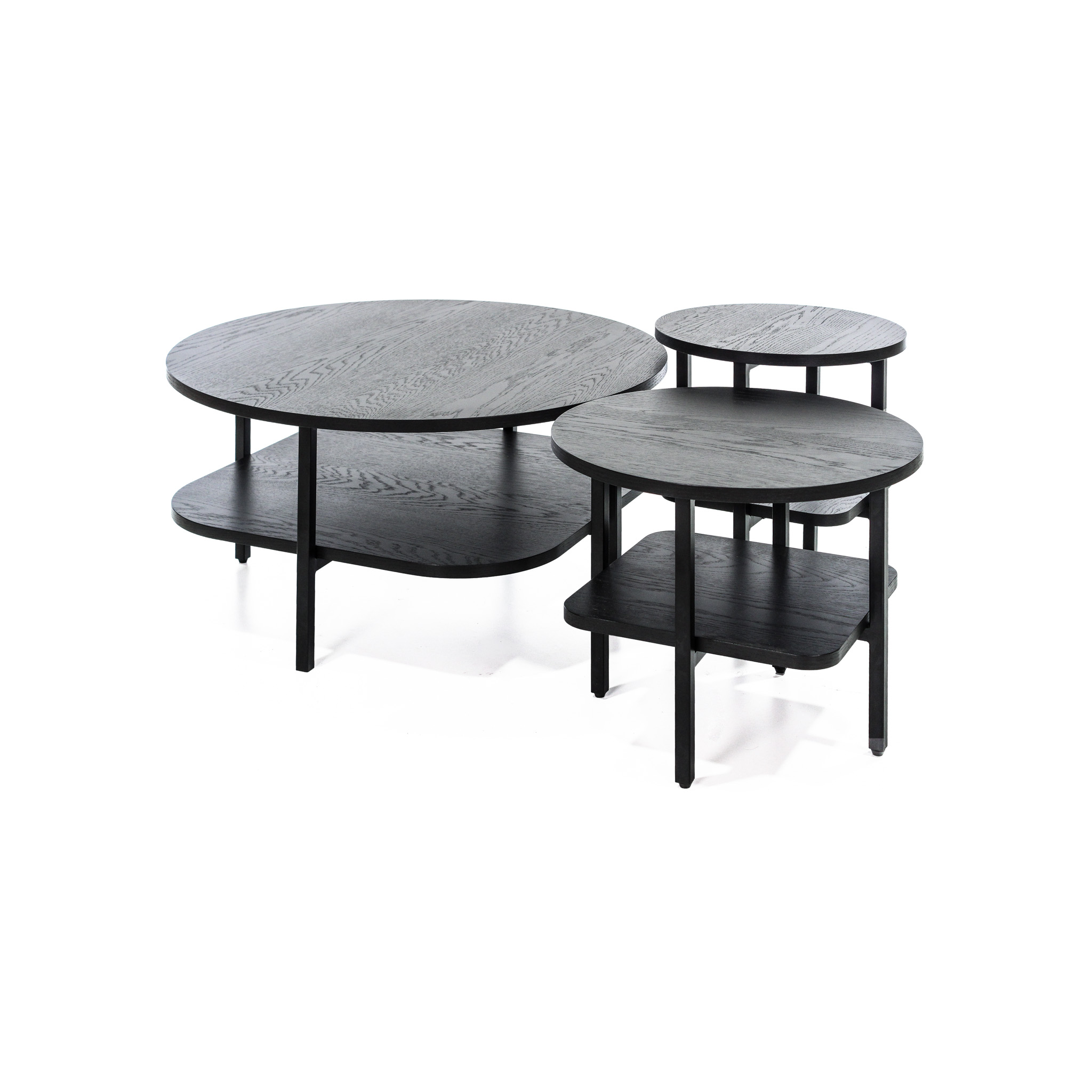 Este set de tres mesas de centro presenta un diseño moderno y funcional con dos niveles para mayor versatilidad. Su color negro y patas de metal negro le dan un toque contemporáneo y elegante.