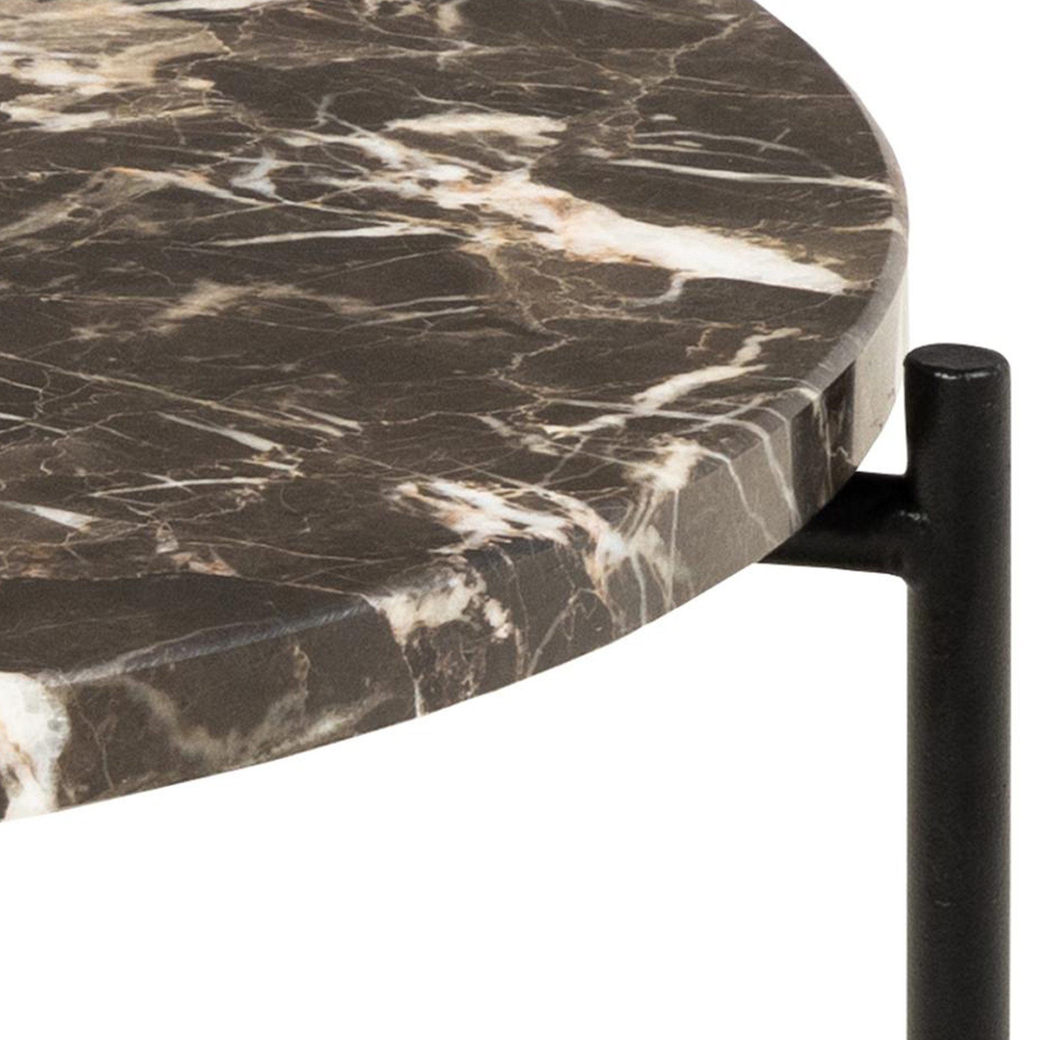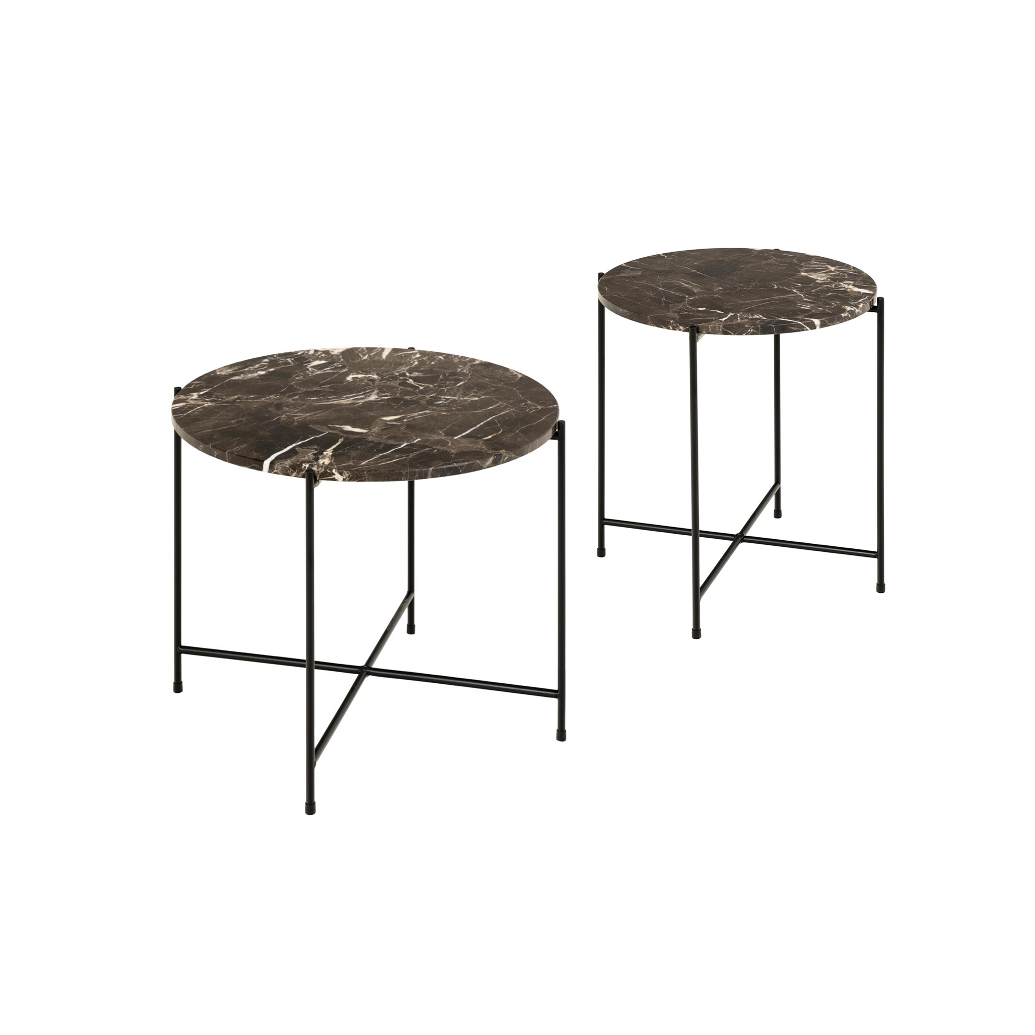 Este set de mesas de centro Avila destaca por su sobre de piedra en color chocolate, complementado con una base de metal negro que aporta un estilo industrial chic a cualquier salón.