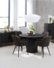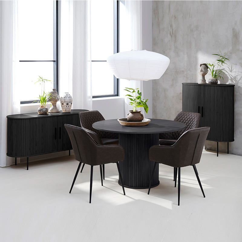 Mesa de comedor redonda modelo Nola en madera de roble con acabado negro, perfecta para un comedor moderno y elegante. Su diseño en acabado oscuro aporta un toque de sofisticación, convirtiéndose en una pieza central ideal para espacios contemporáneos.