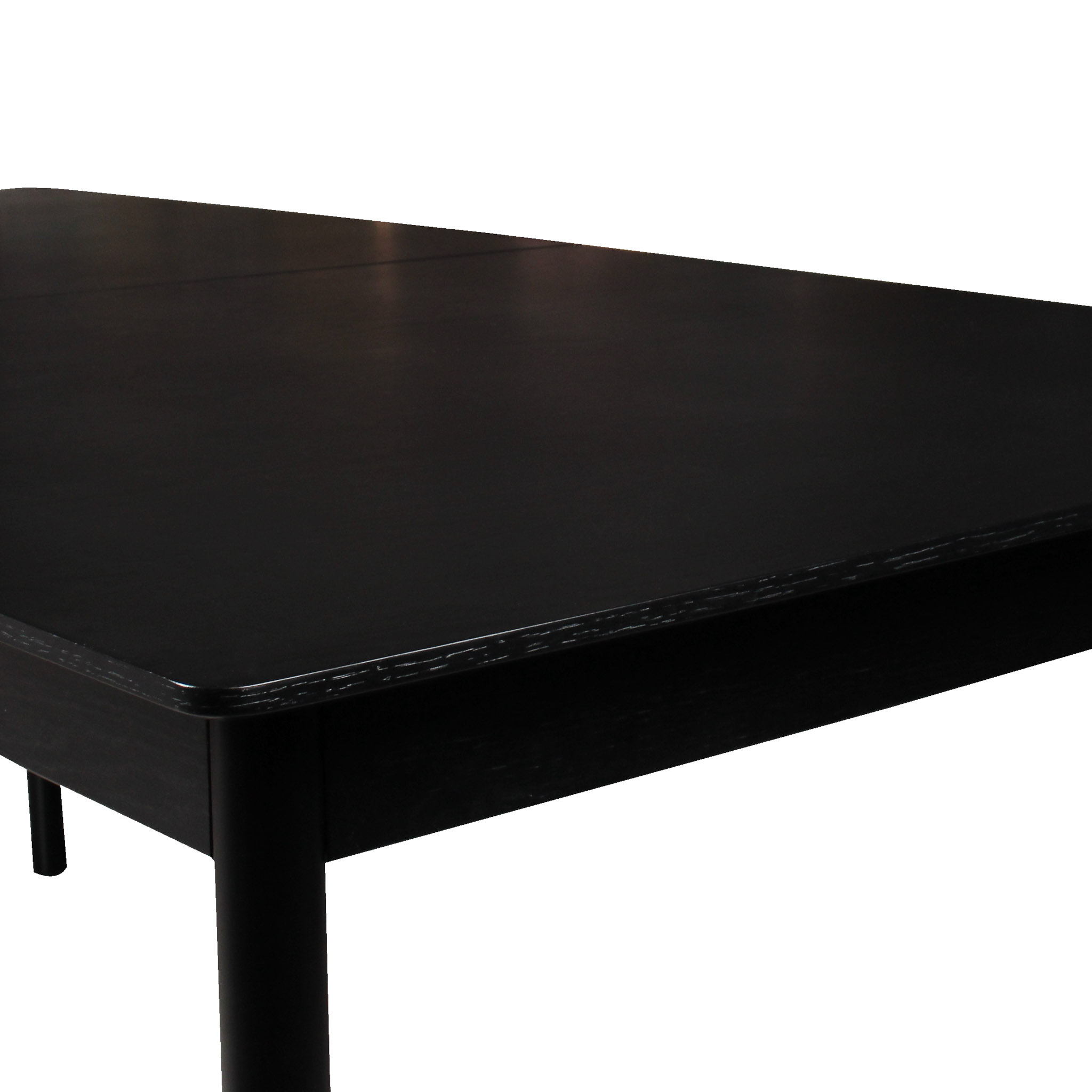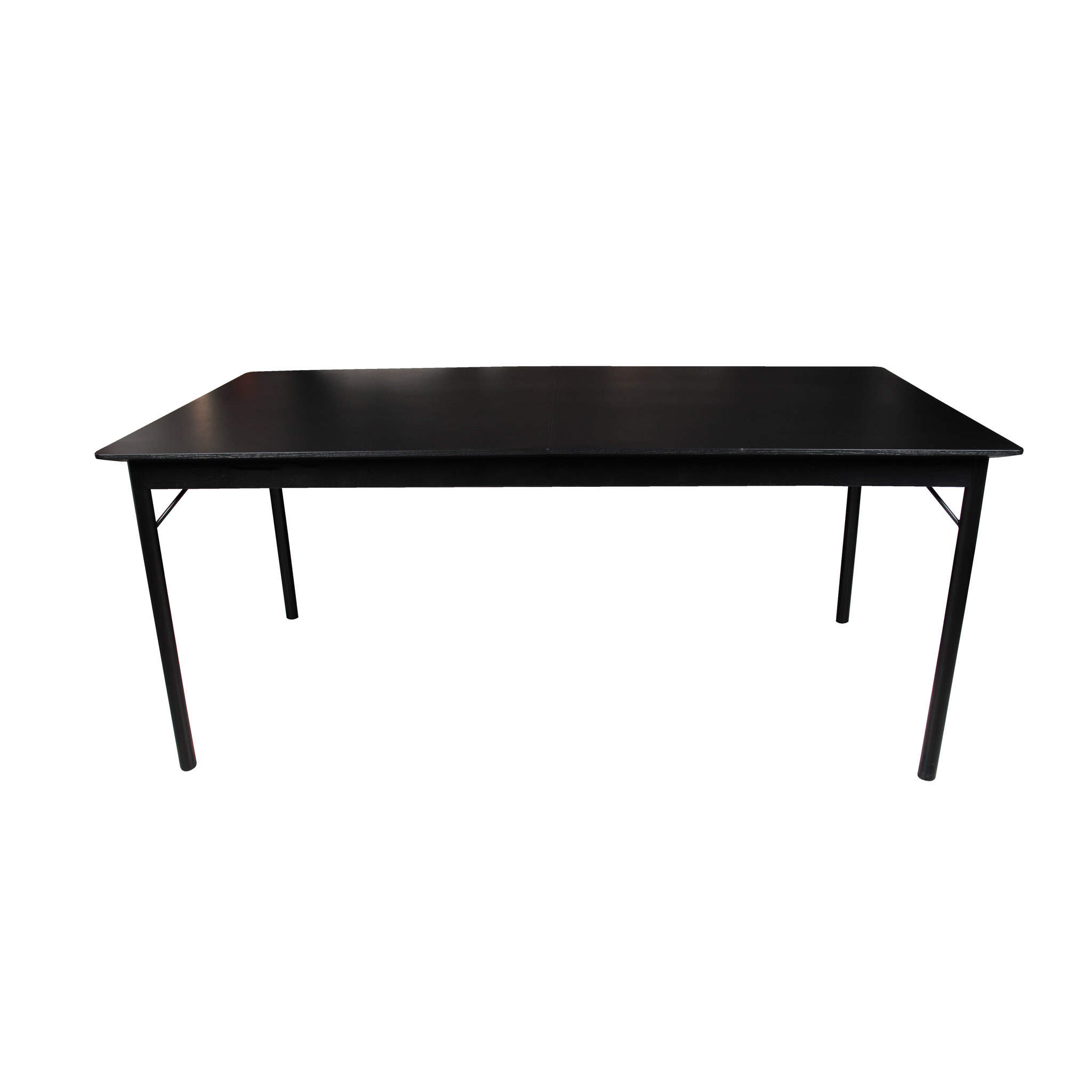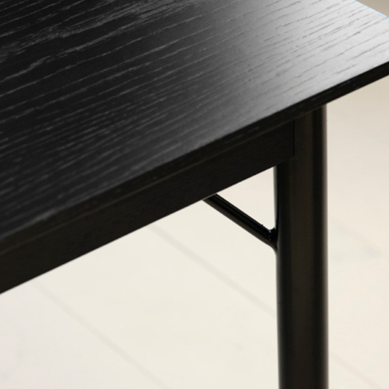 Mesa de comedor rectangular modelo Savona en madera de roble con acabado negro y patas de metal negro, ideal para un estilo contemporáneo y audaz. Su diseño monocromático y líneas limpias aportan elegancia y modernidad, convirtiéndola en una pieza central perfecta para comedores con carácter.