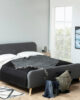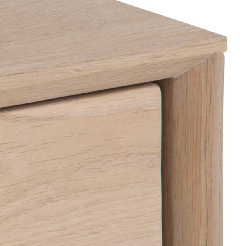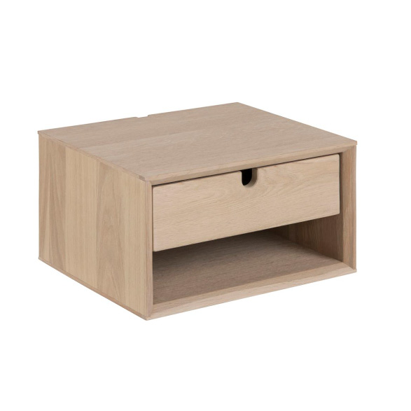 La mesa de noche Century presenta un diseño suspendido en madera oak clara con una gaveta, ideal para un look minimalista y elegante.