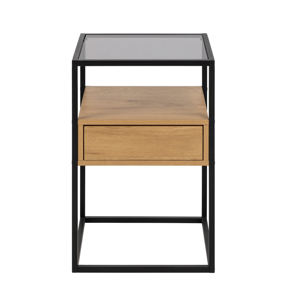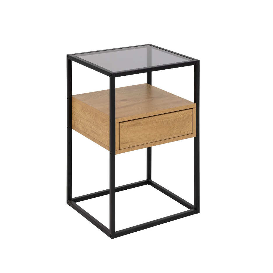 La mesa de noche Randolf combina un sobre de vidrio smoked con una gaveta de madera natural y patas de metal negro para un estilo contemporáneo.