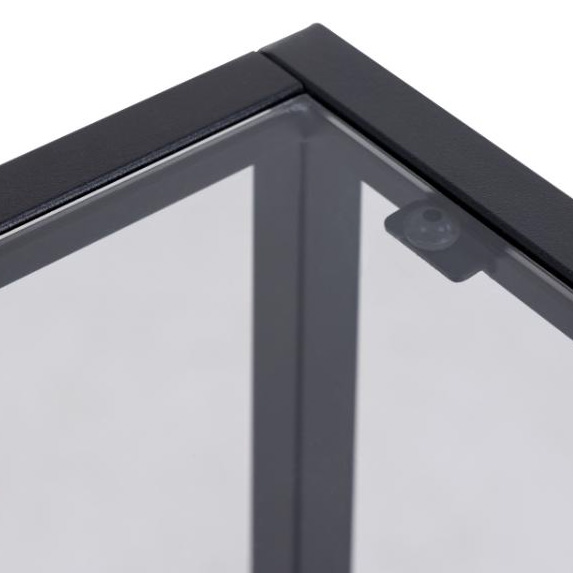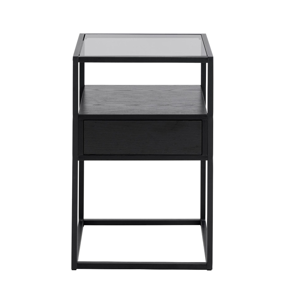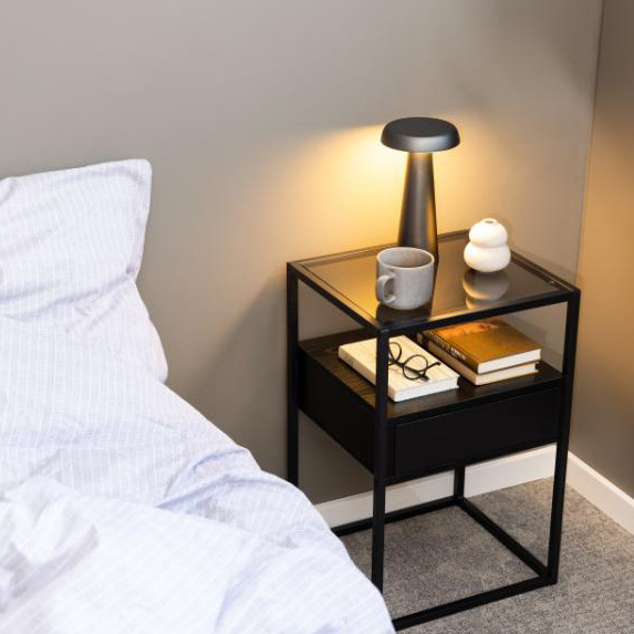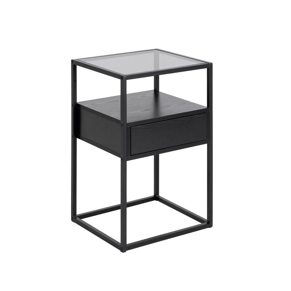 Esta versión del modelo Randolf cuenta con un sobre de vidrio smoked y una gaveta de madera negra, ideal para habitaciones con un estilo moderno y elegante.