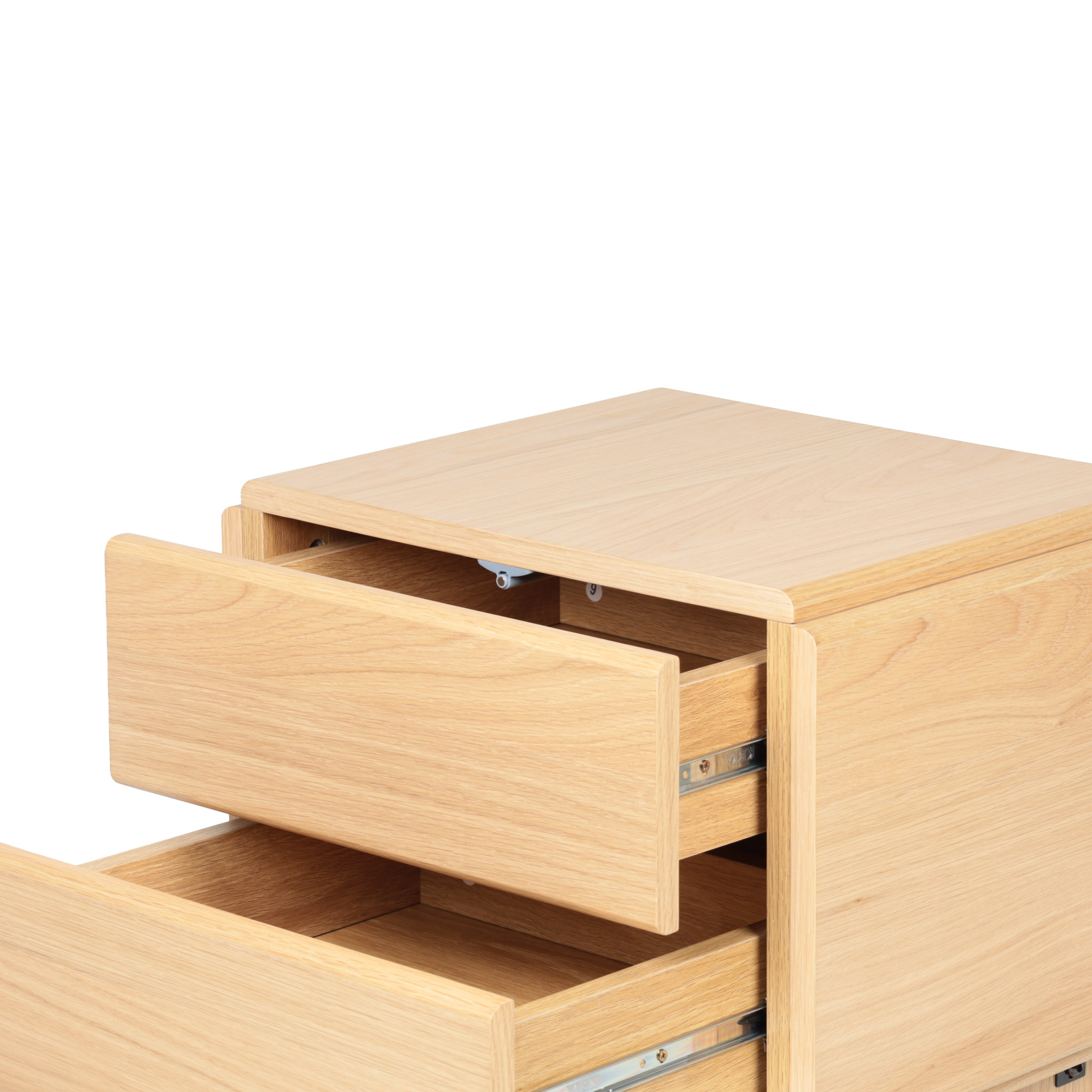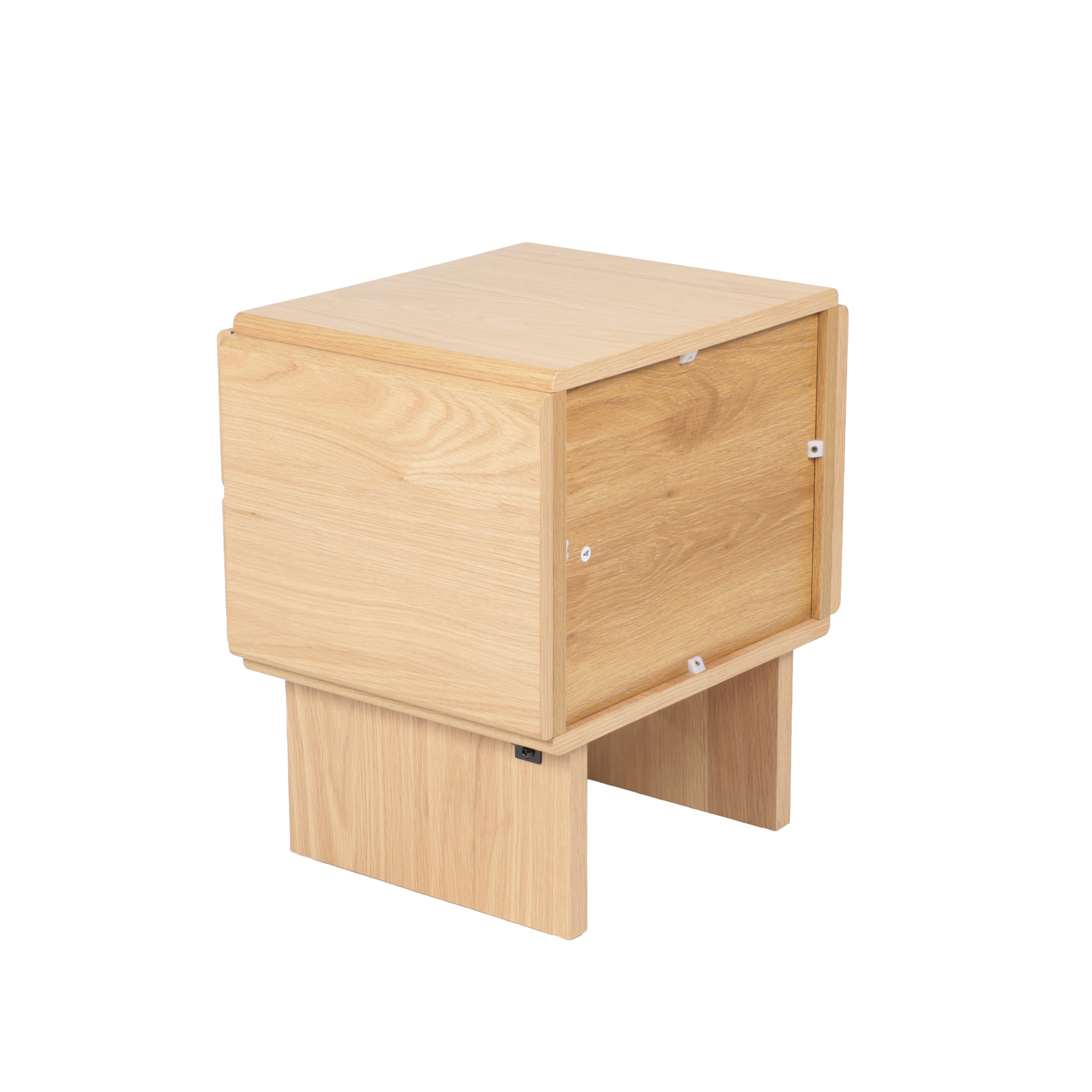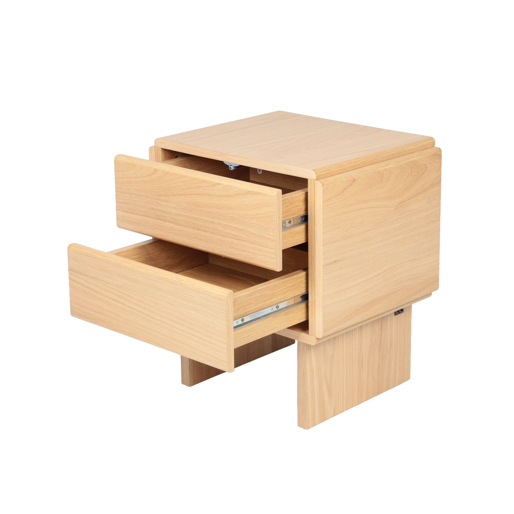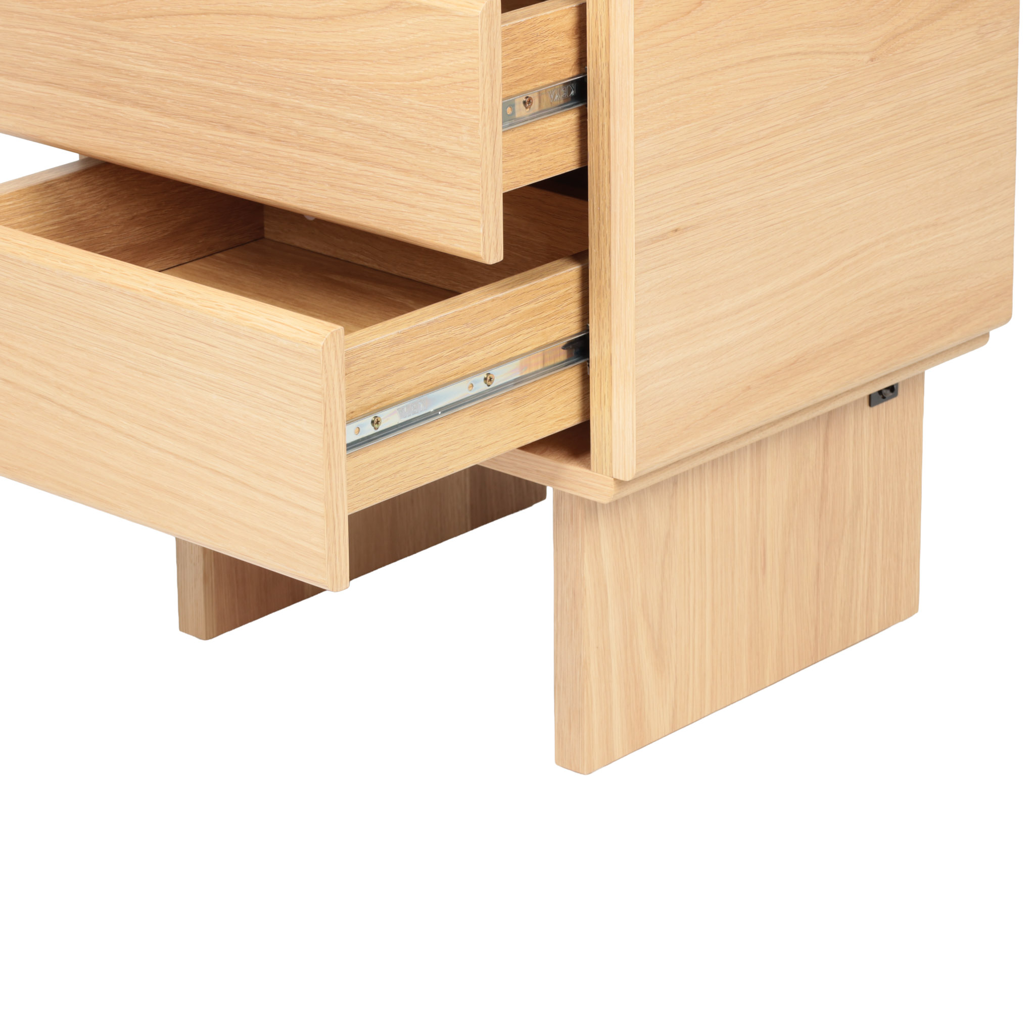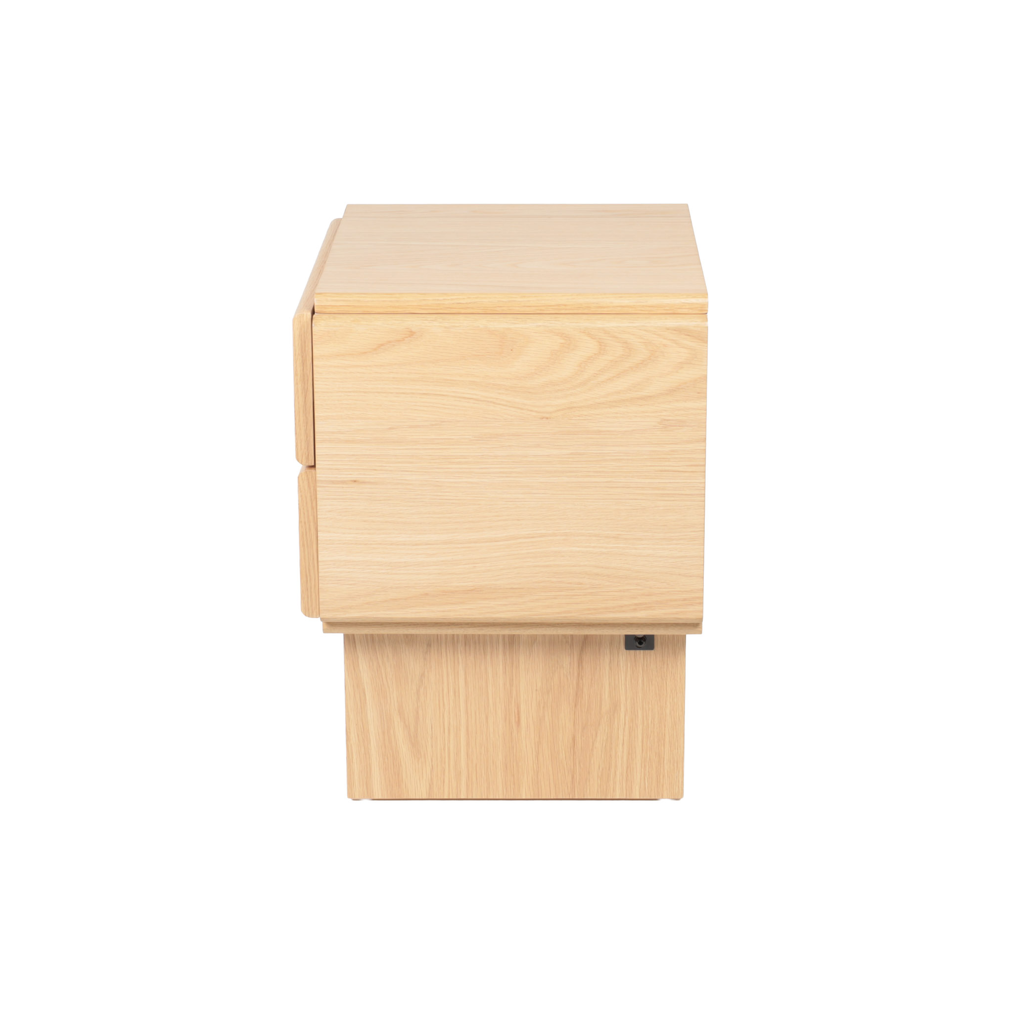 Diseño luminoso para espacios relajantes. Elaborada en MDF y veneer de roble claro, cuenta con 2 gavetas y líneas depuradas que transmiten serenidad y orden. Perfecta para complementar una decoración suave y contemporánea.