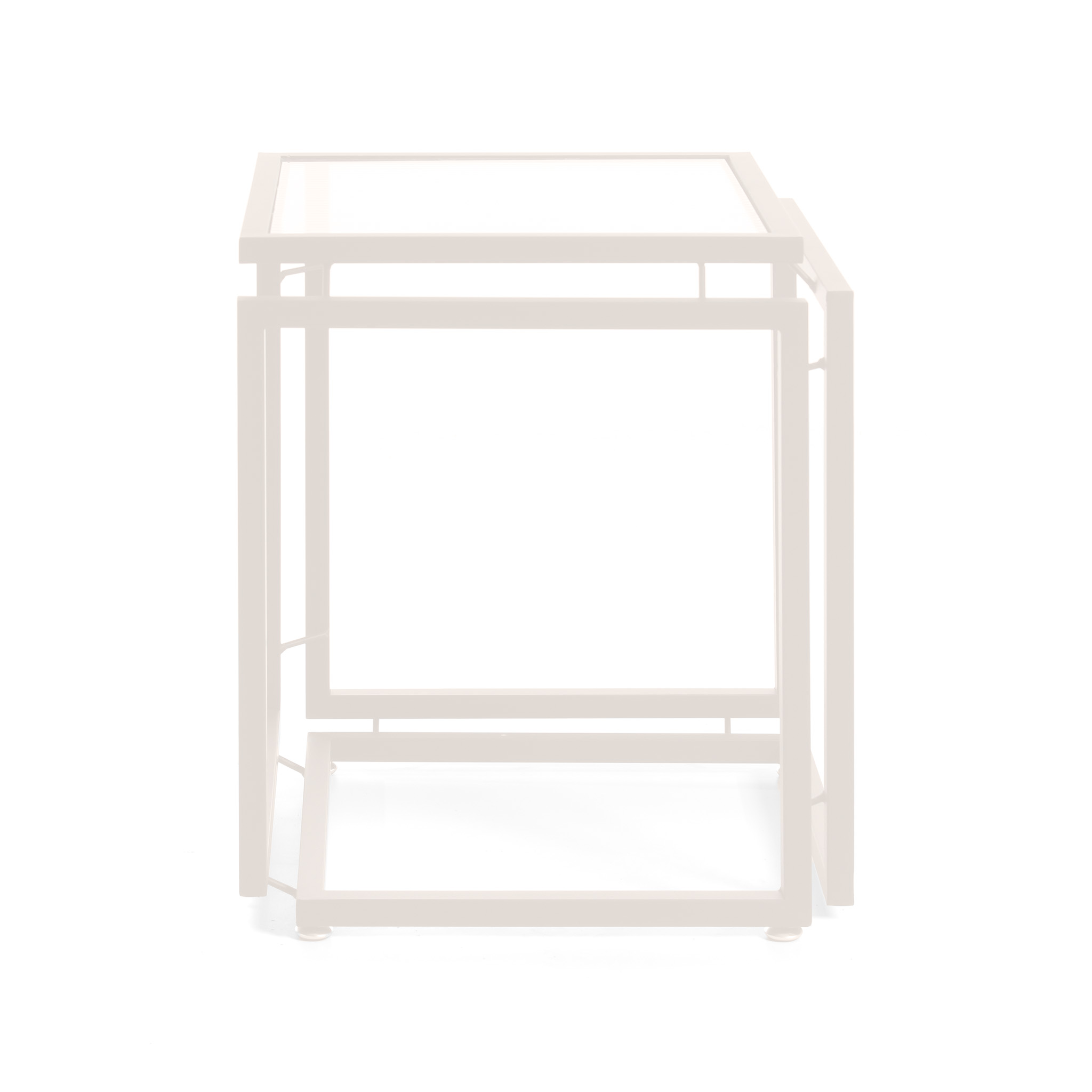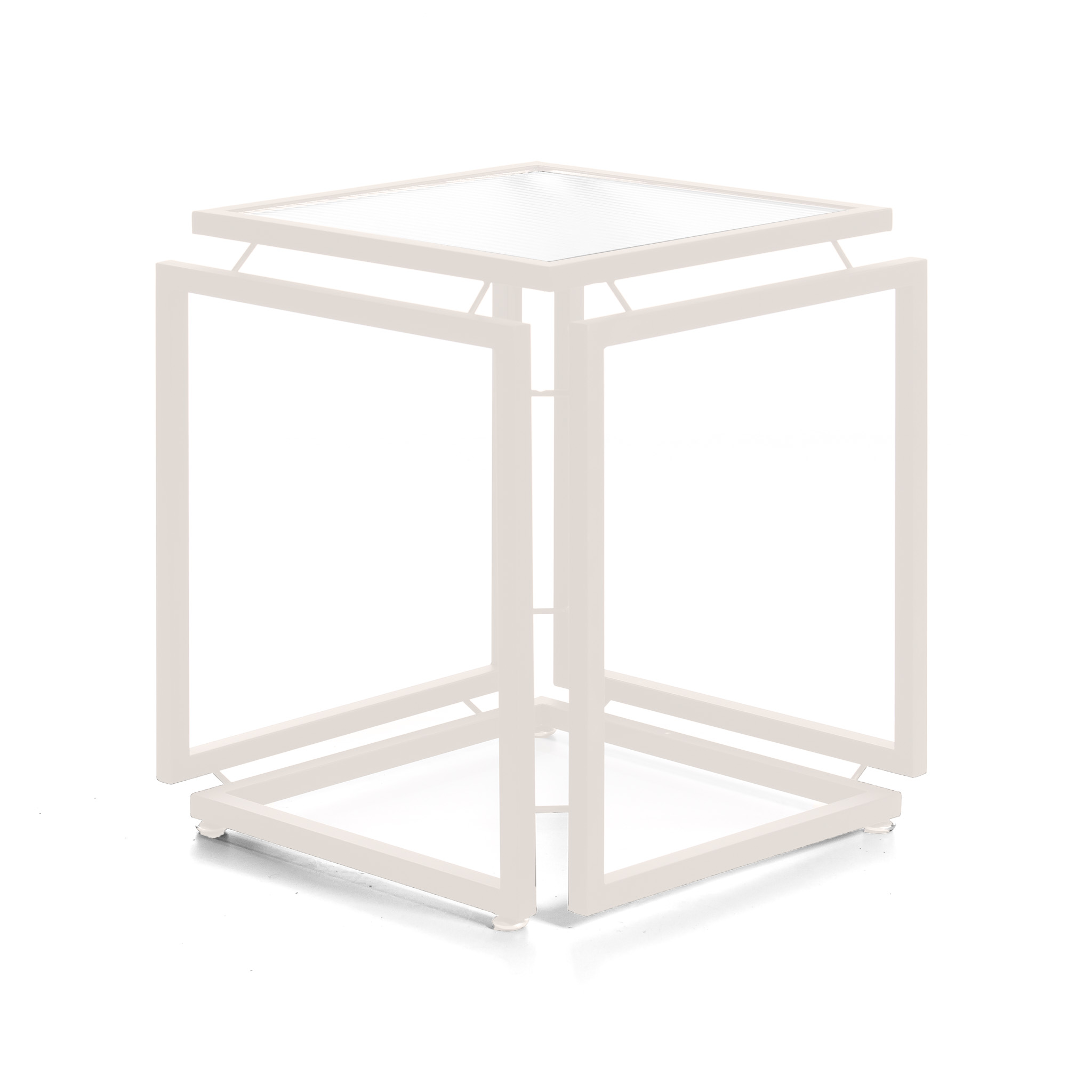 Mesa lateral de metal blanco con un diseño moderno en forma de cubo, completada con un elegante sobre de vidrio.