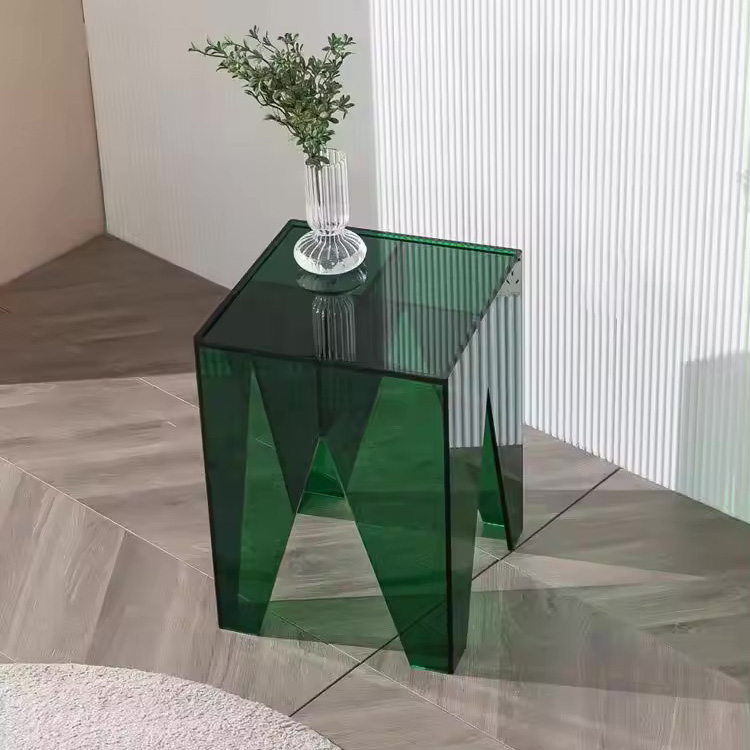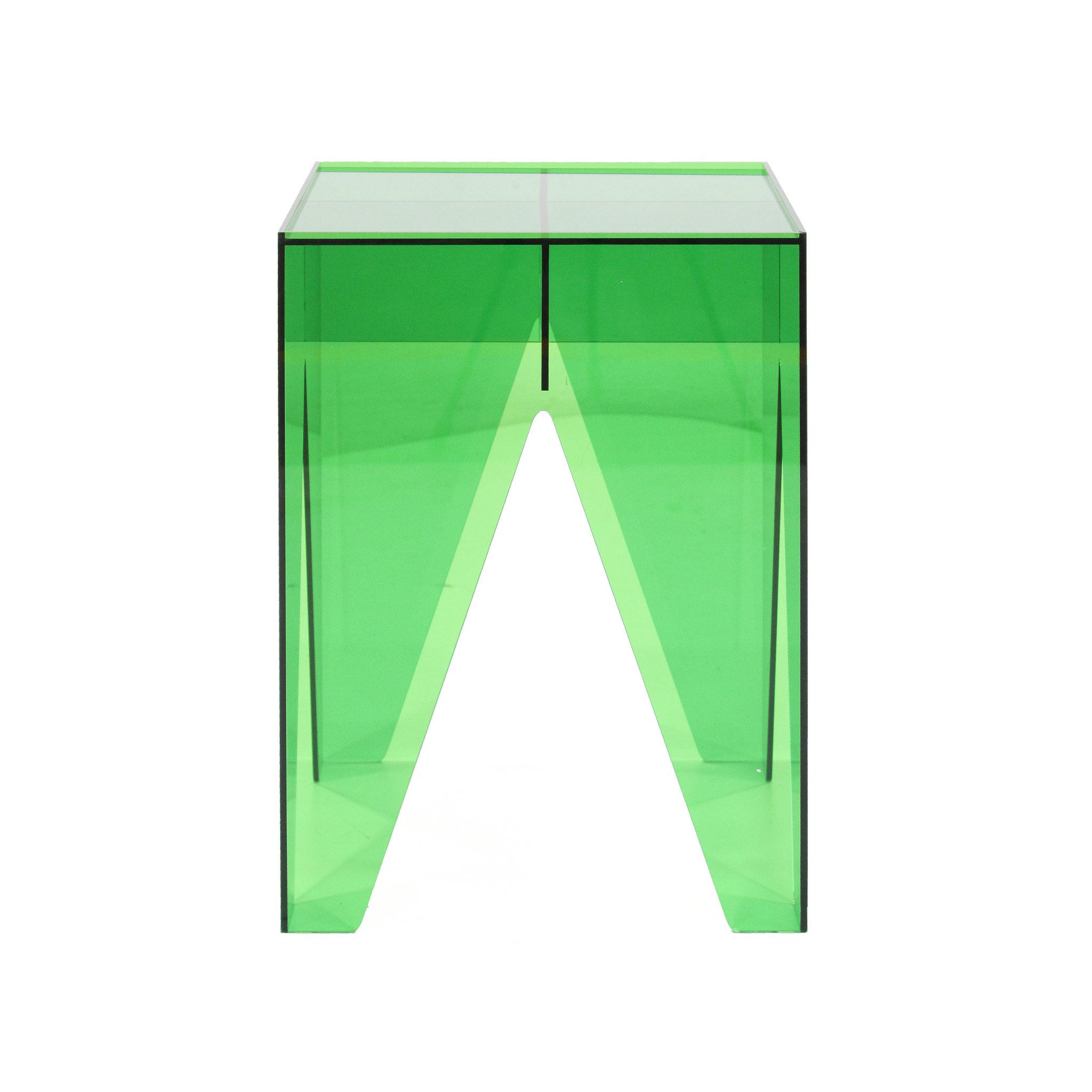 Mesa lateral fabricada en acrílico verde, con un diseño moderno y divertido. Esta mesa es perfecta para añadir un toque de color y estilo contemporáneo a cualquier sala de estar o dormitorio. Su material duradero y su estética llamativa la convierten en una pieza versátil y funcional para tu hogar.
