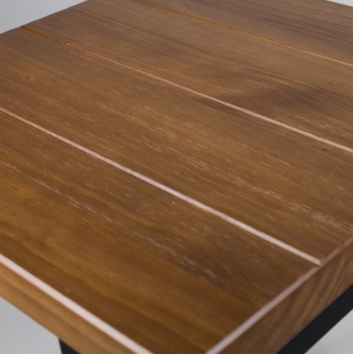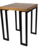 Mesa lateral con sobre de madera en color chocolate y base de metal en color negro.