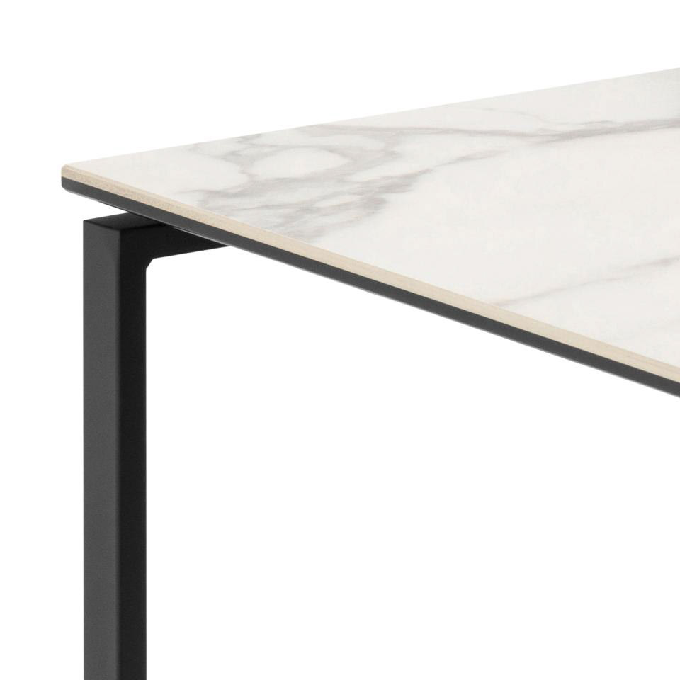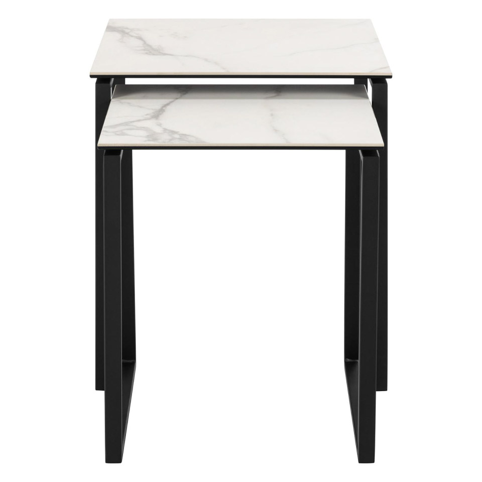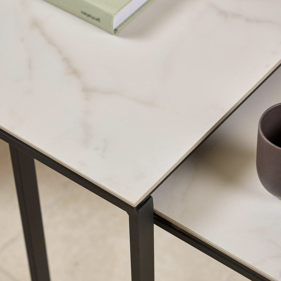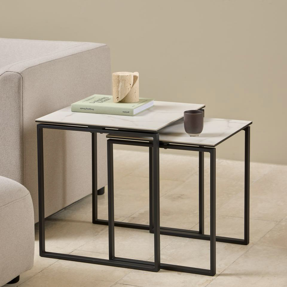Set de dos mesas laterales con sobre de cerámica blanca Akranes y base de metal negro. Su diseño moderno y versátil permite usarlas juntas o por separado, aportando elegancia y practicidad a la decoración.