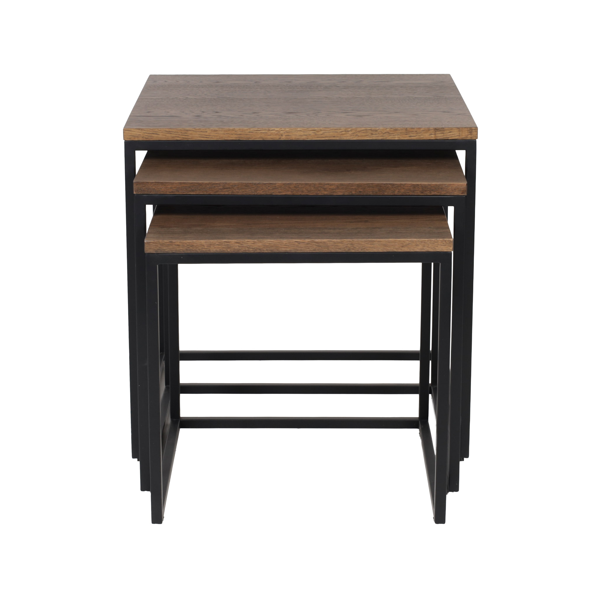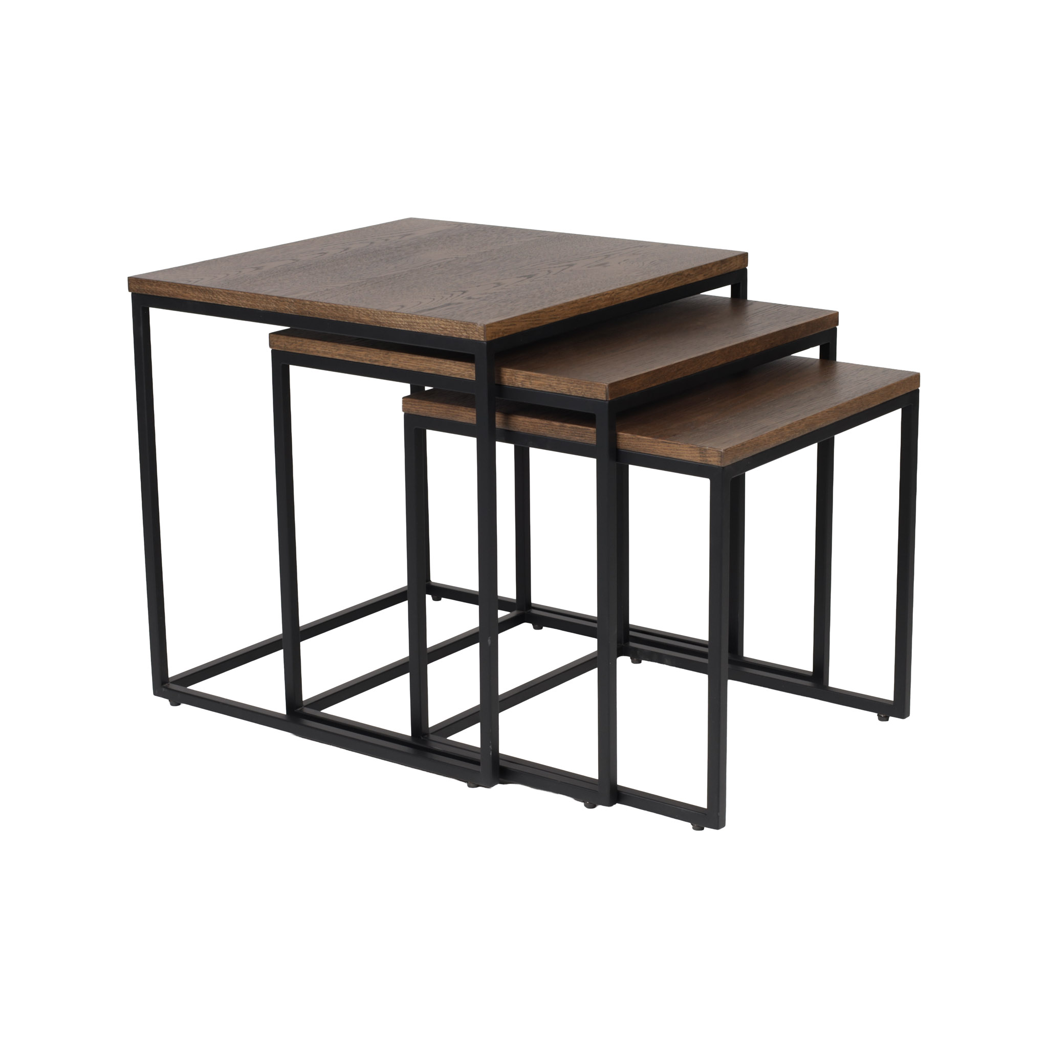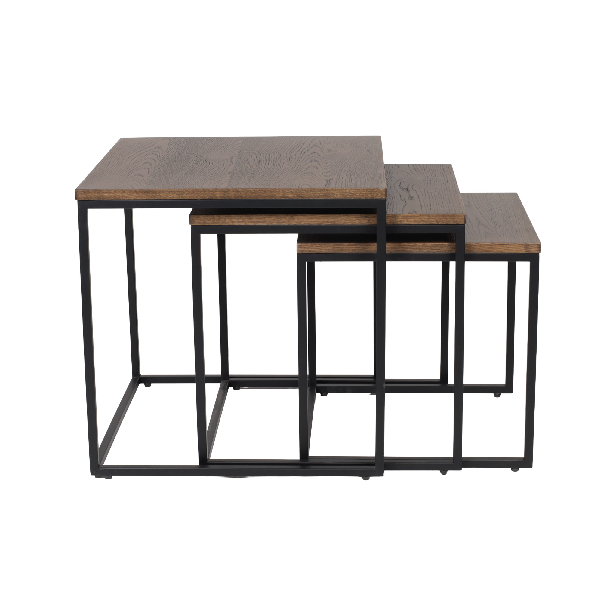 Versatilidad y diseño modular. Este set incluye tres mesas en distintos tamaños, elaboradas en madera con acabado ahumado y base metálica negra. Ideales para usarse juntas o por separado.