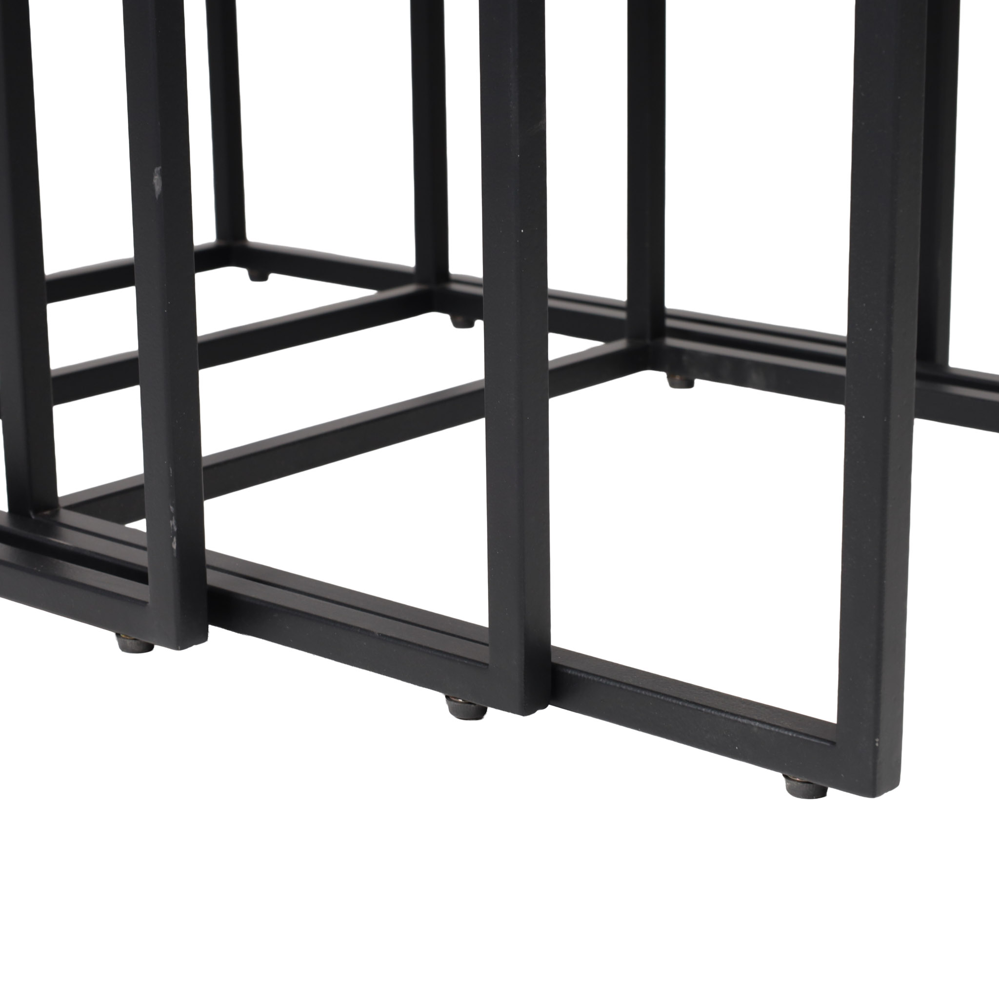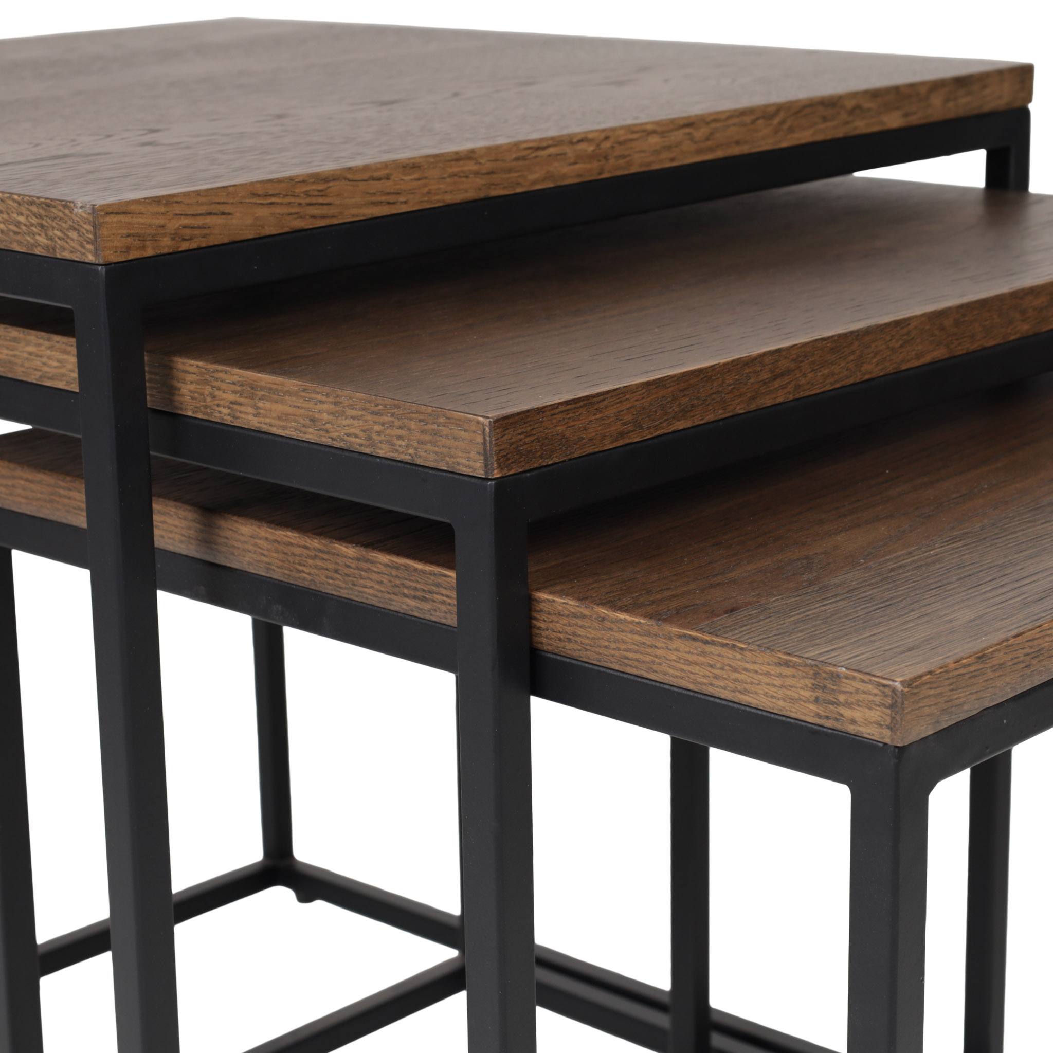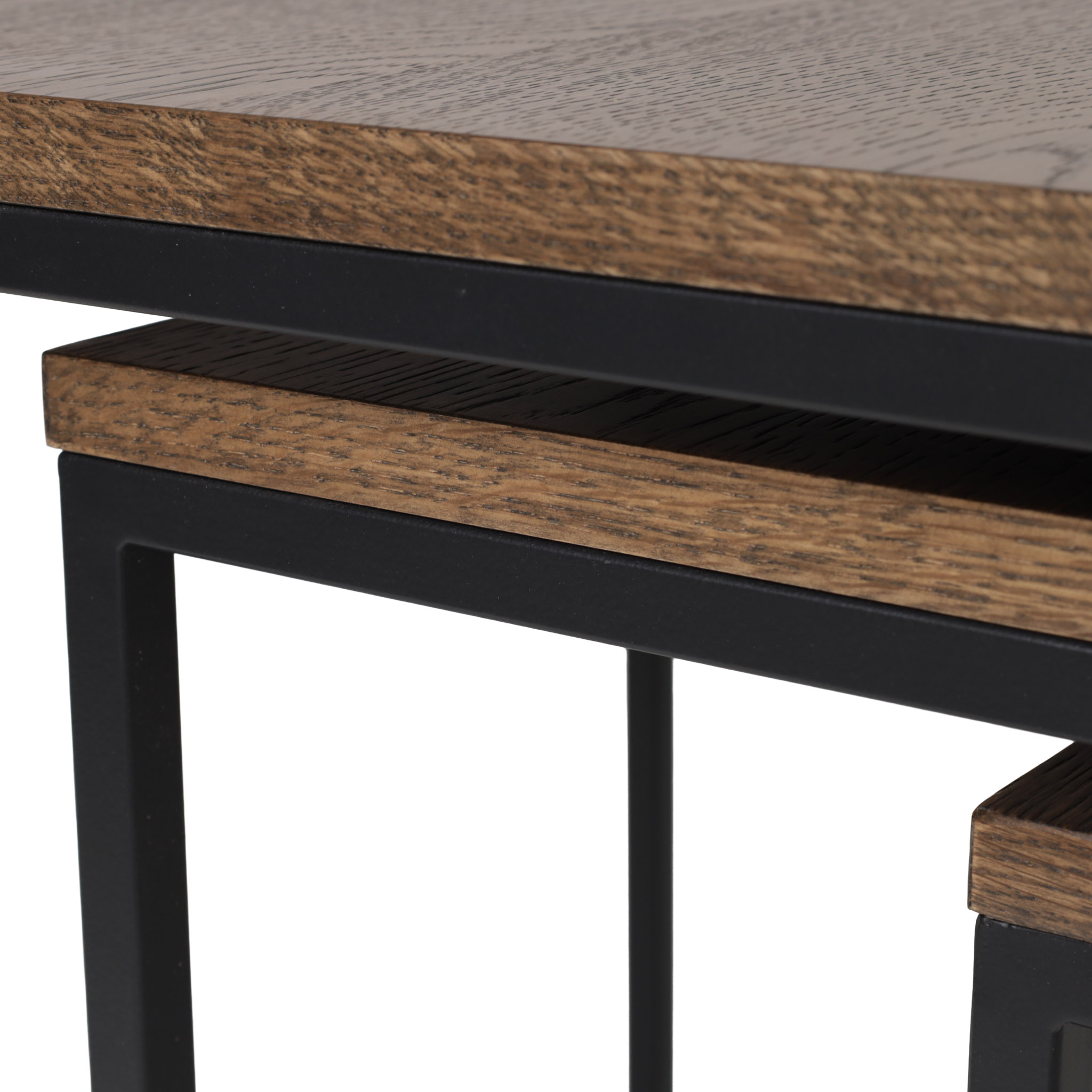 Versatilidad y diseño modular. Este set incluye tres mesas en distintos tamaños, elaboradas en madera con acabado ahumado y base metálica negra. Ideales para usarse juntas o por separado.
