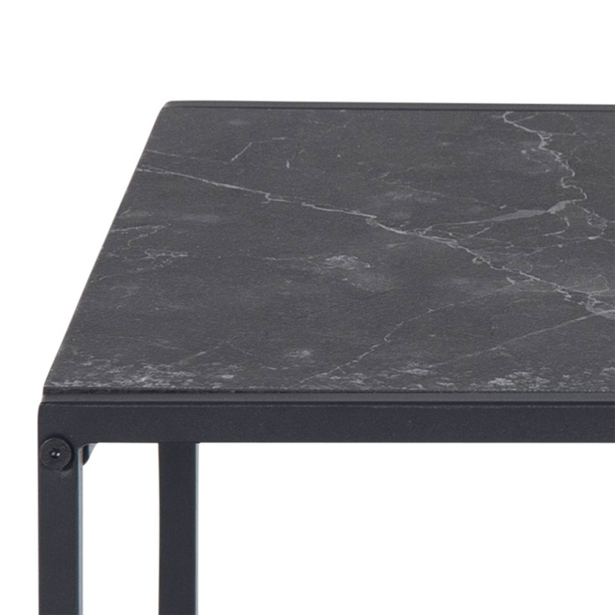 Textura y elegancia en cada rincón. Estas mesas presentan sobres de melanina con acabado marmoleado en negro y bases de metal negro, combinando sofisticación y versatilidad para ambientes modernos.