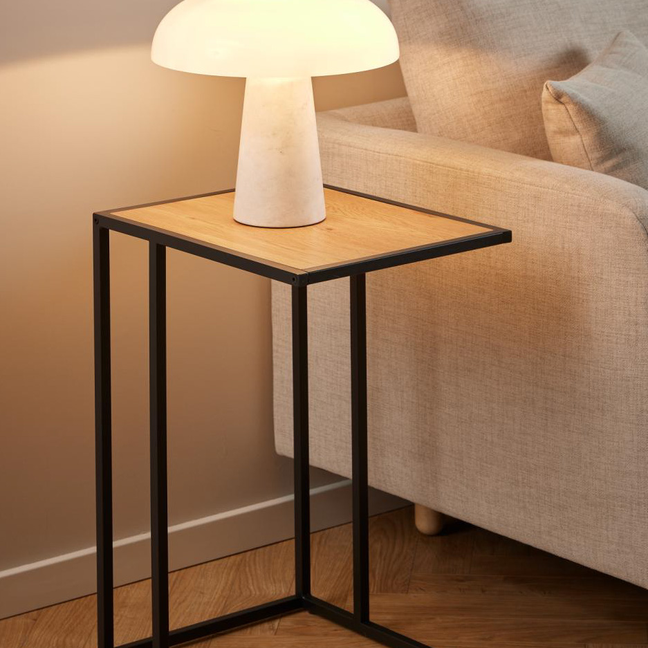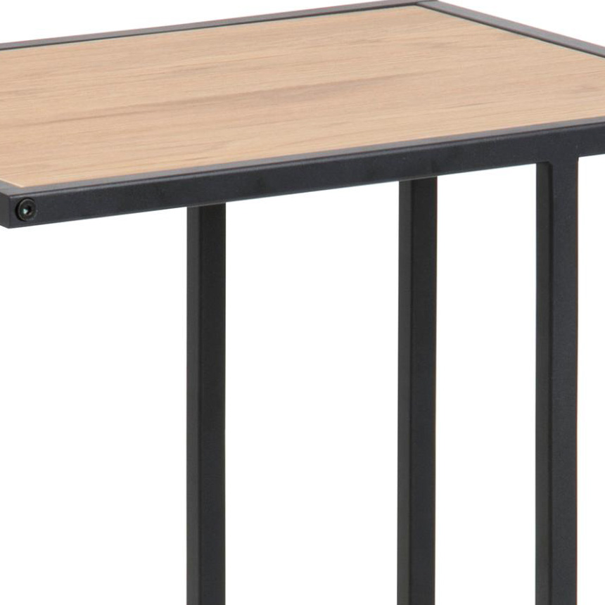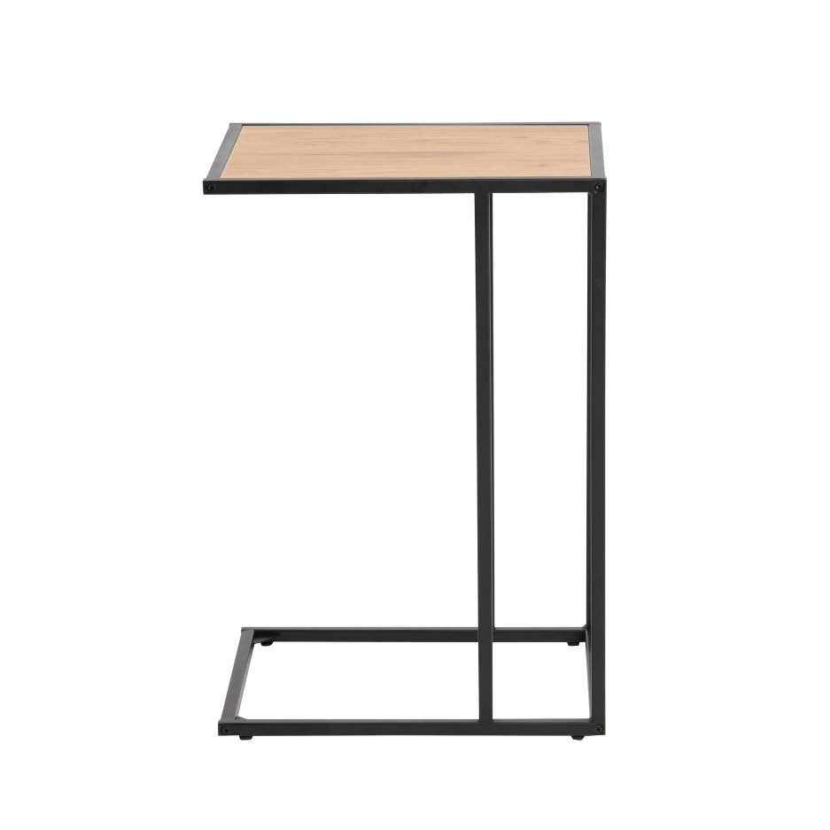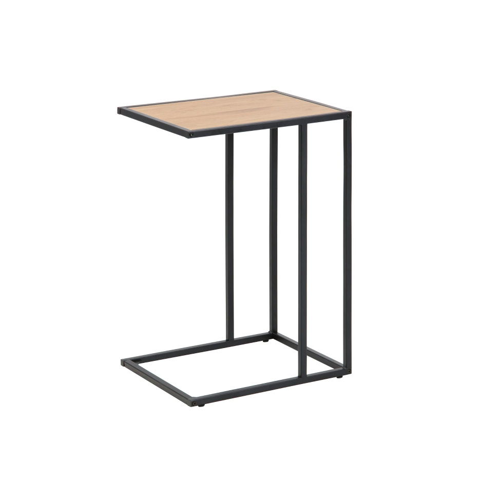 La mesa lateral Seaford combina un sobre de madera natural con una base de metal negro, ideal para complementar el salón o el dormitorio con un toque moderno y funcional.