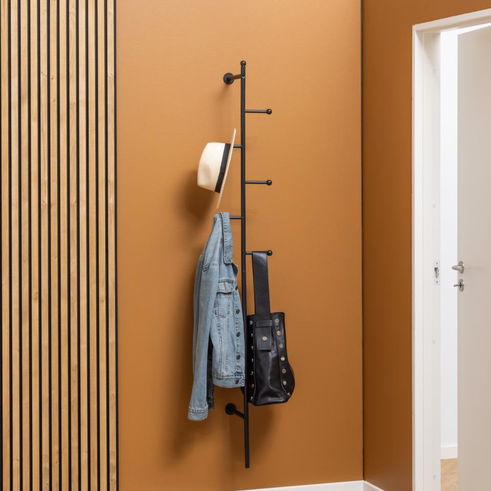 El perchero Aspen, con su estructura de metal negro, ofrece un diseño moderno y funcional para entradas o vestíbulos.