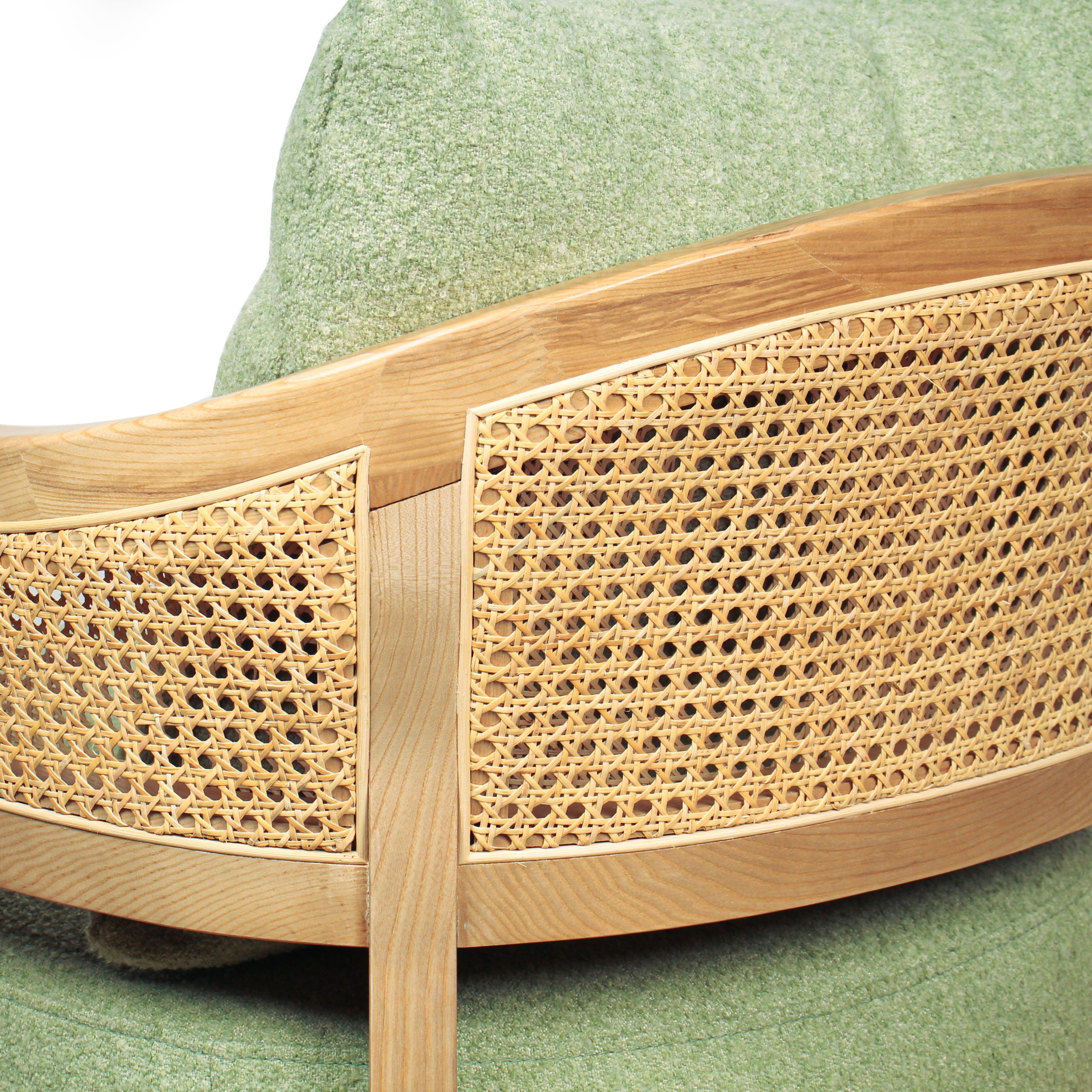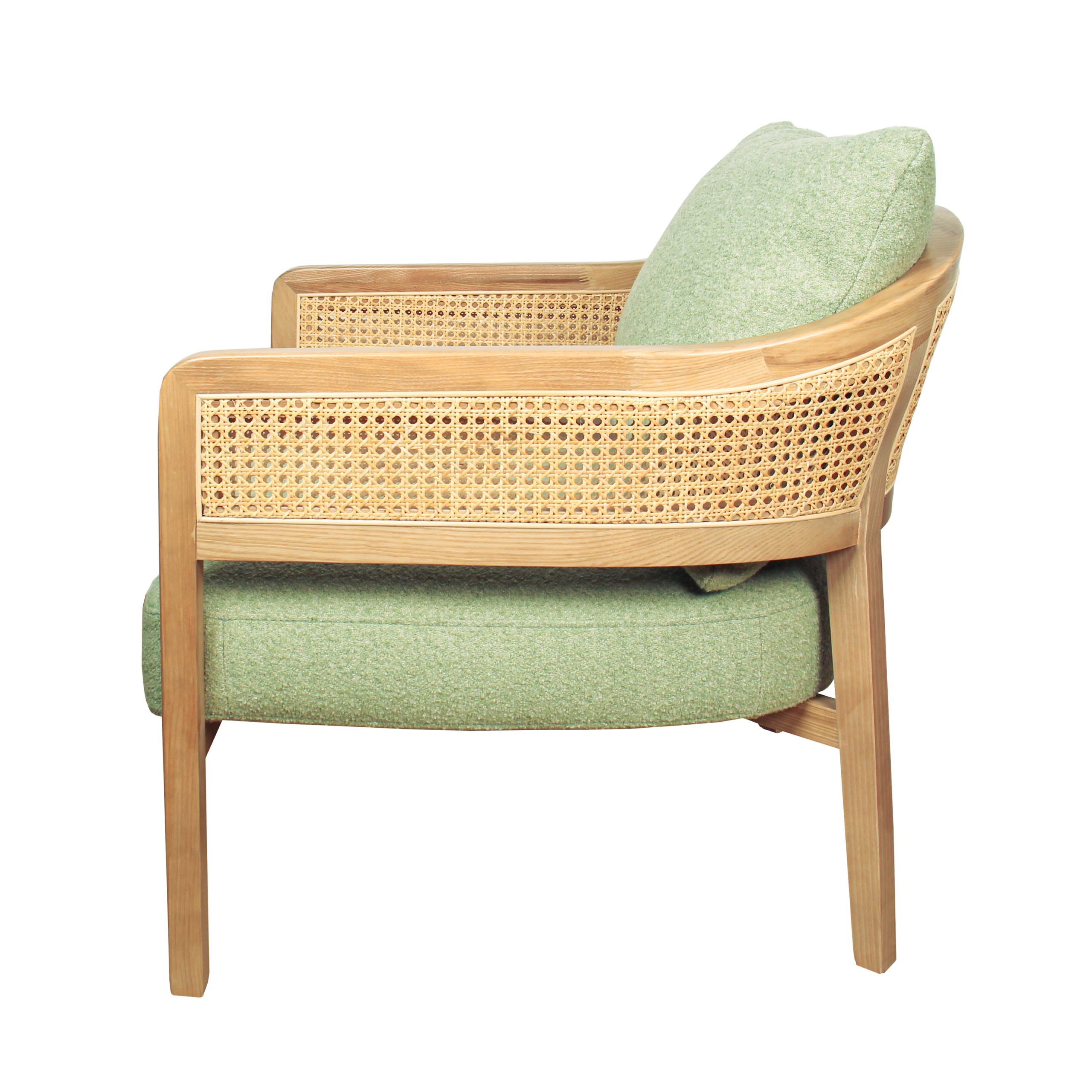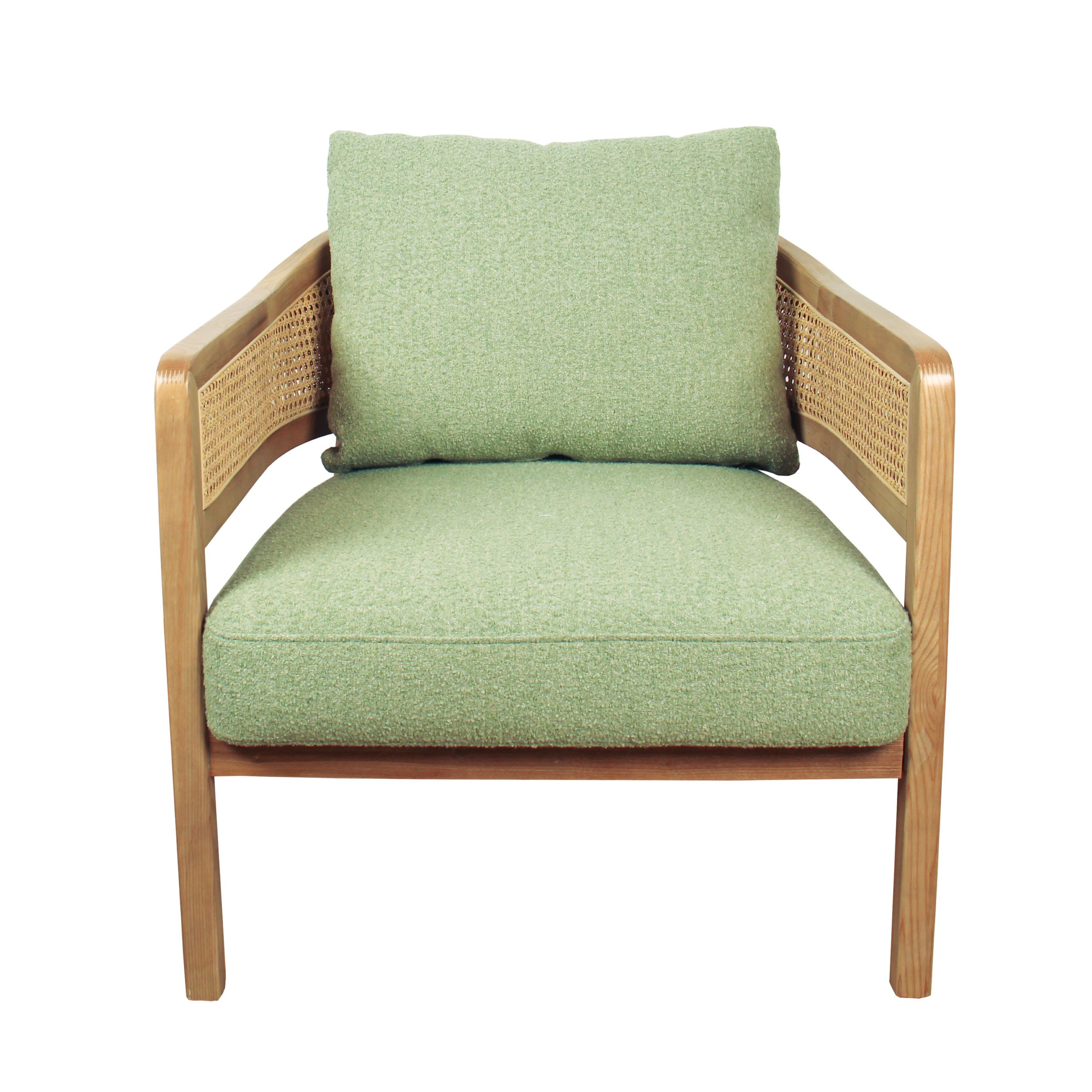 Poltrona de tela en verde menta con detalles únicos en brazos de mimbre. Su diseño combina frescura y calidez para cualquier ambiente. Ideal para agregar estilo y comodidad a tu espacio.