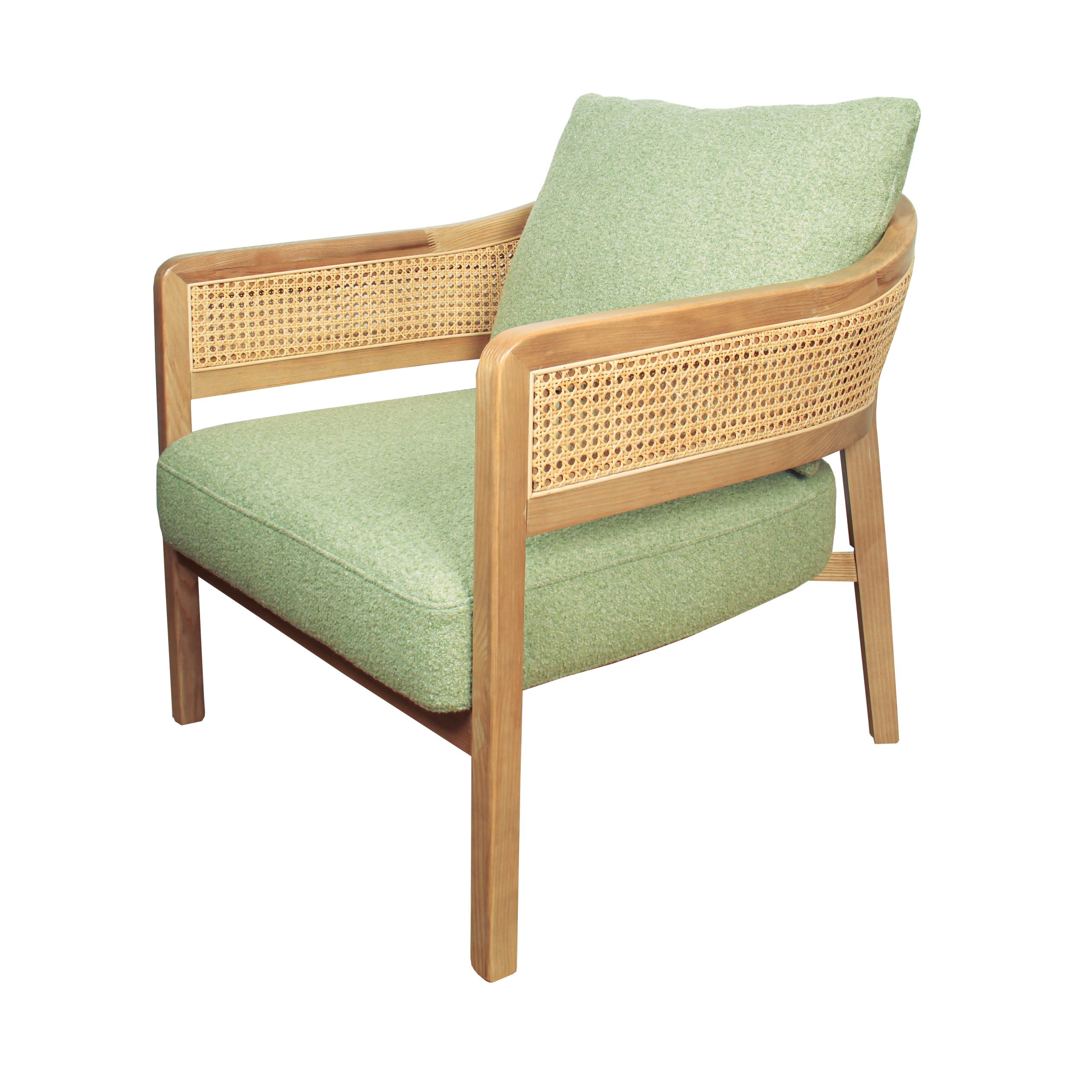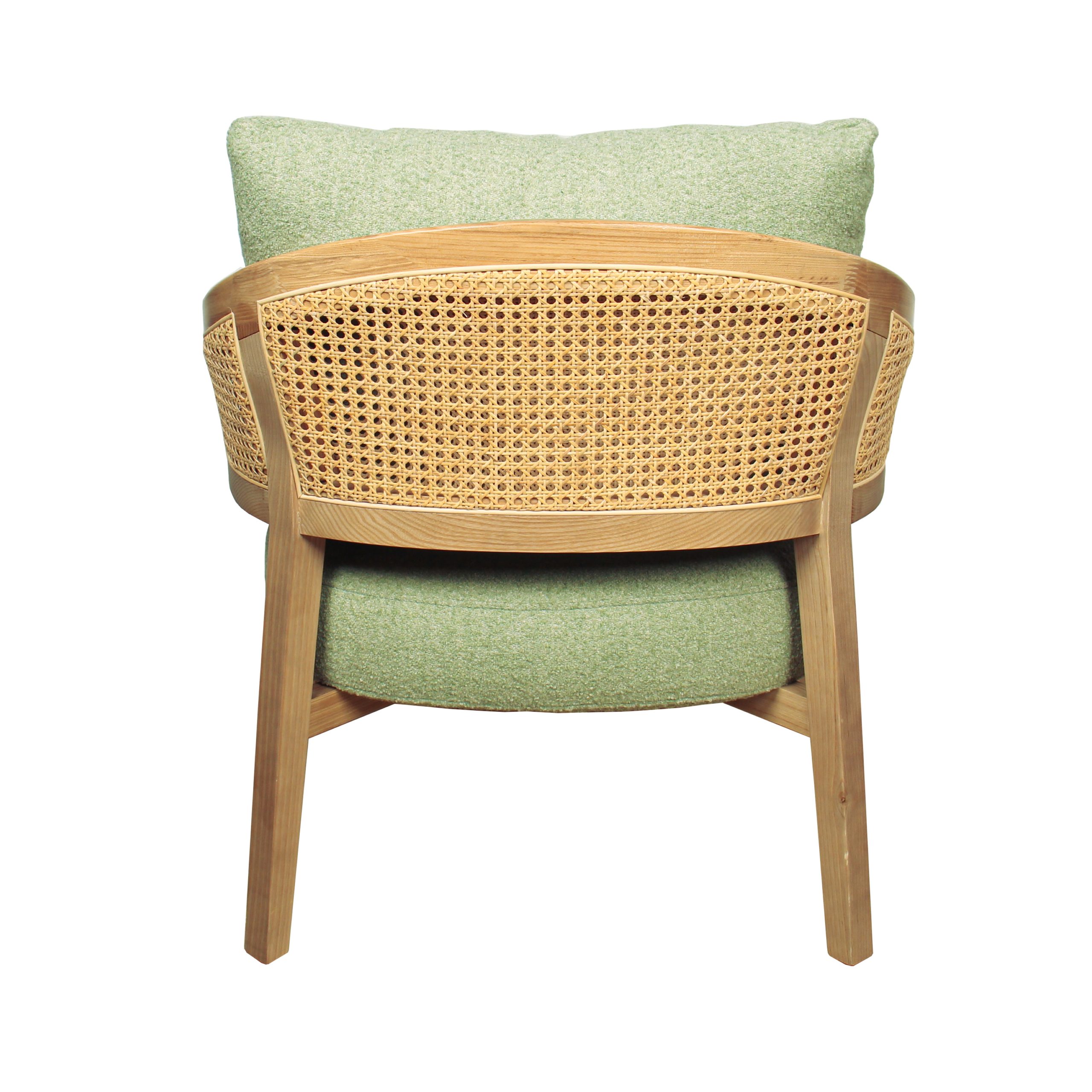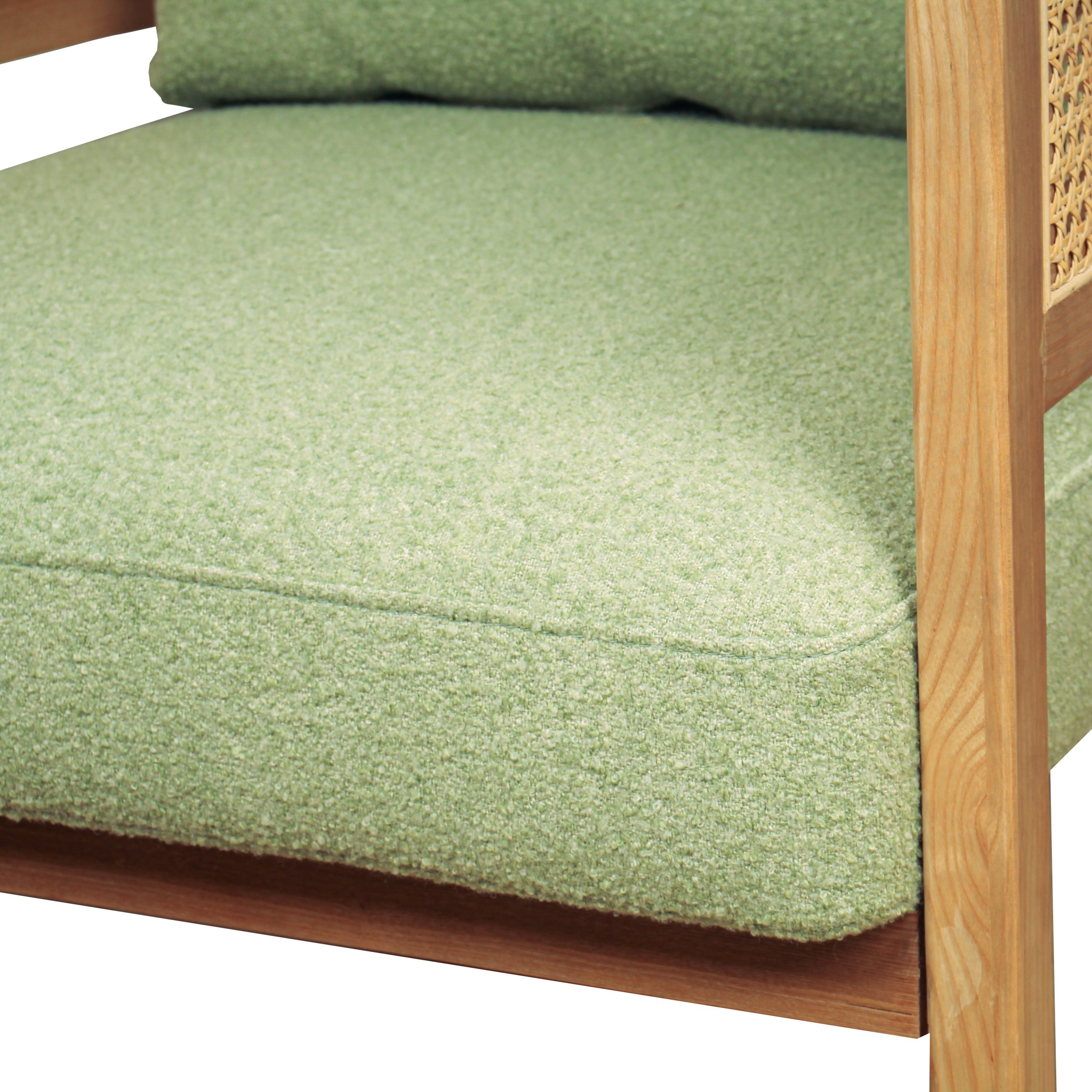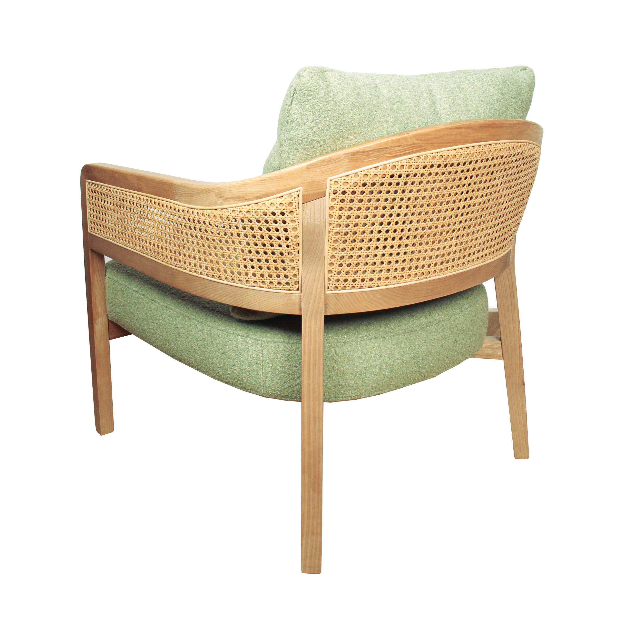 Poltrona de tela en verde menta con detalles únicos en brazos de mimbre. Su diseño combina frescura y calidez para cualquier ambiente. Ideal para agregar estilo y comodidad a tu espacio.
