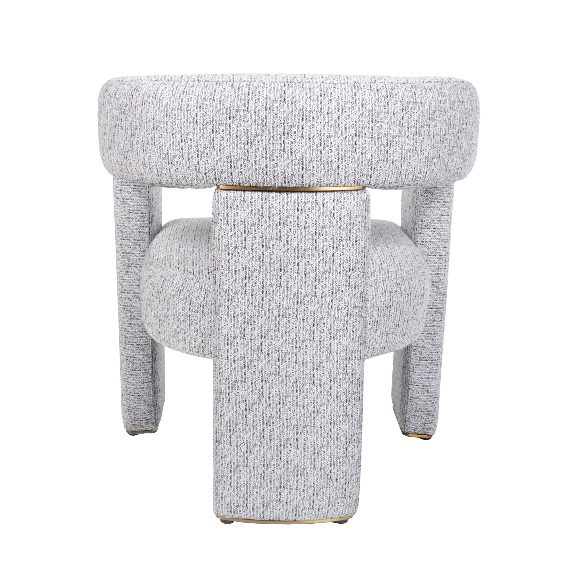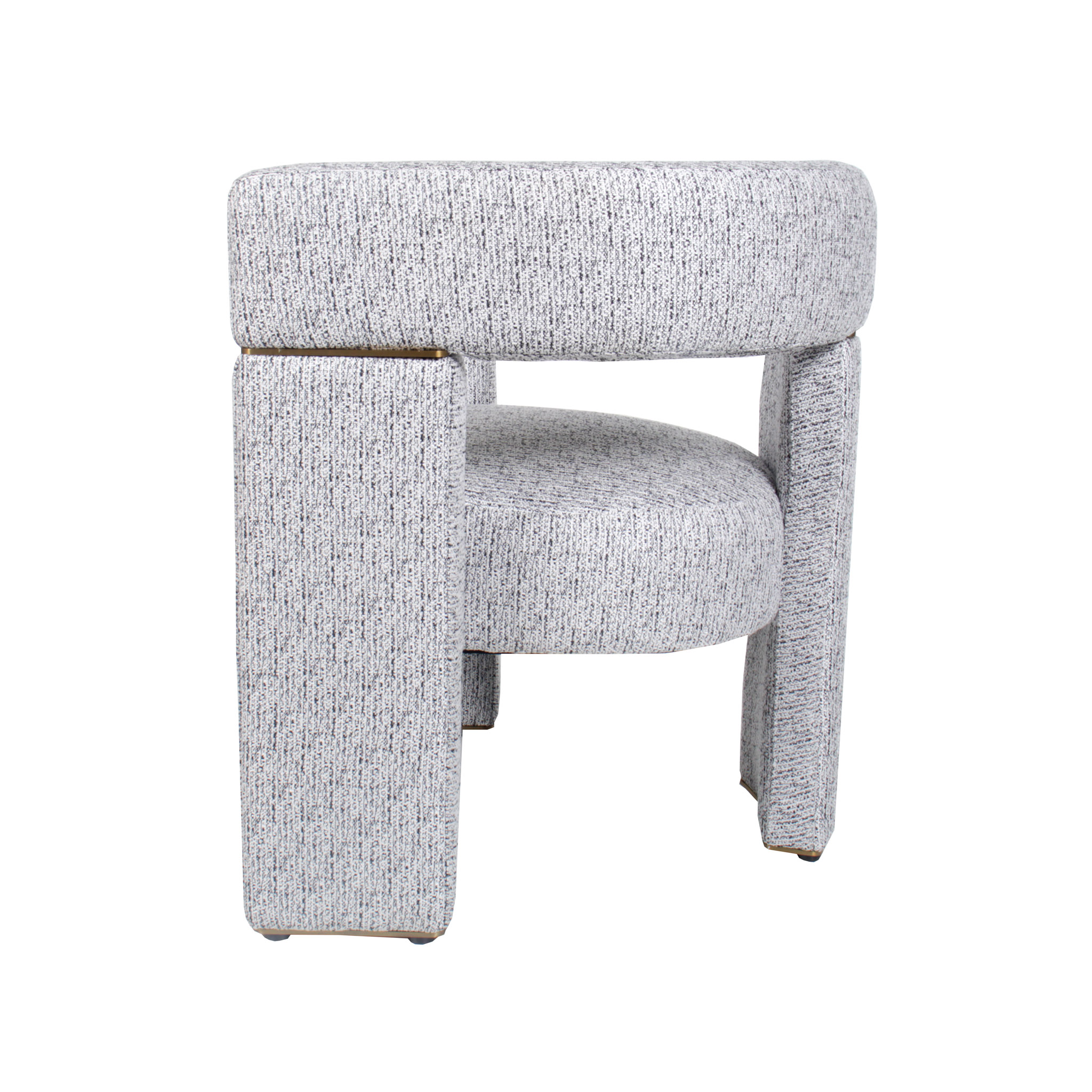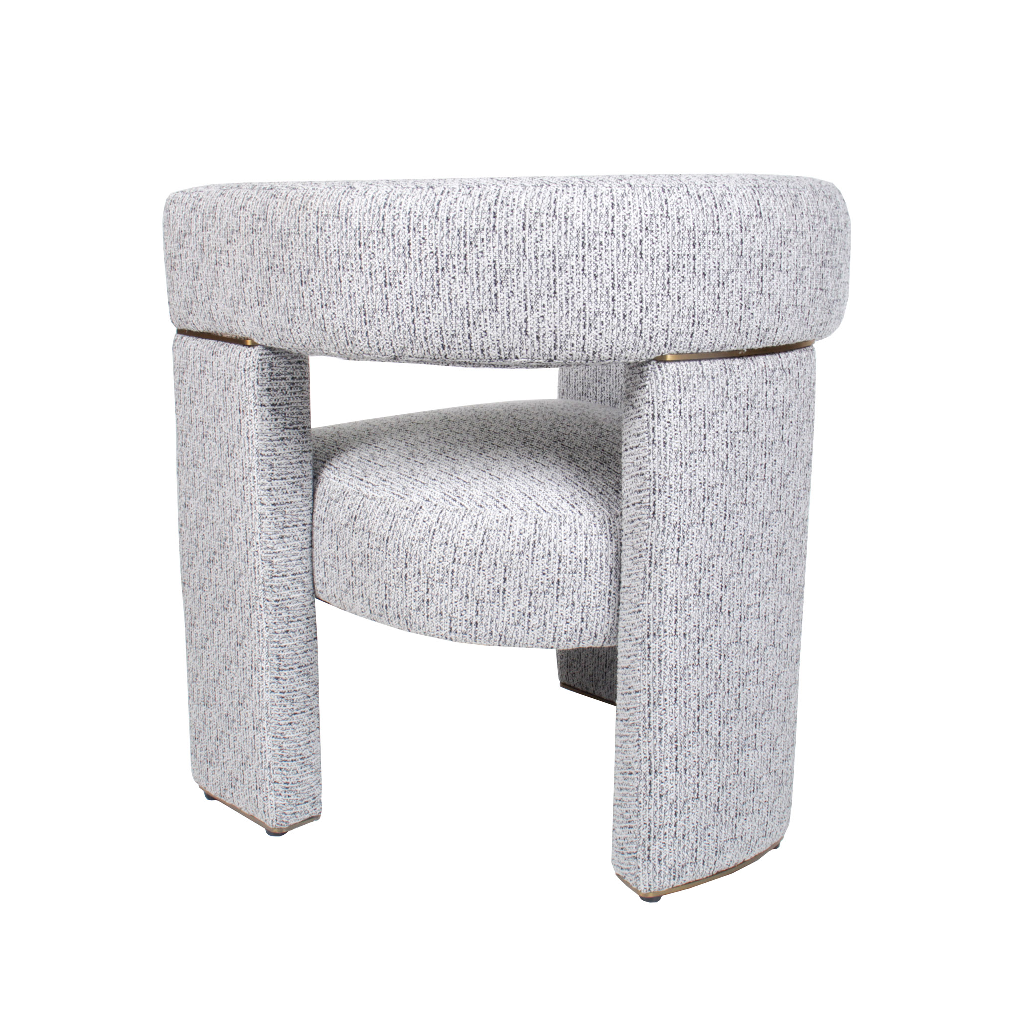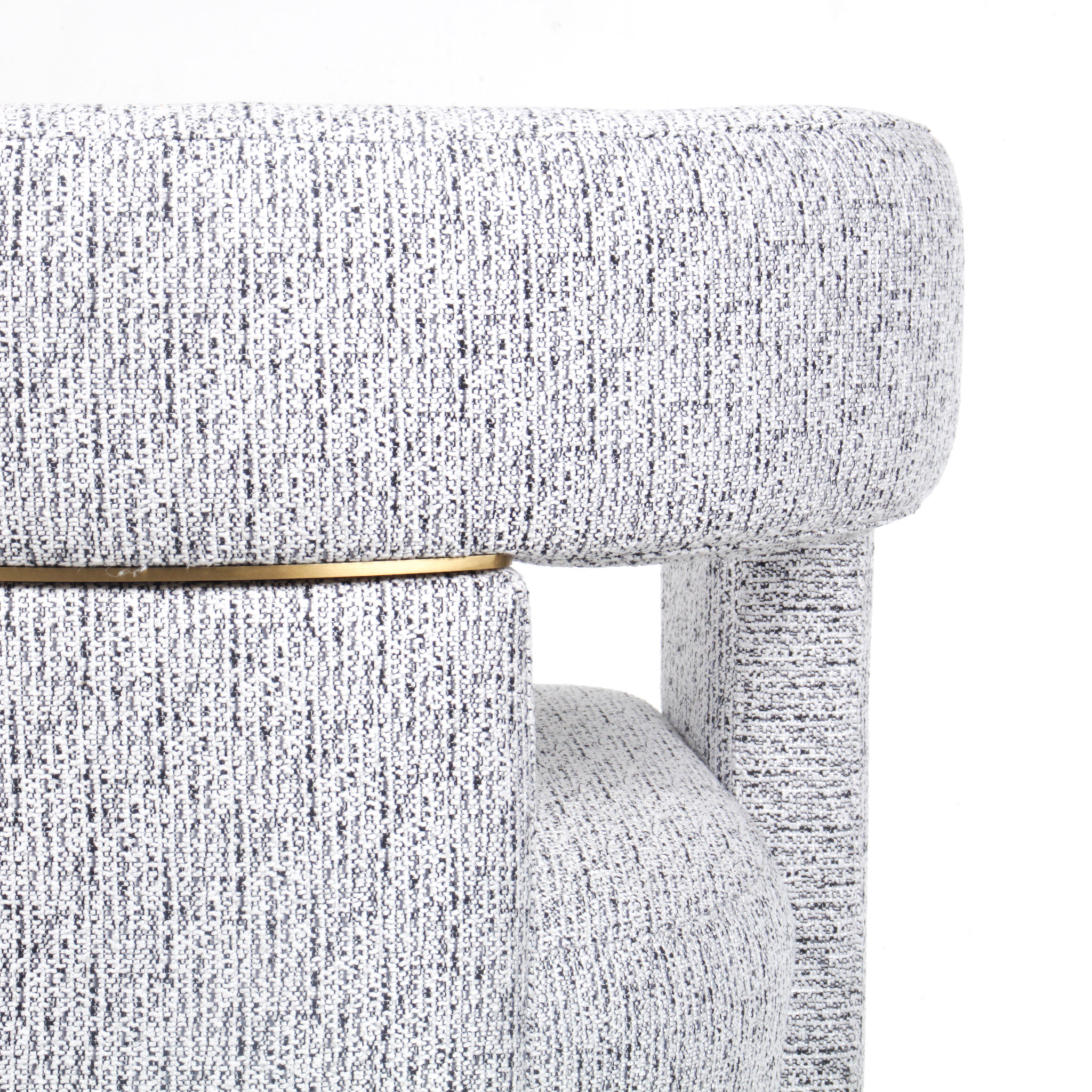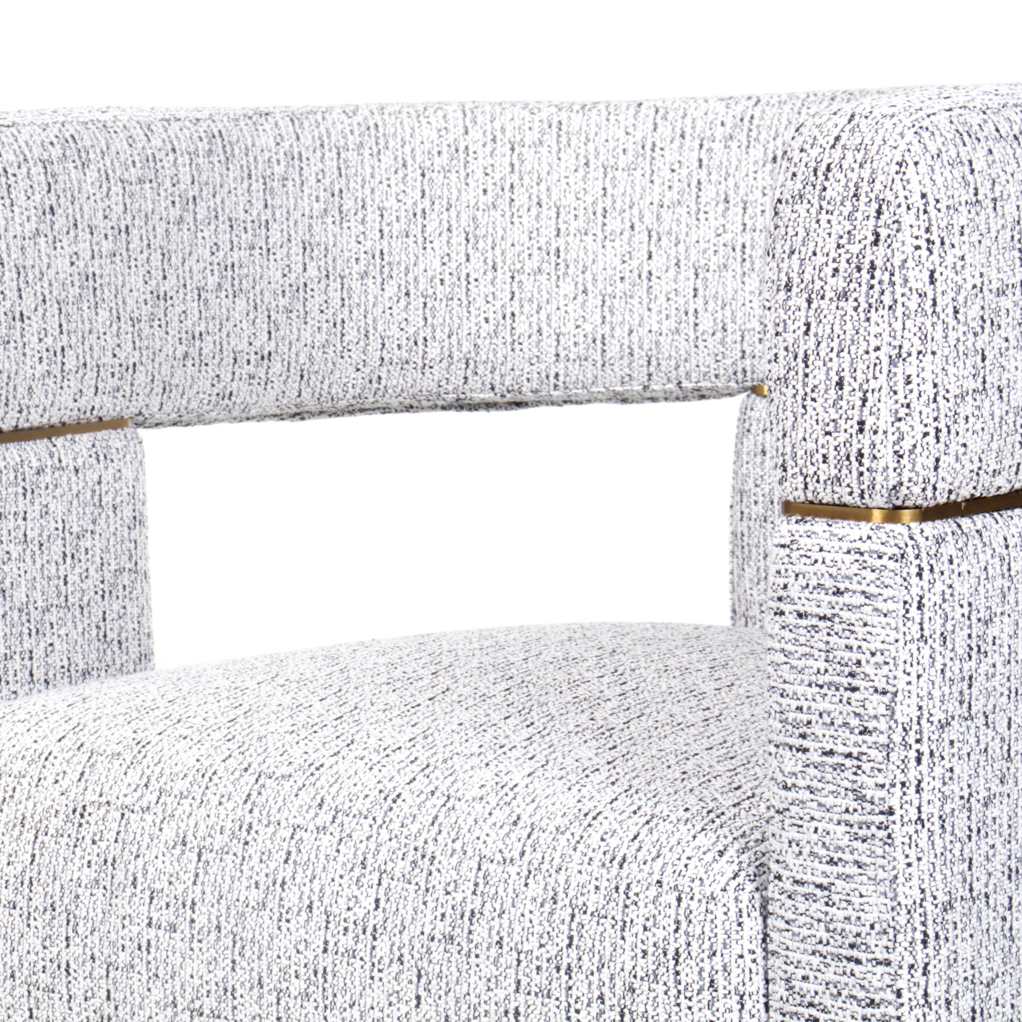 Esta poltrona de tela con hilos en color gris, blanco y negro combina un diseño clásico con un toque moderno. Su contraste de colores aporta sofisticación y versatilidad a cualquier espacio. Perfecta para quienes buscan una pieza estilizada y cómoda.