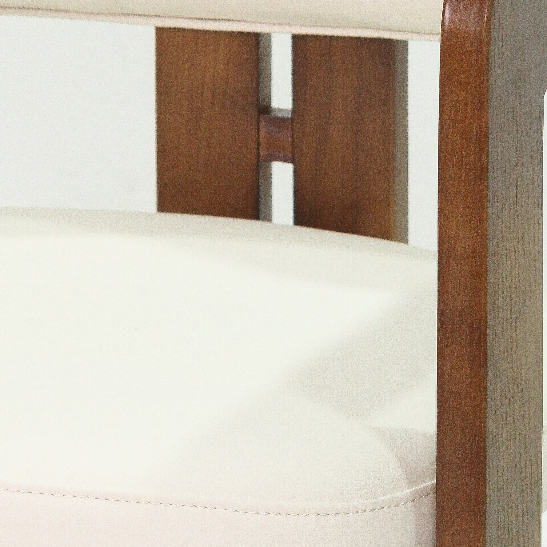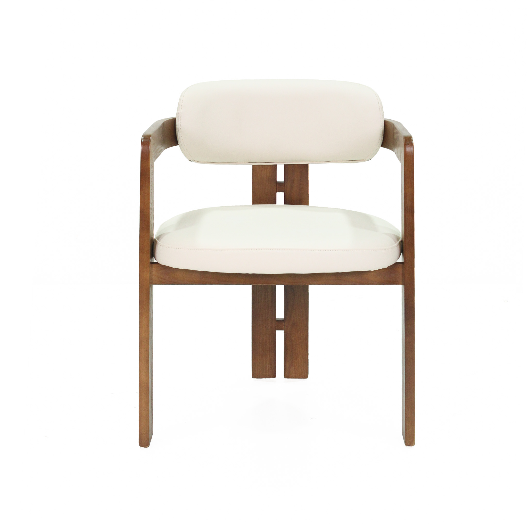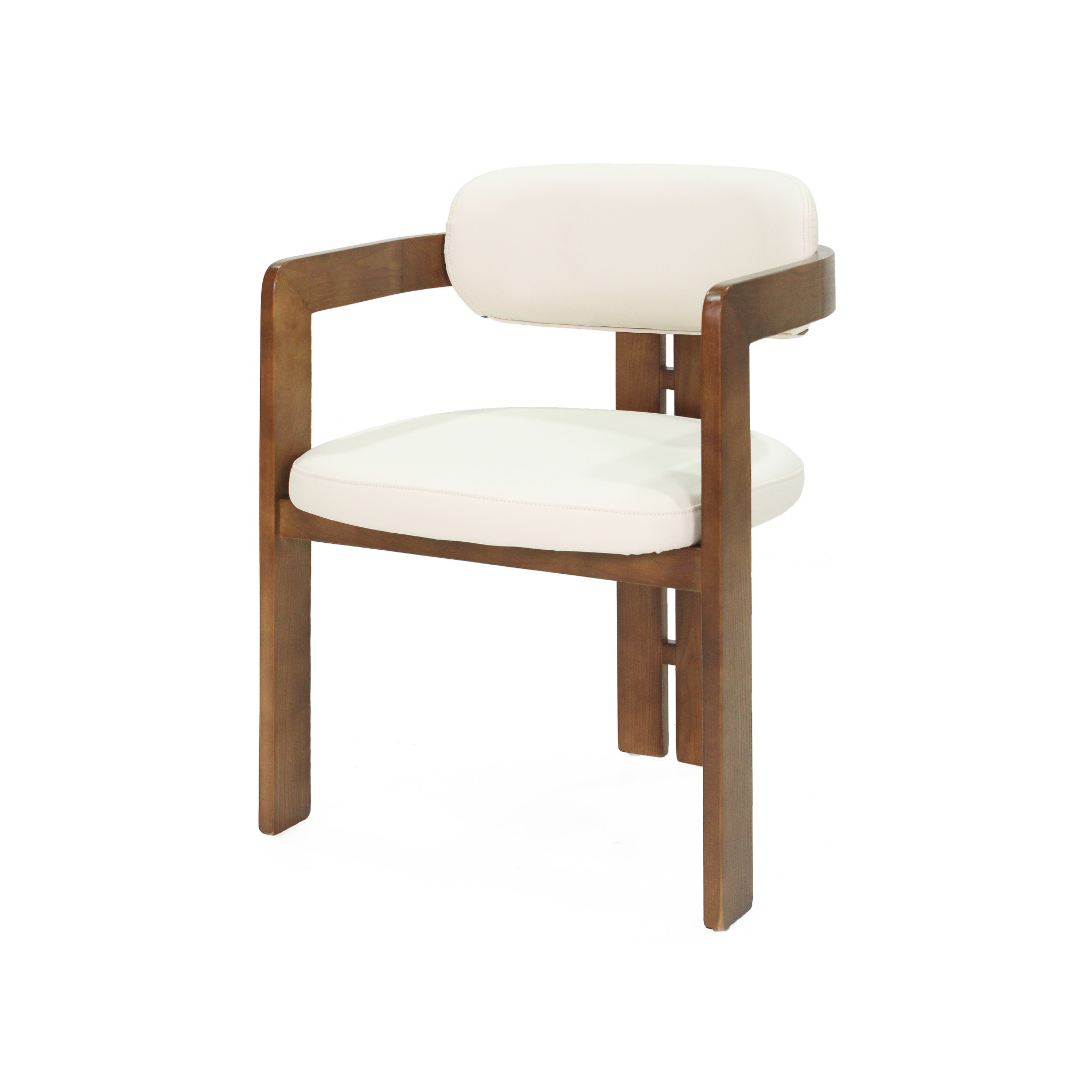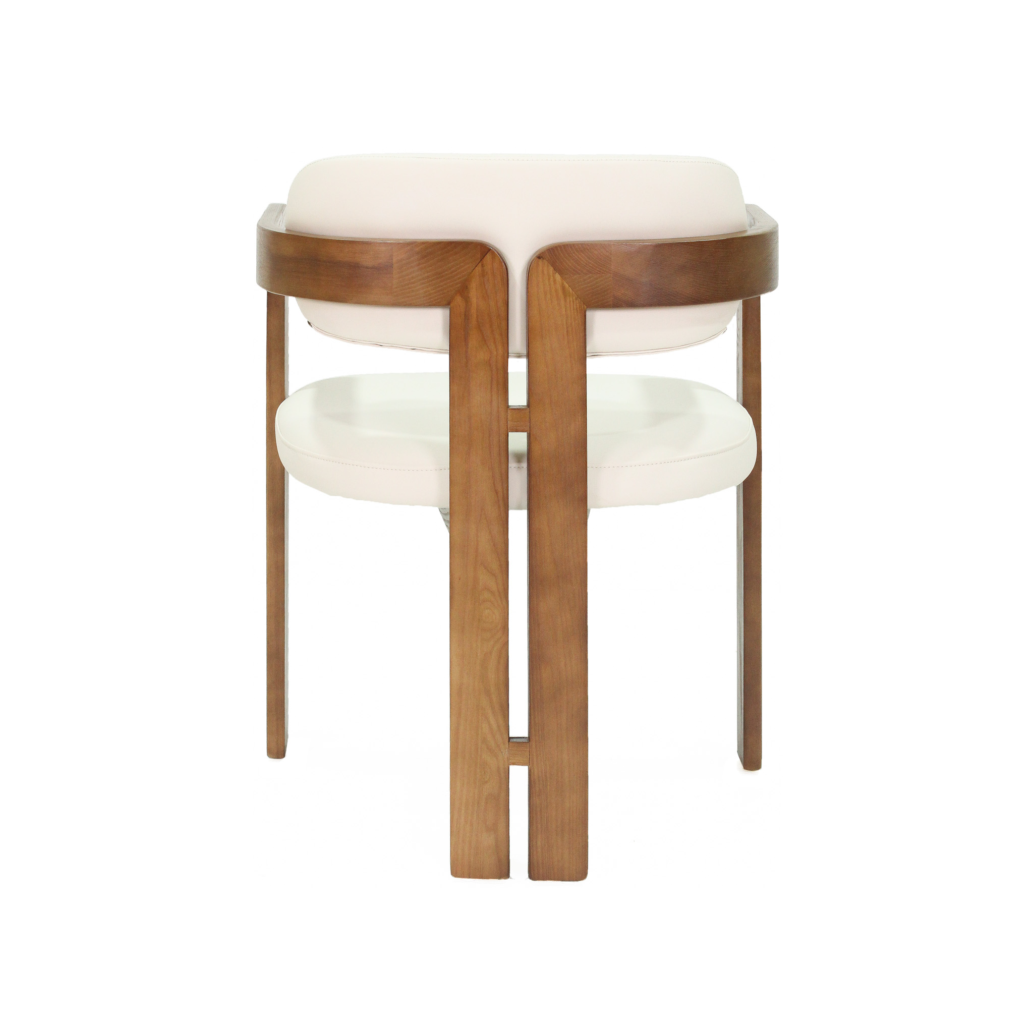 Moderna silla de comedor con respaldo y asiento en cuerina color blanco, y una estructura resistente de madera natural almendra.