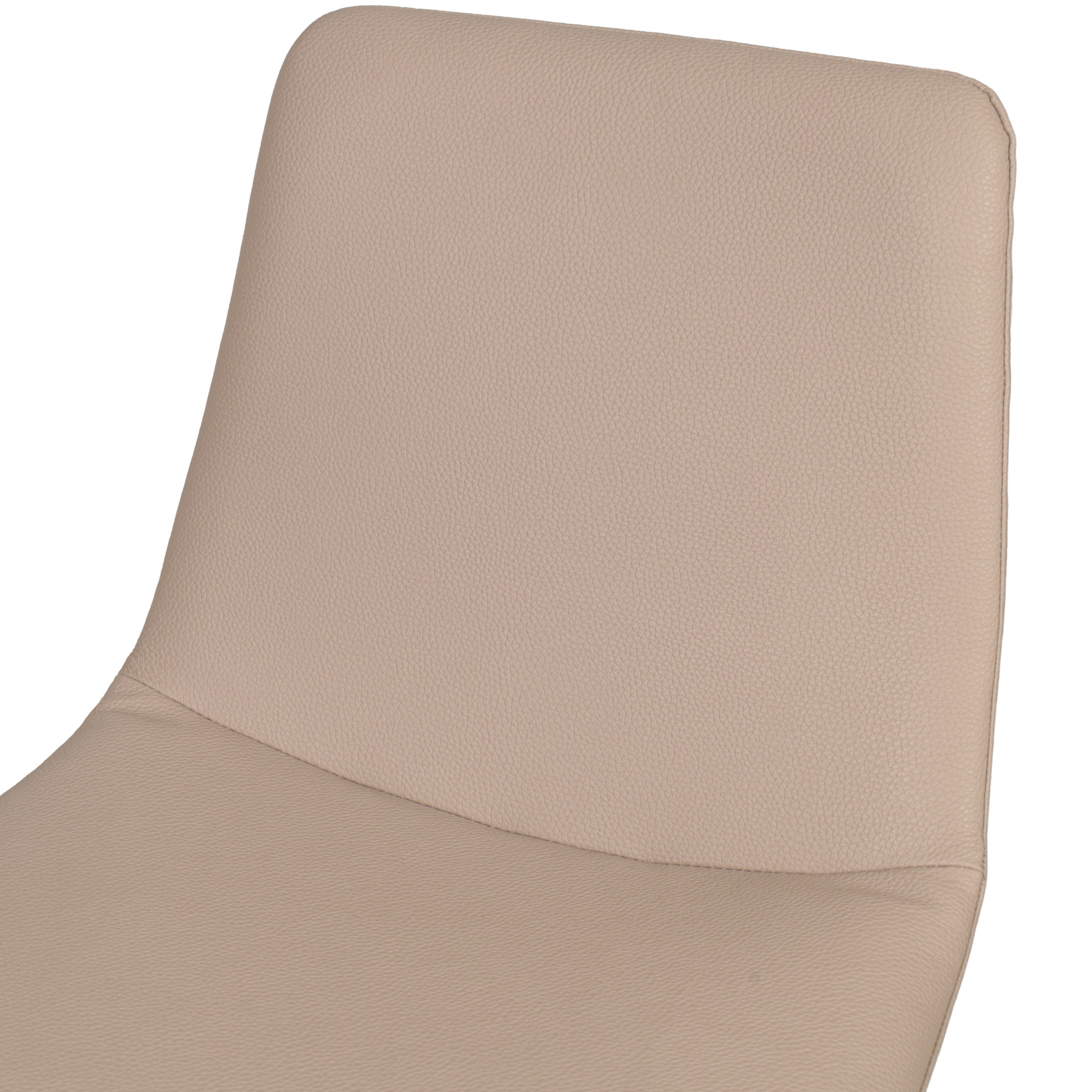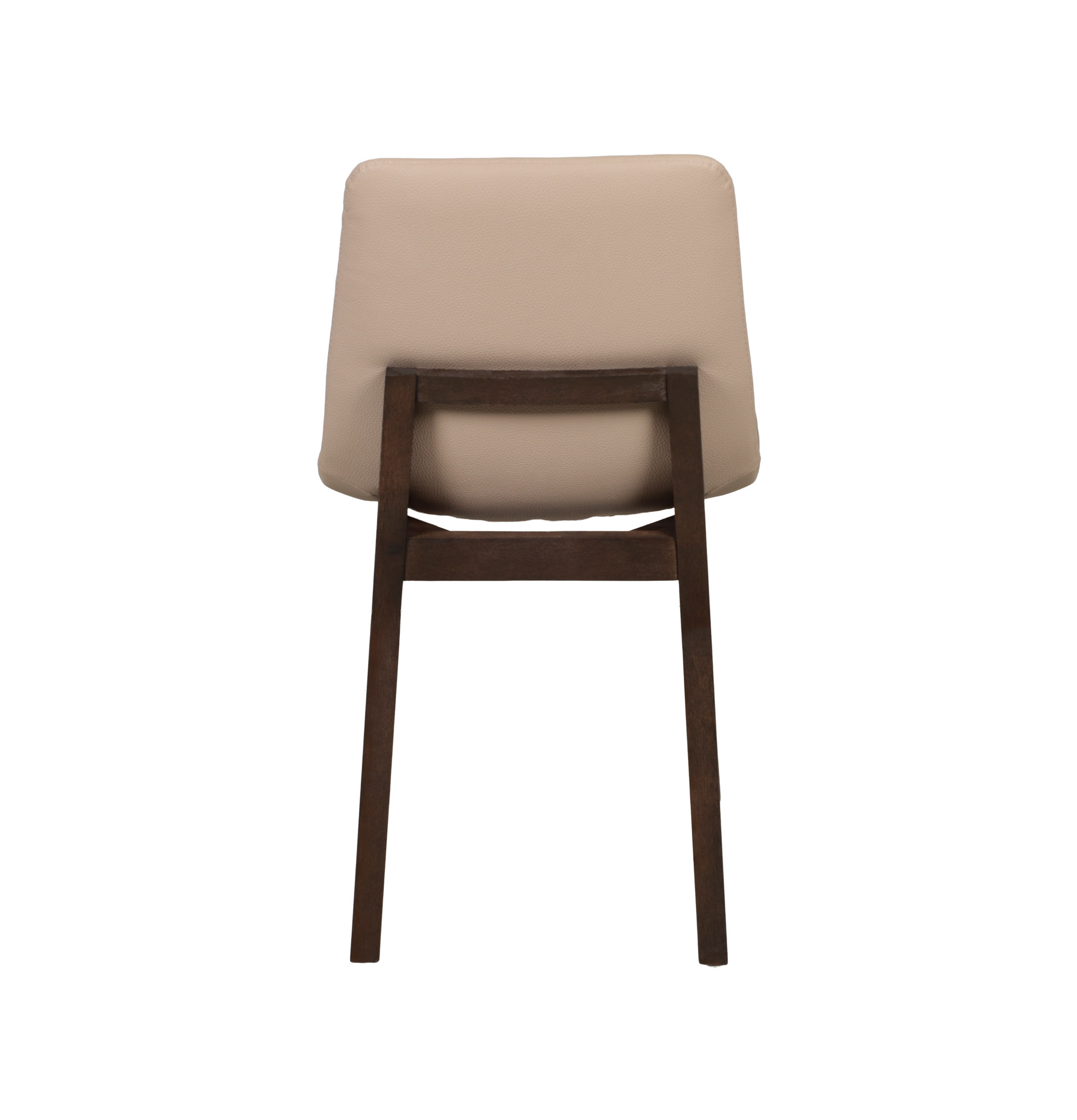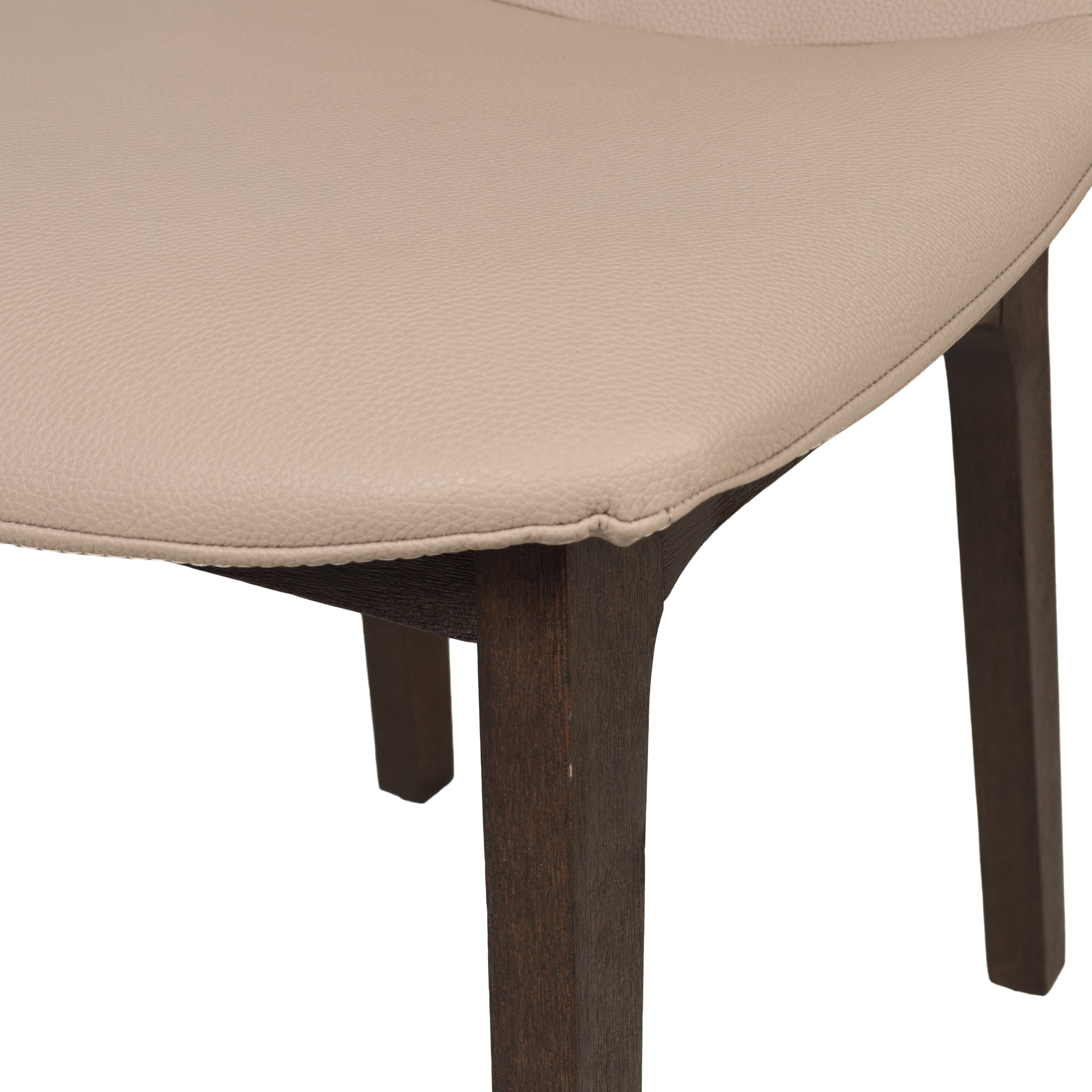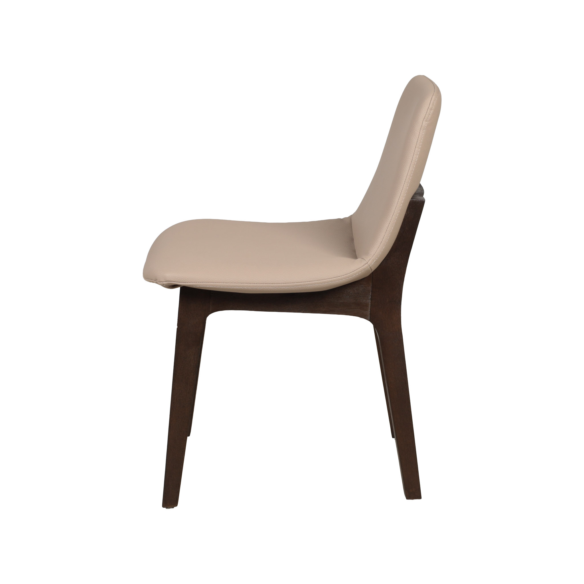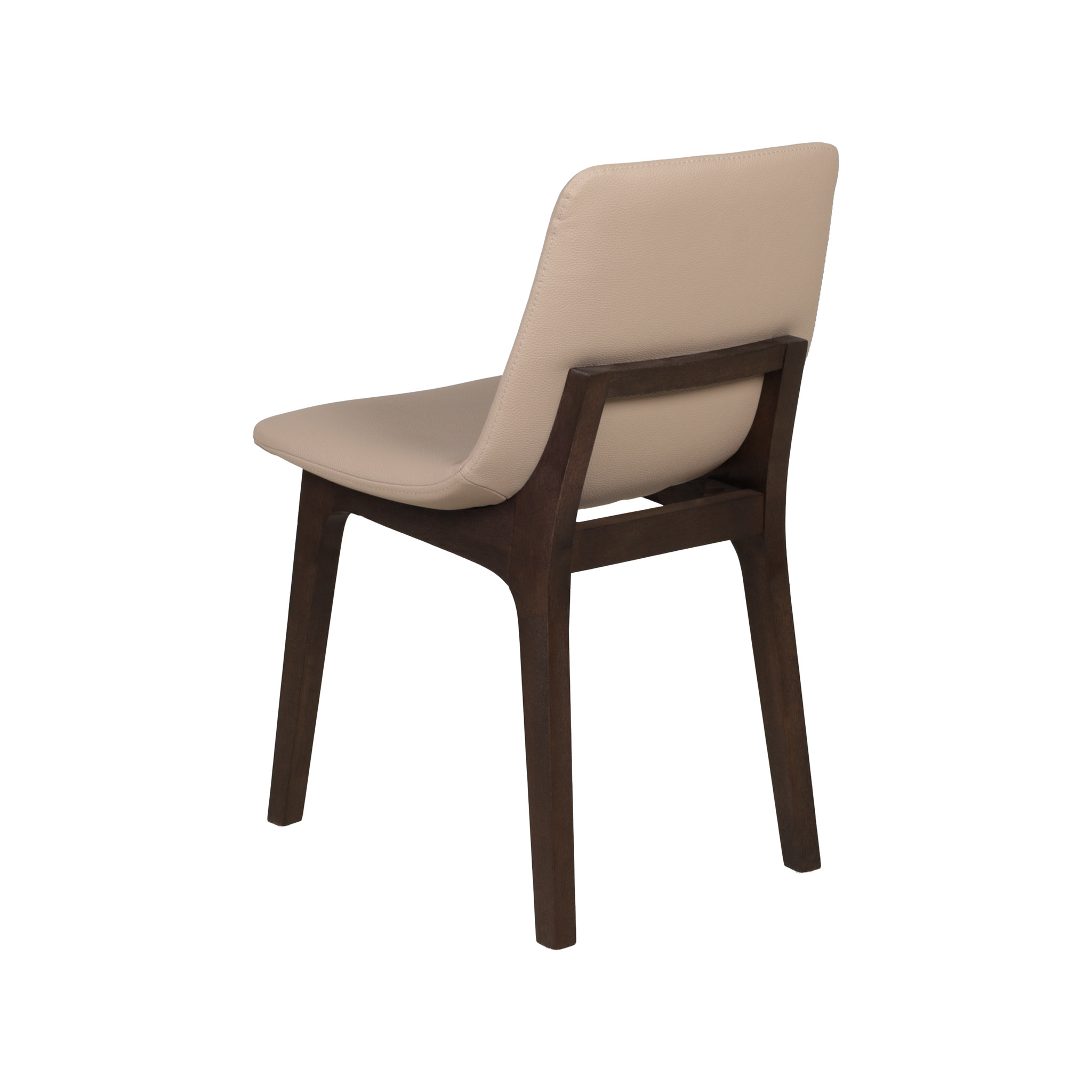 Moderna silla con tapiz de cuerina en tono beige, y patas de madera chocolate oscuro.