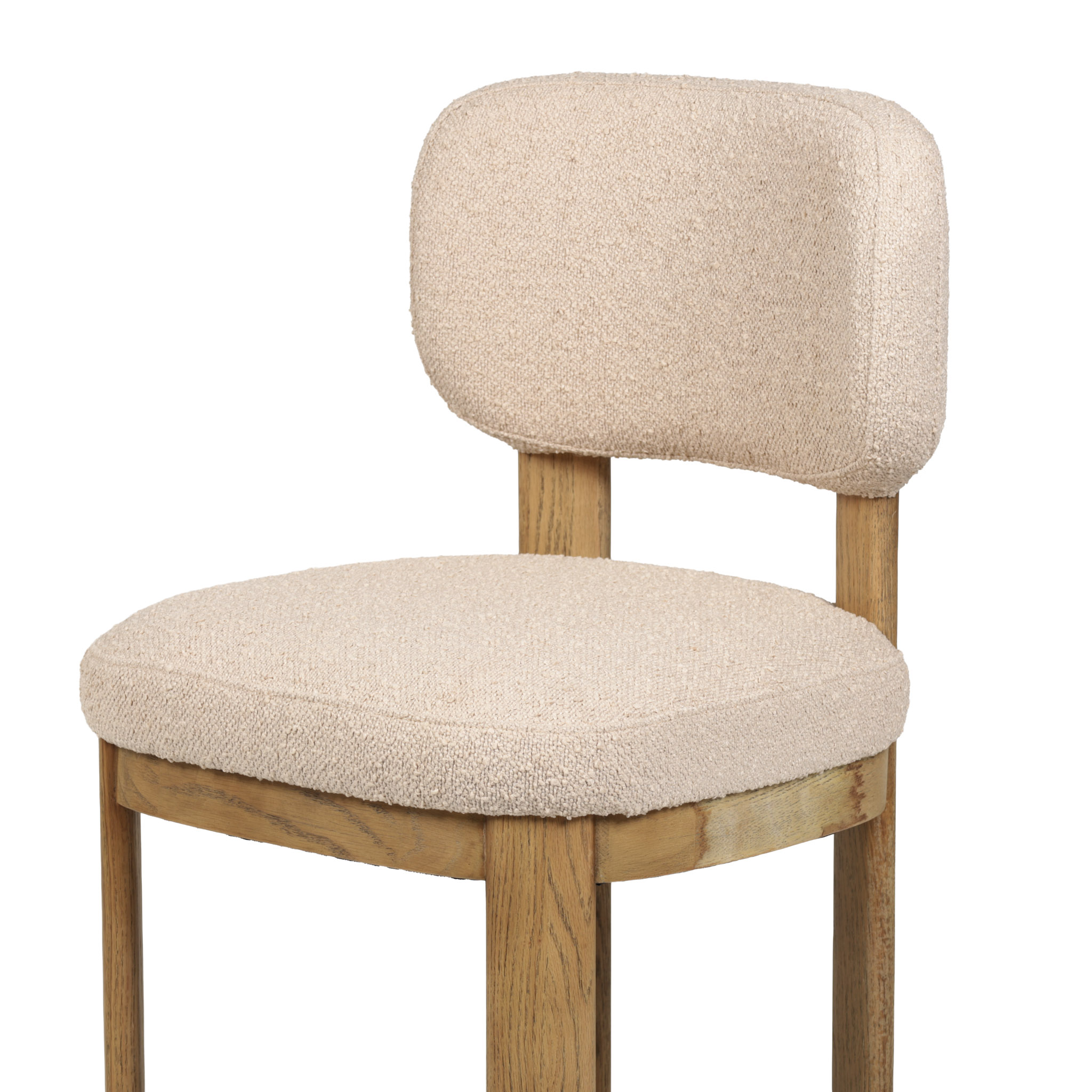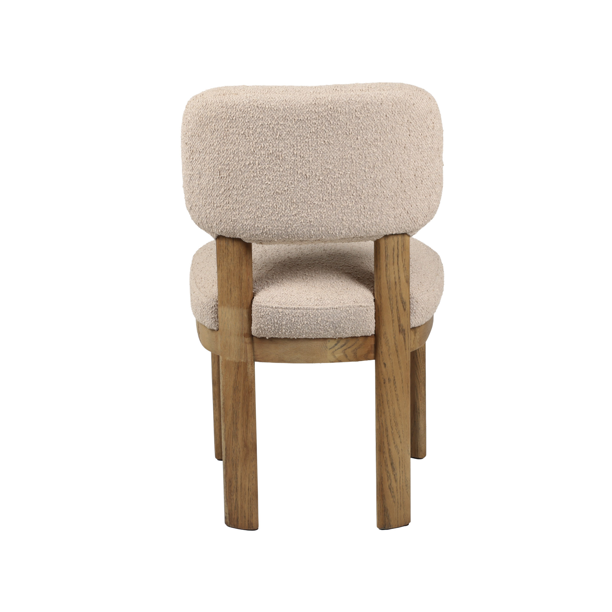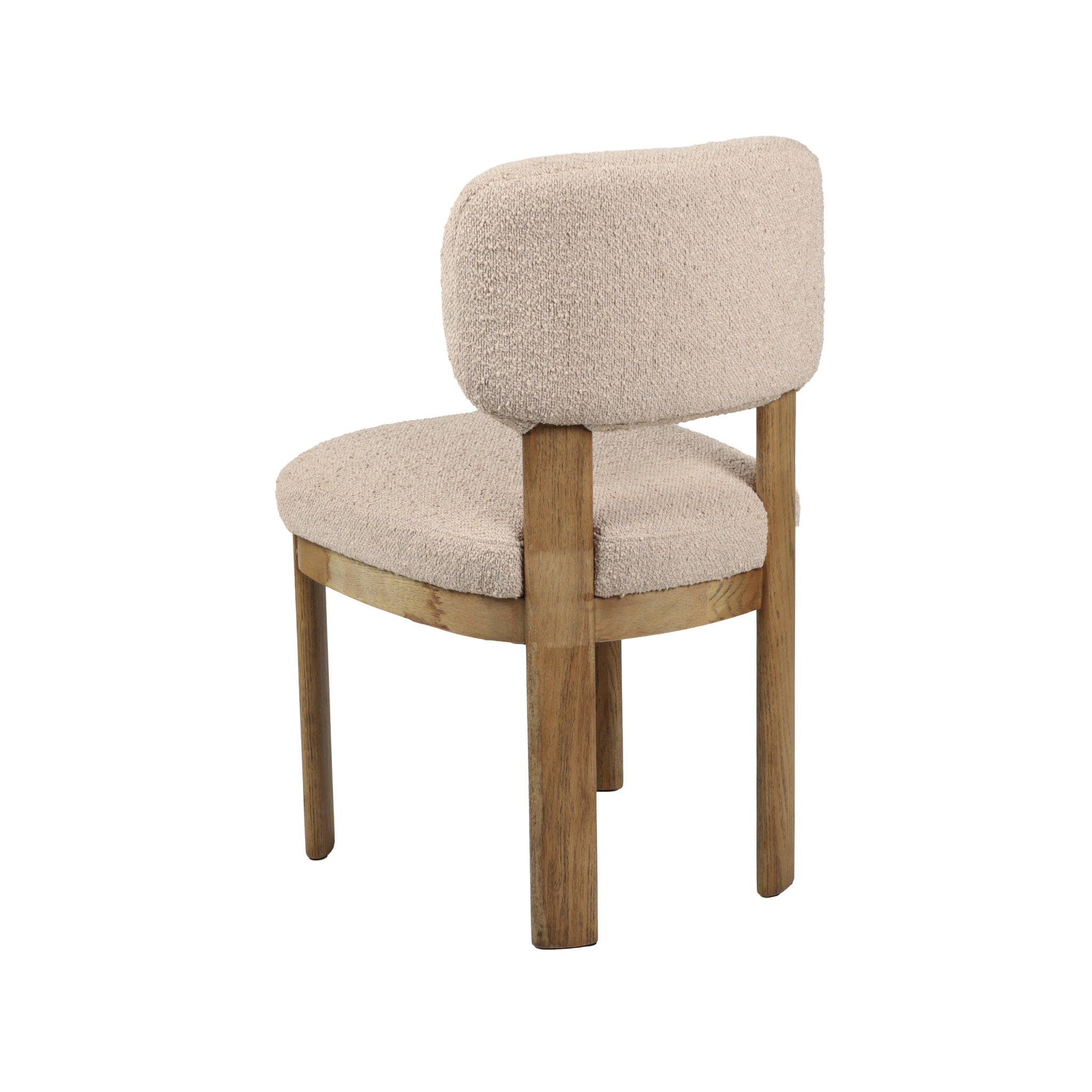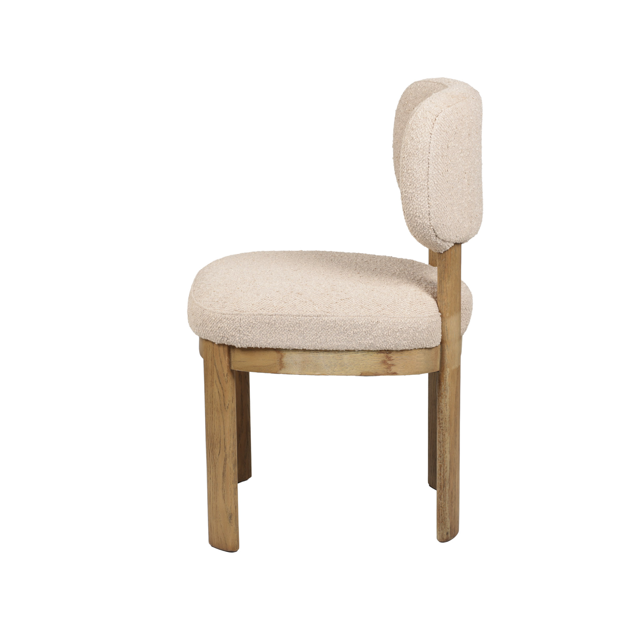 Moderna silla de comedor con asiento y respaldar de tela en tono beige, y patas de madera natural.