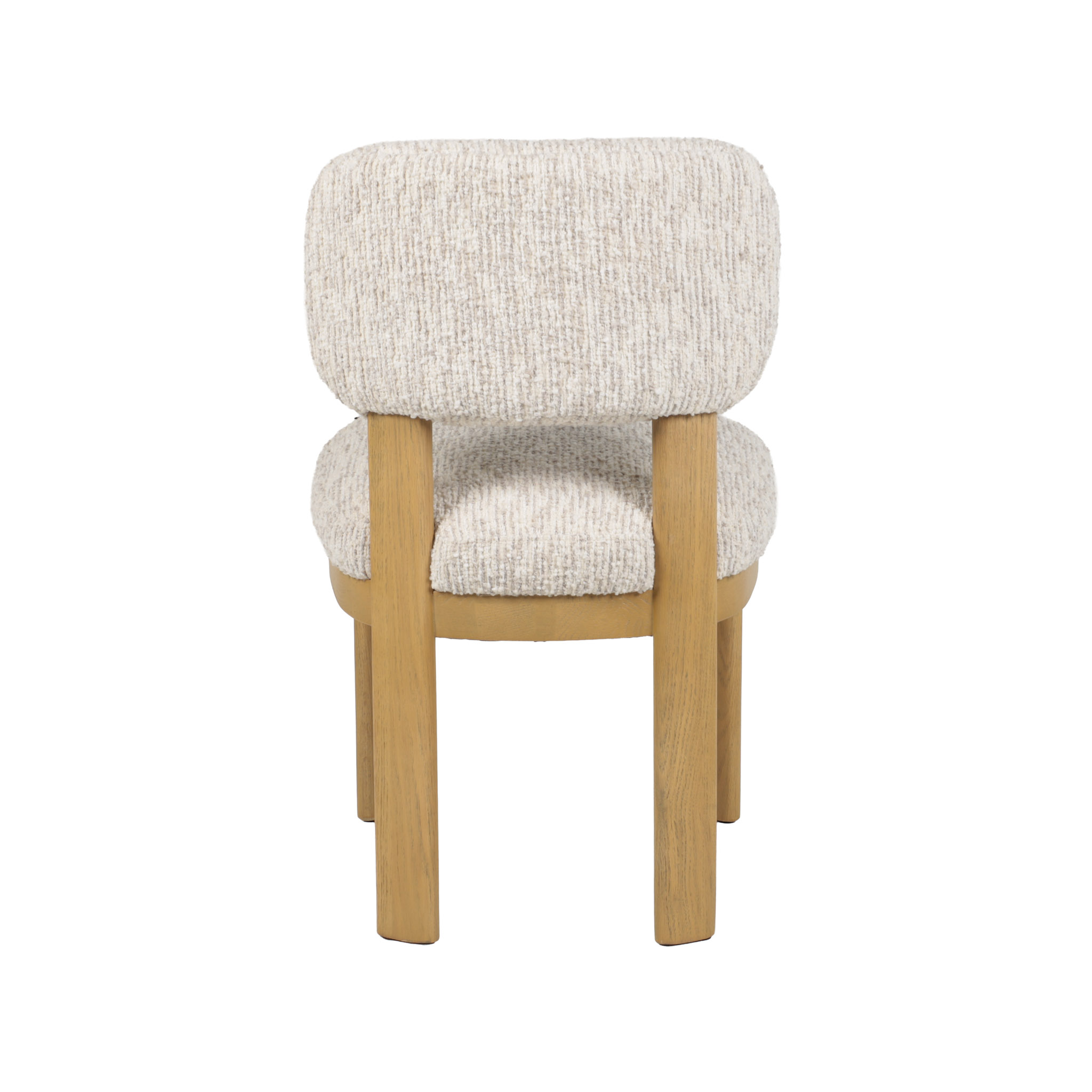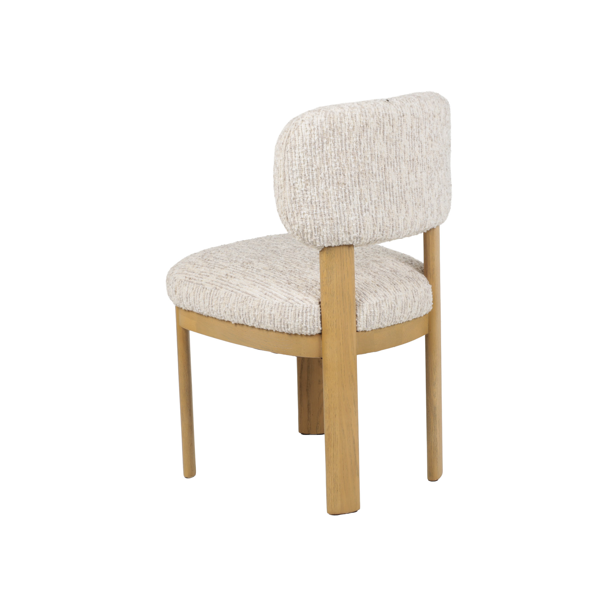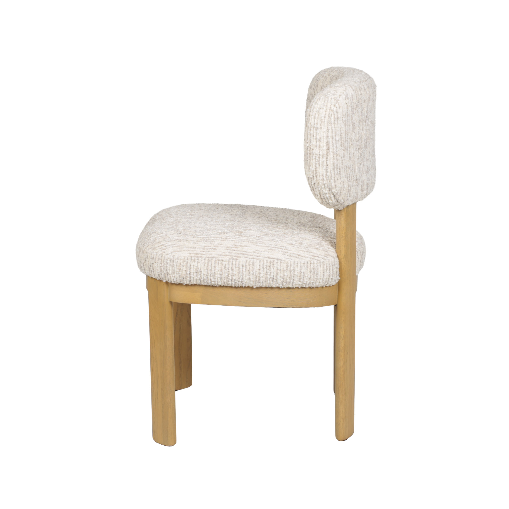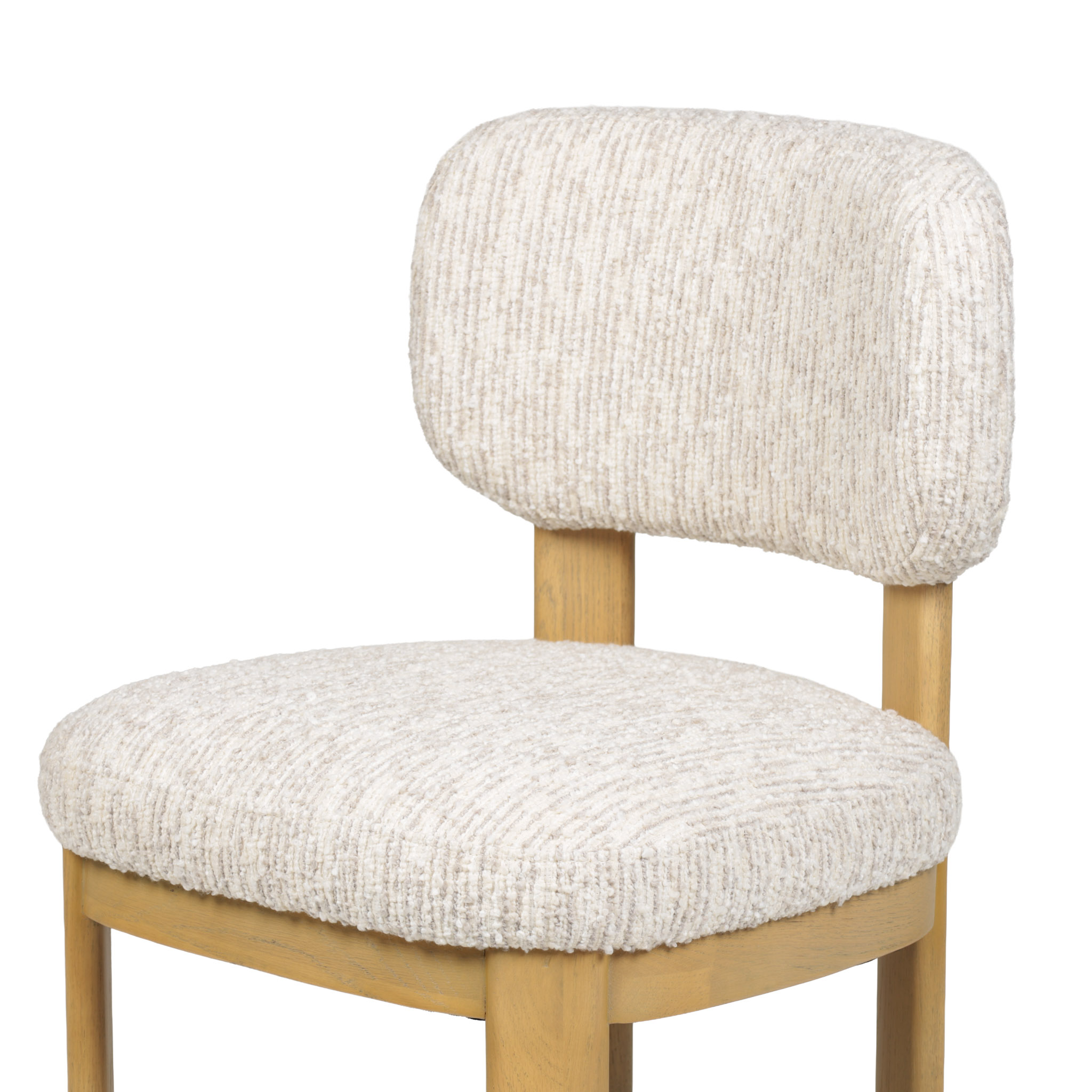 Moderna silla de comedor con asiento y respaldar de tela en tono ivory, y patas de madera natural.