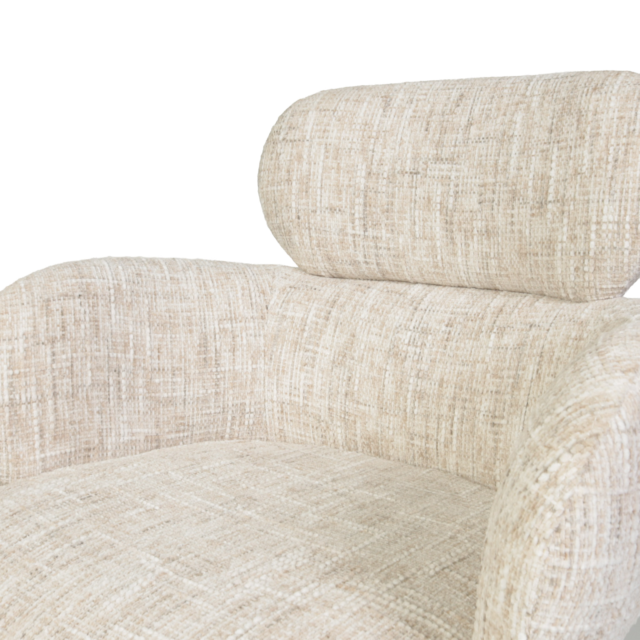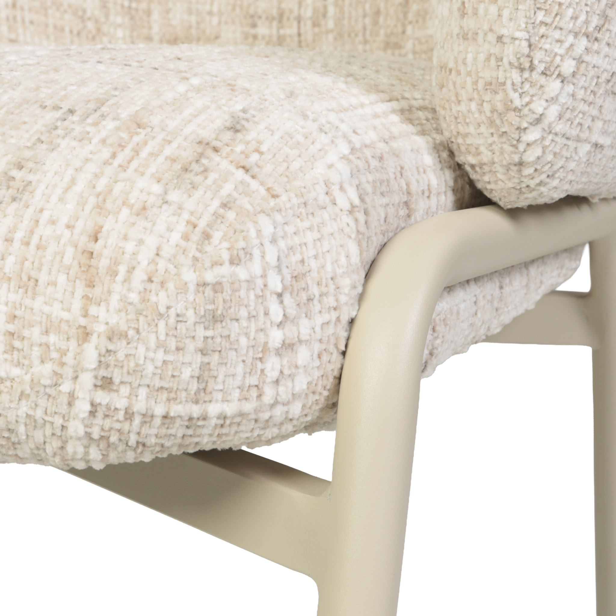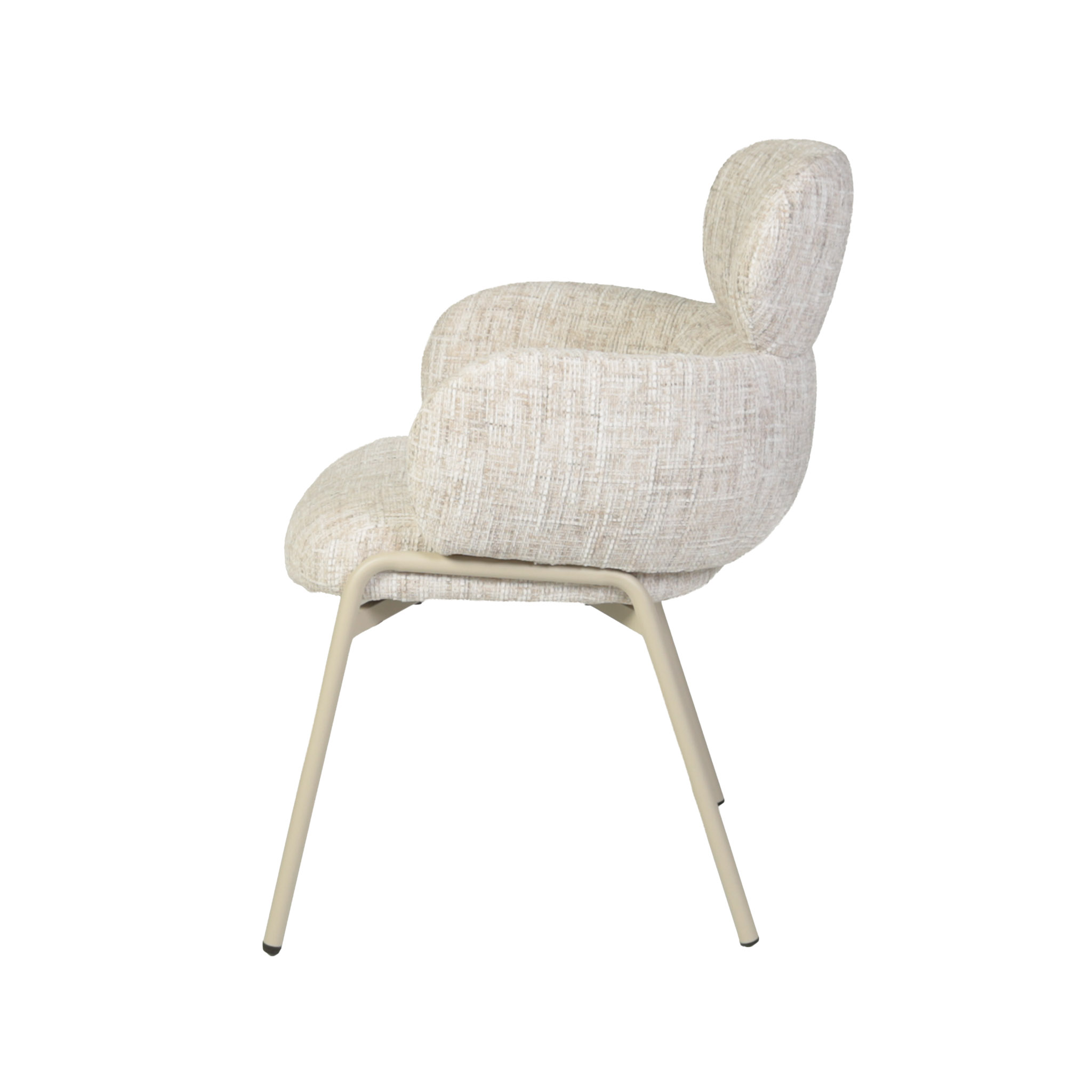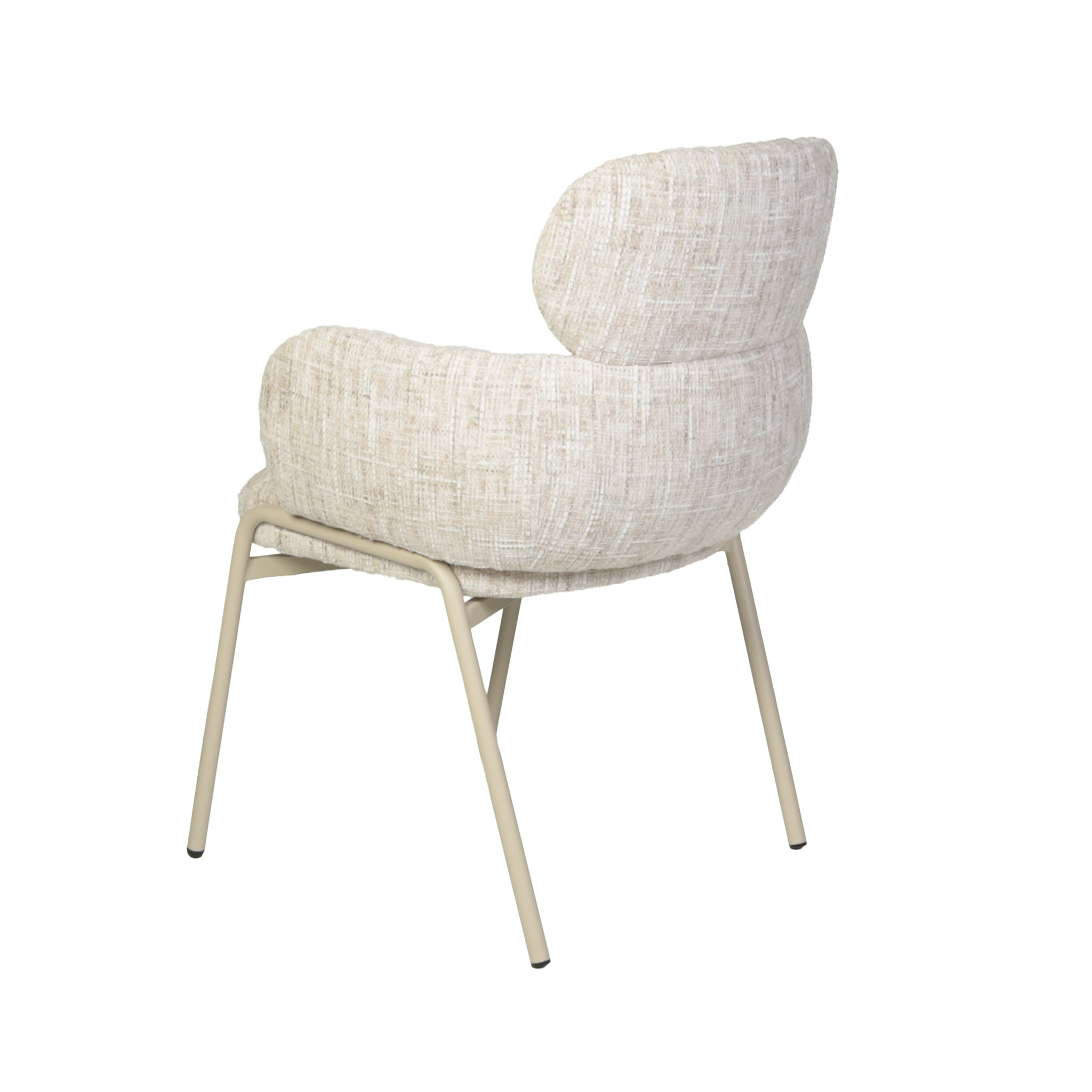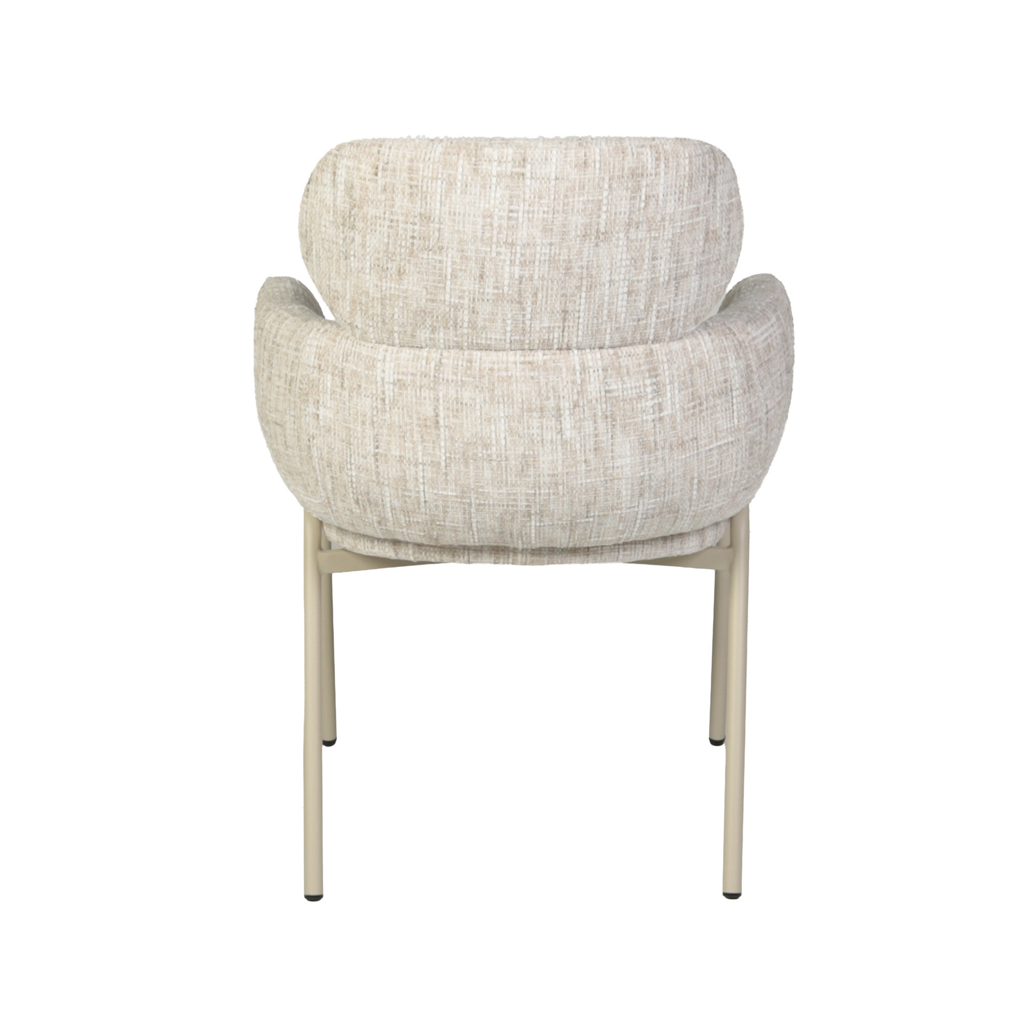 Silla de comedor con asiento de tela en color beige con hilos blancos, y con patas de metal beige.