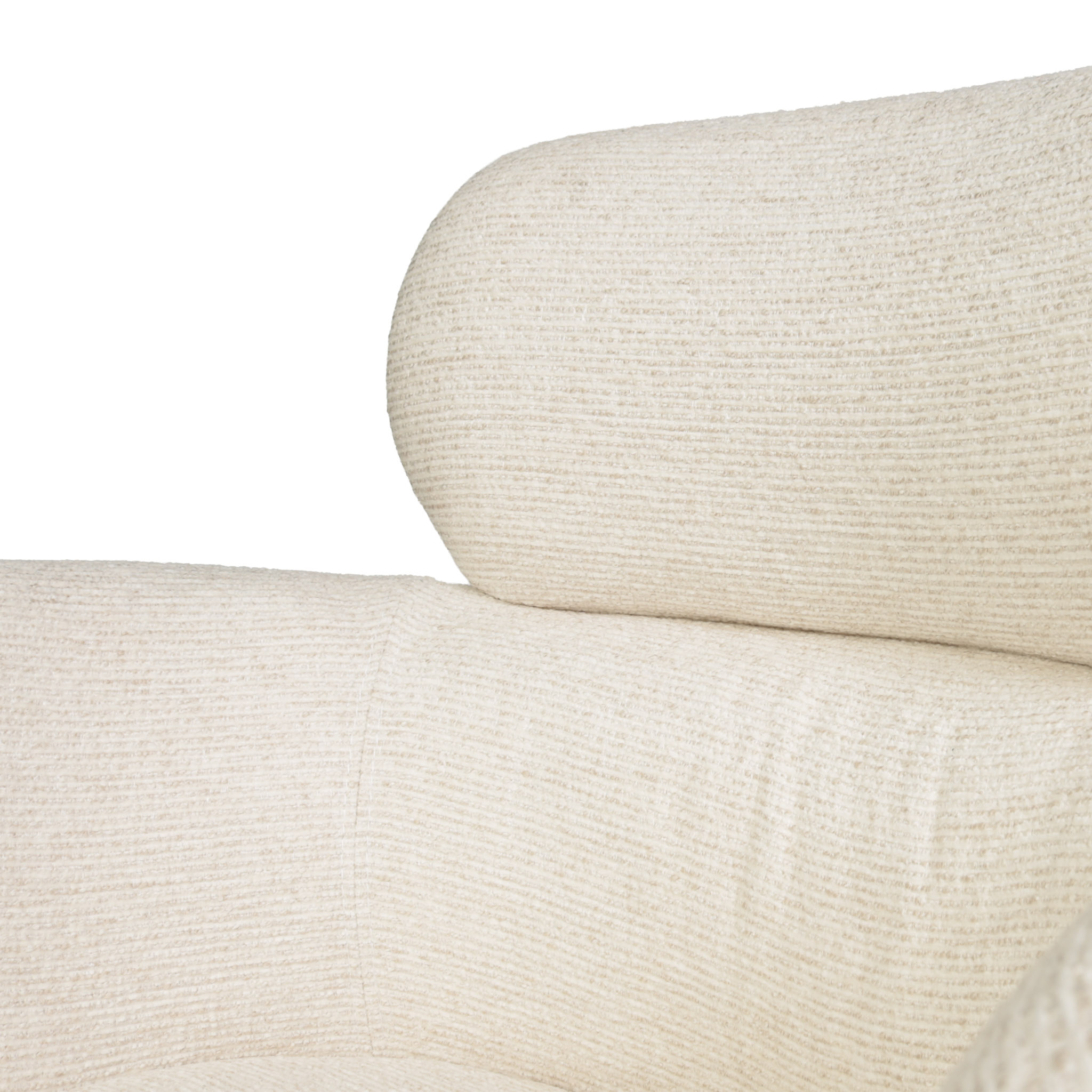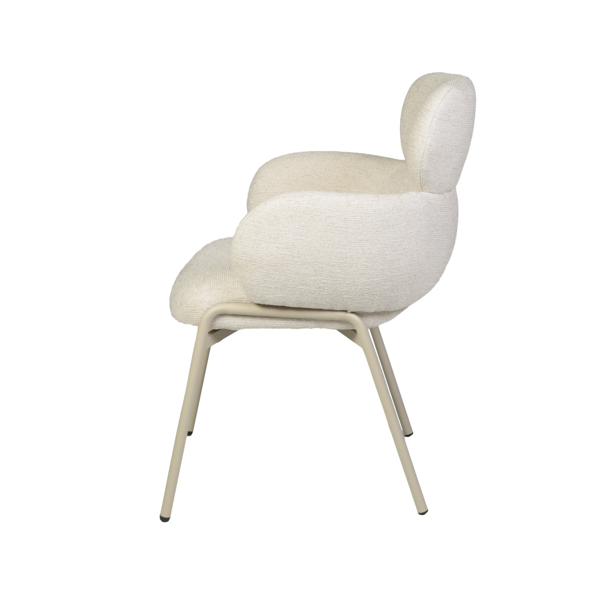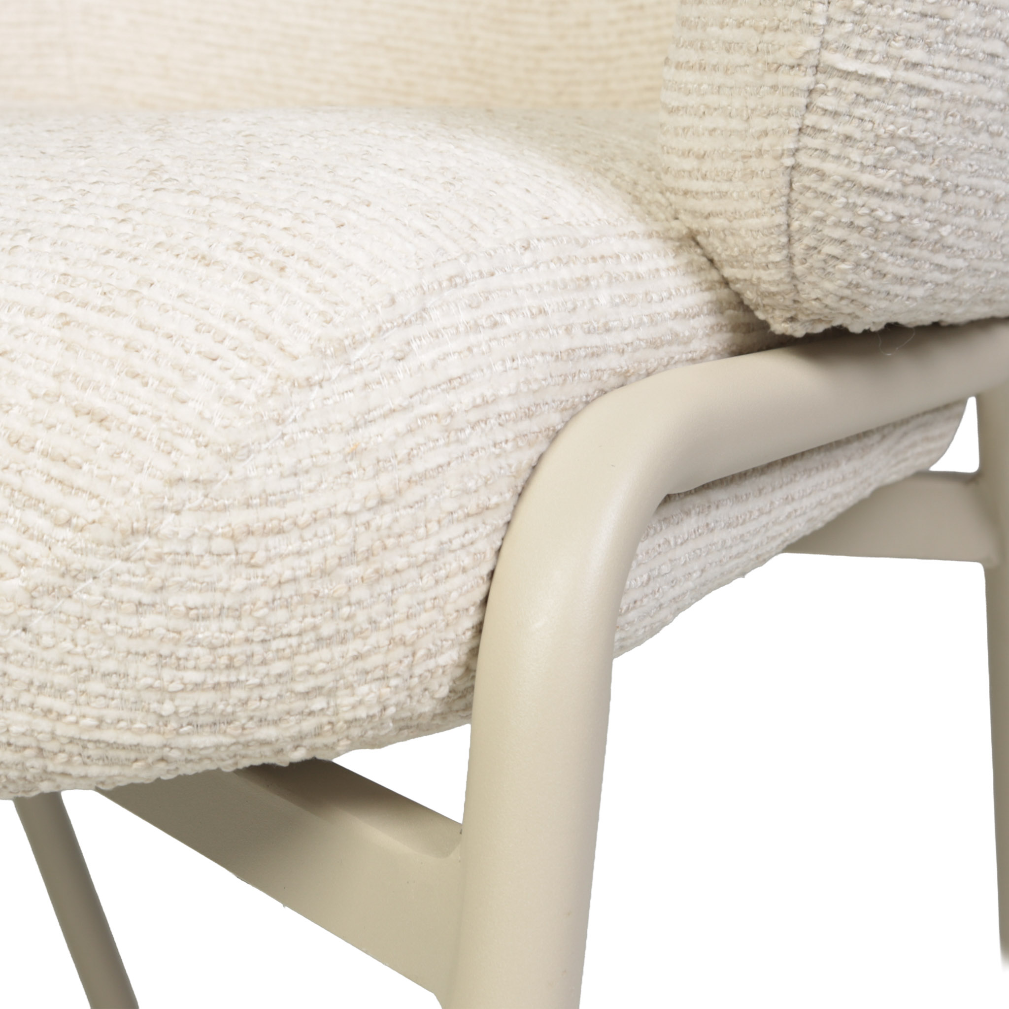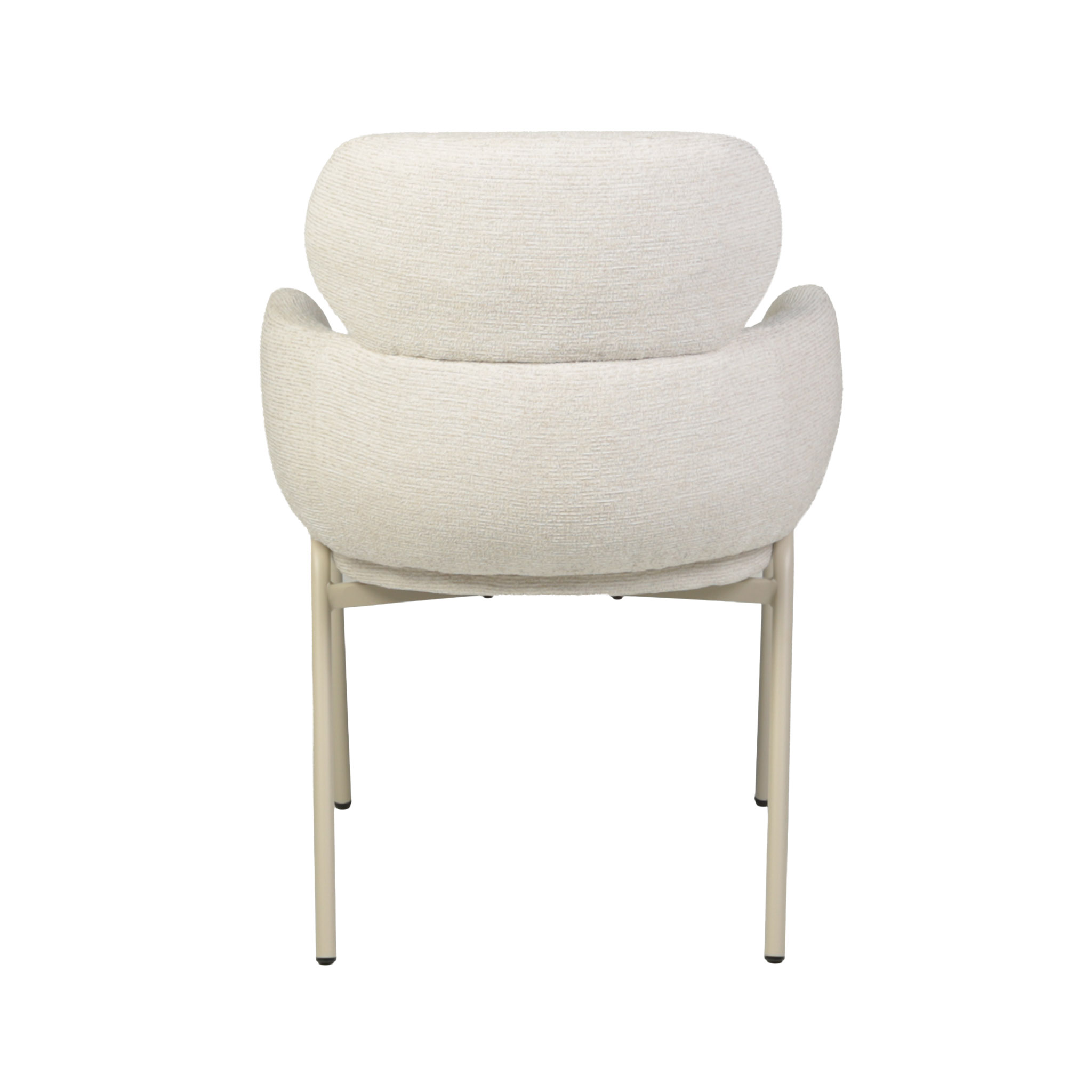 Silla de comedor con asiento de tela en color crema claro con hilos beige, y patas de metal beige.